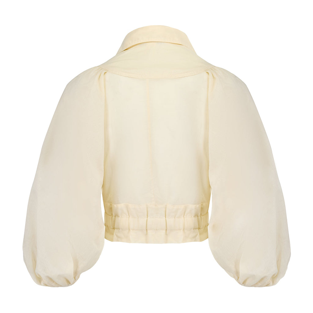 1970s Jeff Banks Cream Bell-Sleeve Crop Top with Drawstring Waist