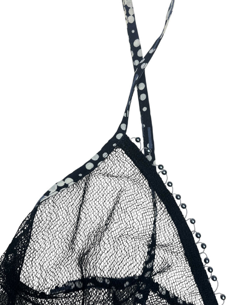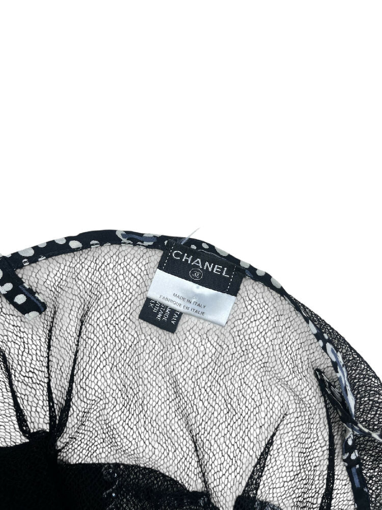 Dainty Chanel camisole, as seen on the runway from the FW2002 collection by Karl Lagerfeld. This beautiful top features a polkadot trim with additional faux pearl beading across the chest. Details also include classic Chanel ‘CC’ logos sewn into the straps.