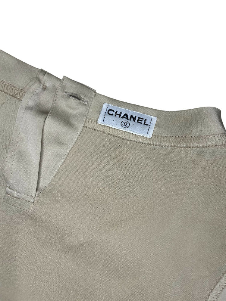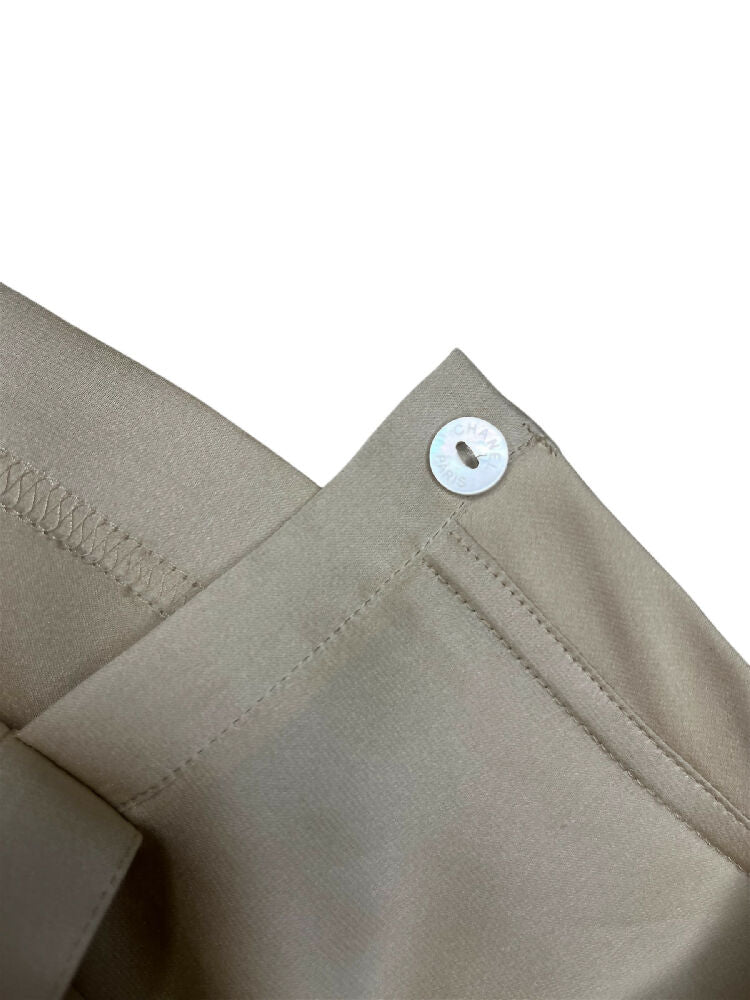 Beautiful champagne-tone silk sleeveless top by Chanel, c. 1980s. Featuring a classic ‘Chanel Paris’ logo embellished buttons cascading down at the back, this quietly luxurious piece is a staple for your vintage wardrobe.
