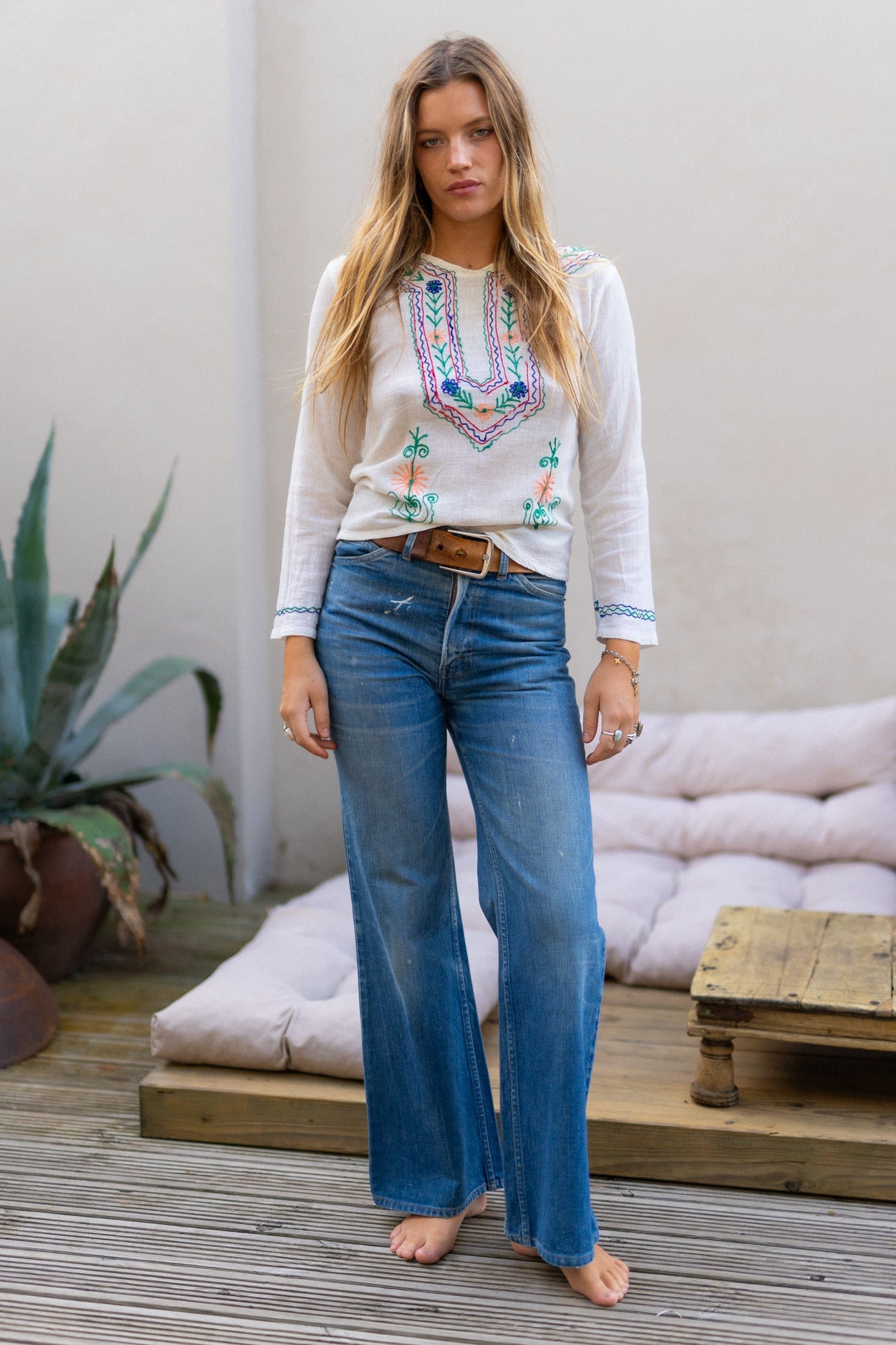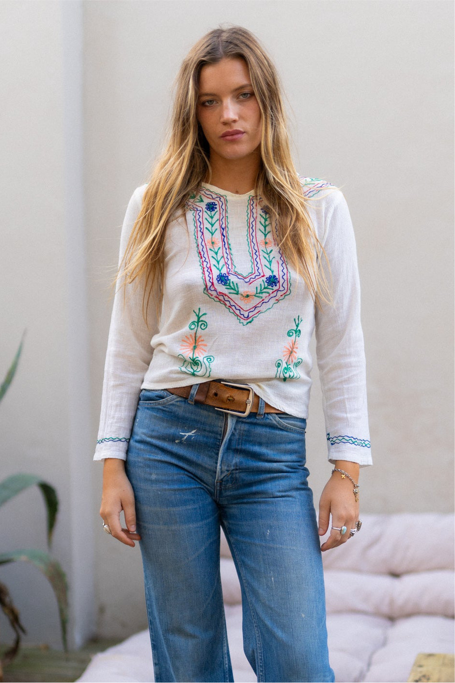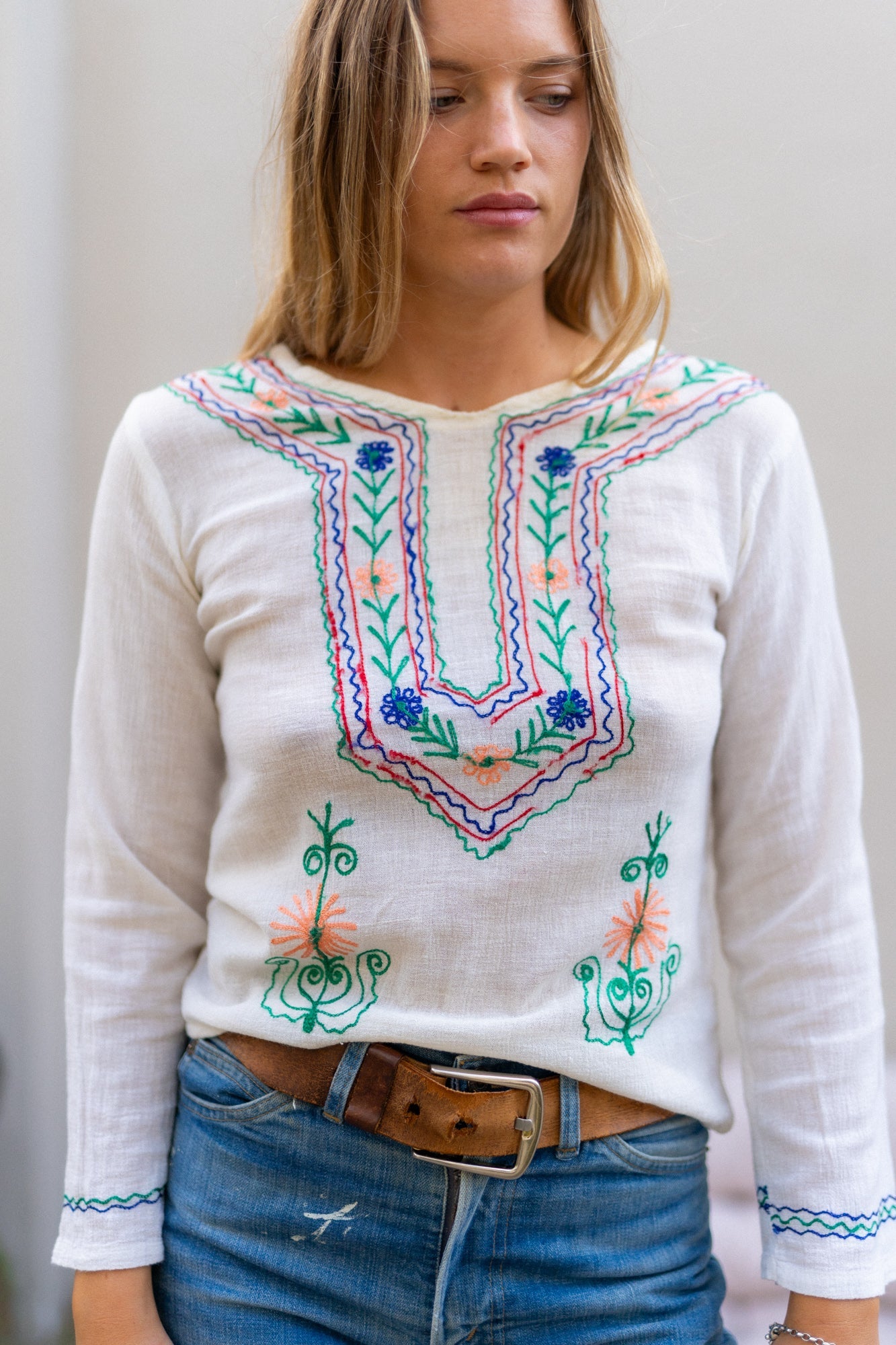 LATE 1960S CHEESECLOTH TOP. FEATURING SURFAC EMBROIDERY, V NECKLINE AND LONG SLEEVES.