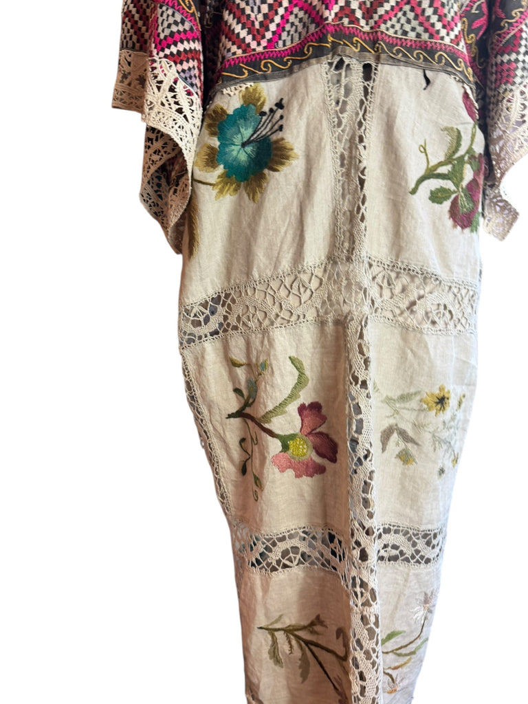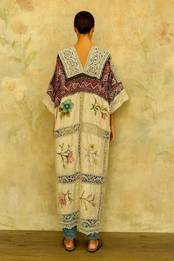 Transform your wardrobe with our Hermione top and coat combo. Made from an antique Rajasthan embroidered top and Victorian lace, this one-of-a-kind piece features a V-neck and delicate traditional French floral embroidery. The discreet hook and black silk ribbon add a touch of elegance. Perfect for pairing with denim or a dress.