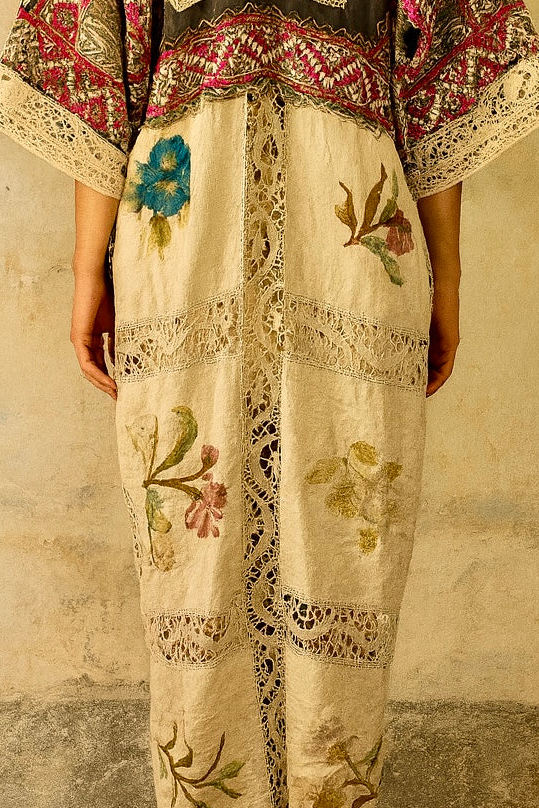 Hermione, reworked antique Rhajastani embroidered top and Victorian embroidered lace coat