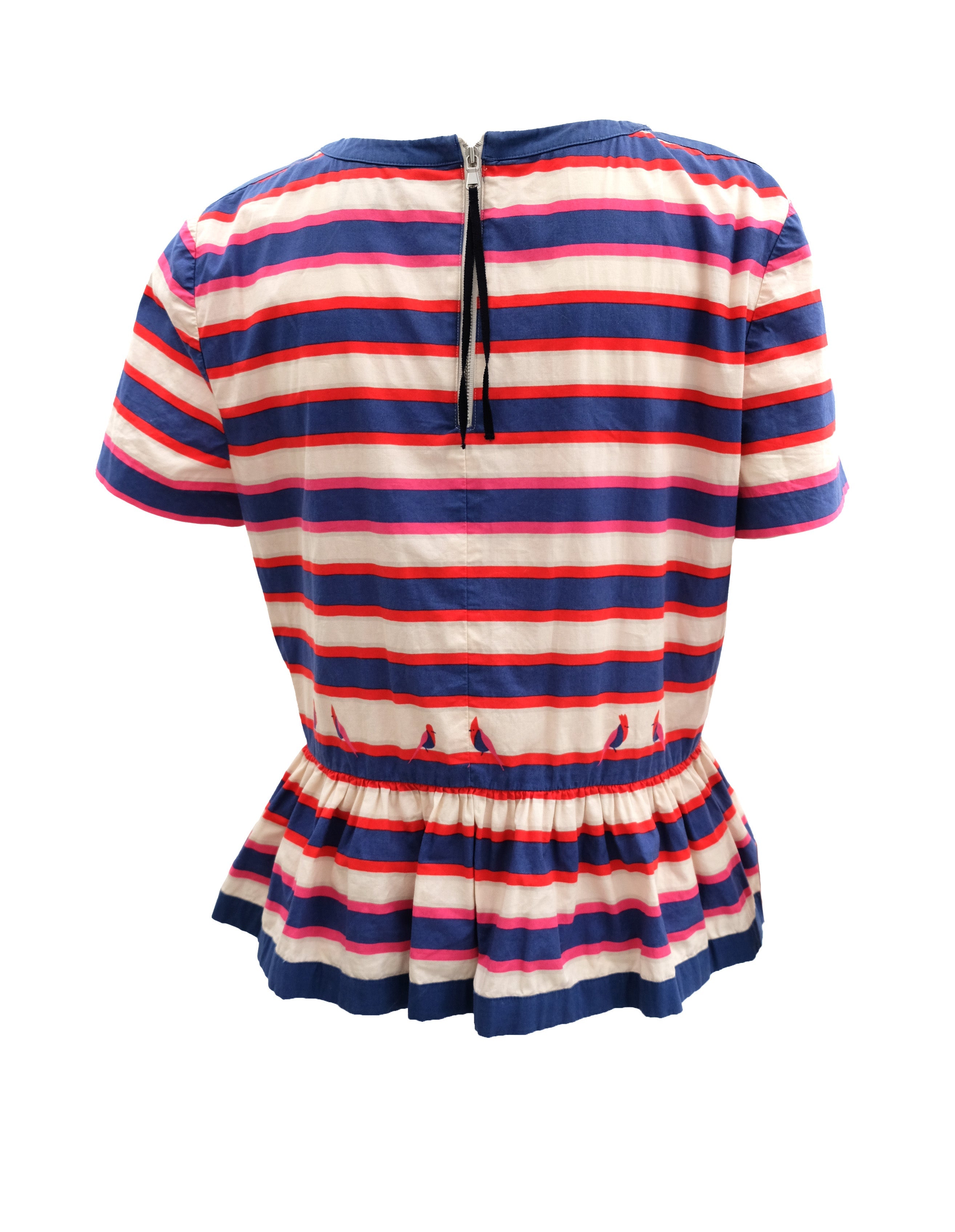 A super cute top by Marc Jacobs, 2000s, in jaunty horizontal stripes of red, white blue and magenta, with little matching parakeets sitting on a waist high stripe.