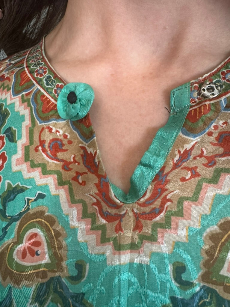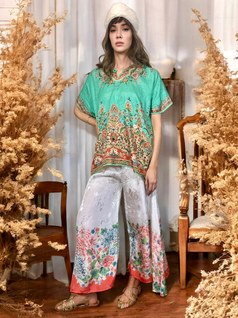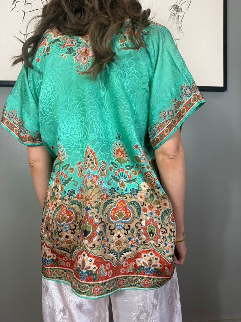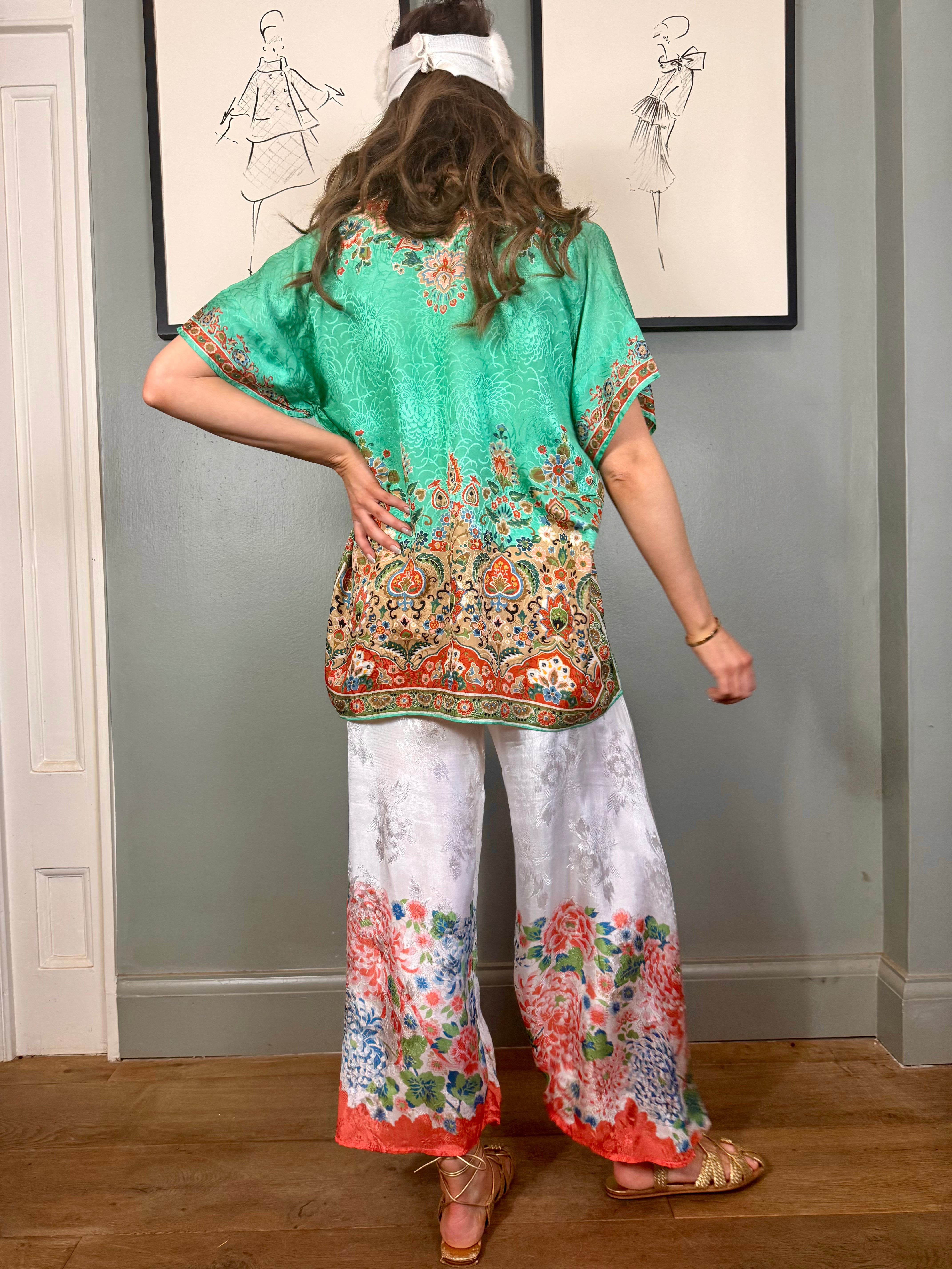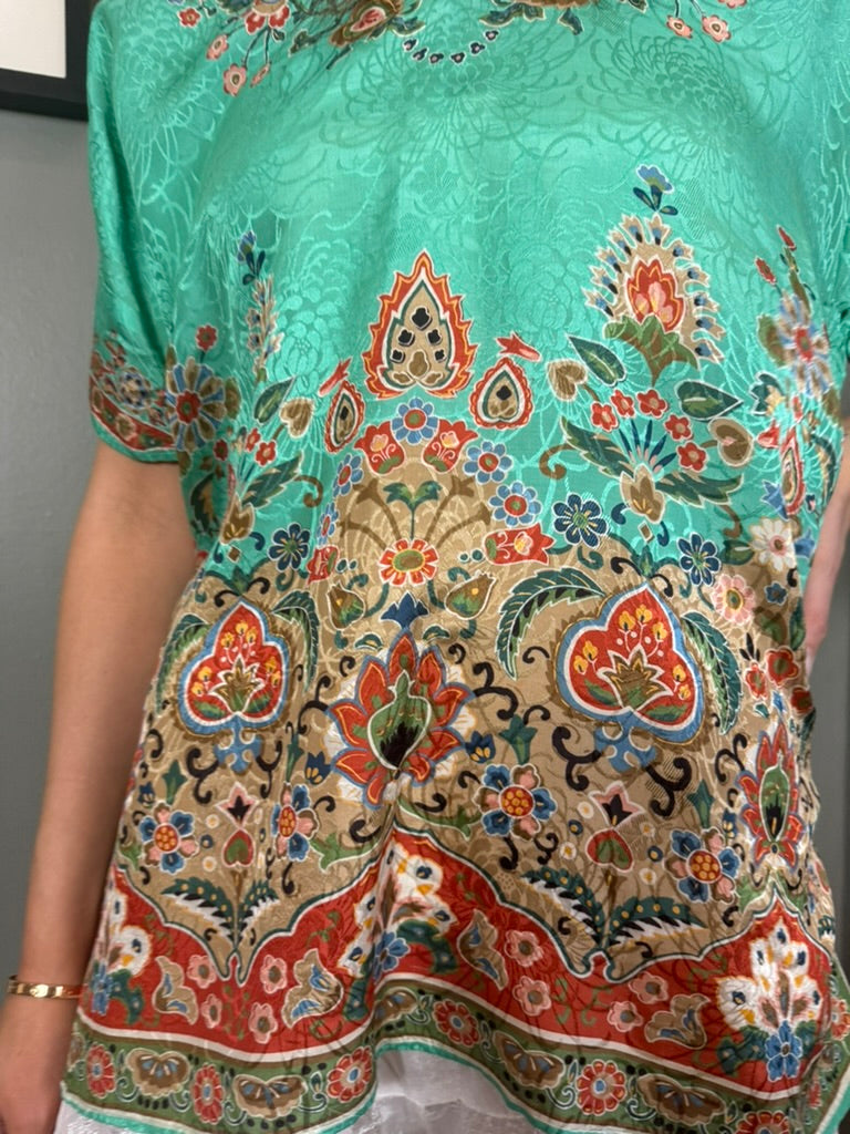 This stunning 30s silk damask Oriental top features a straight loose cut, short sleeves, and a pretty floral print on a refreshing aqua green background. Elevate your style with this original piece of vintage fashion.