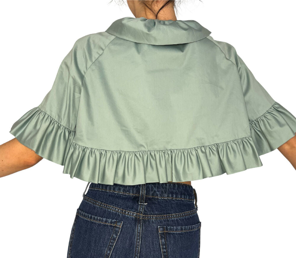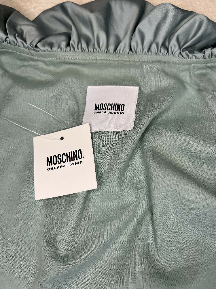 This piece can be worn on its own or as a cape-type garment in a layered outfit. C. Early 2000s under Jeremy Scott’s tenure, this piece is in perfect condition with tags still on. Featuring a frill trim and lace up front, all in a pale mint colour.