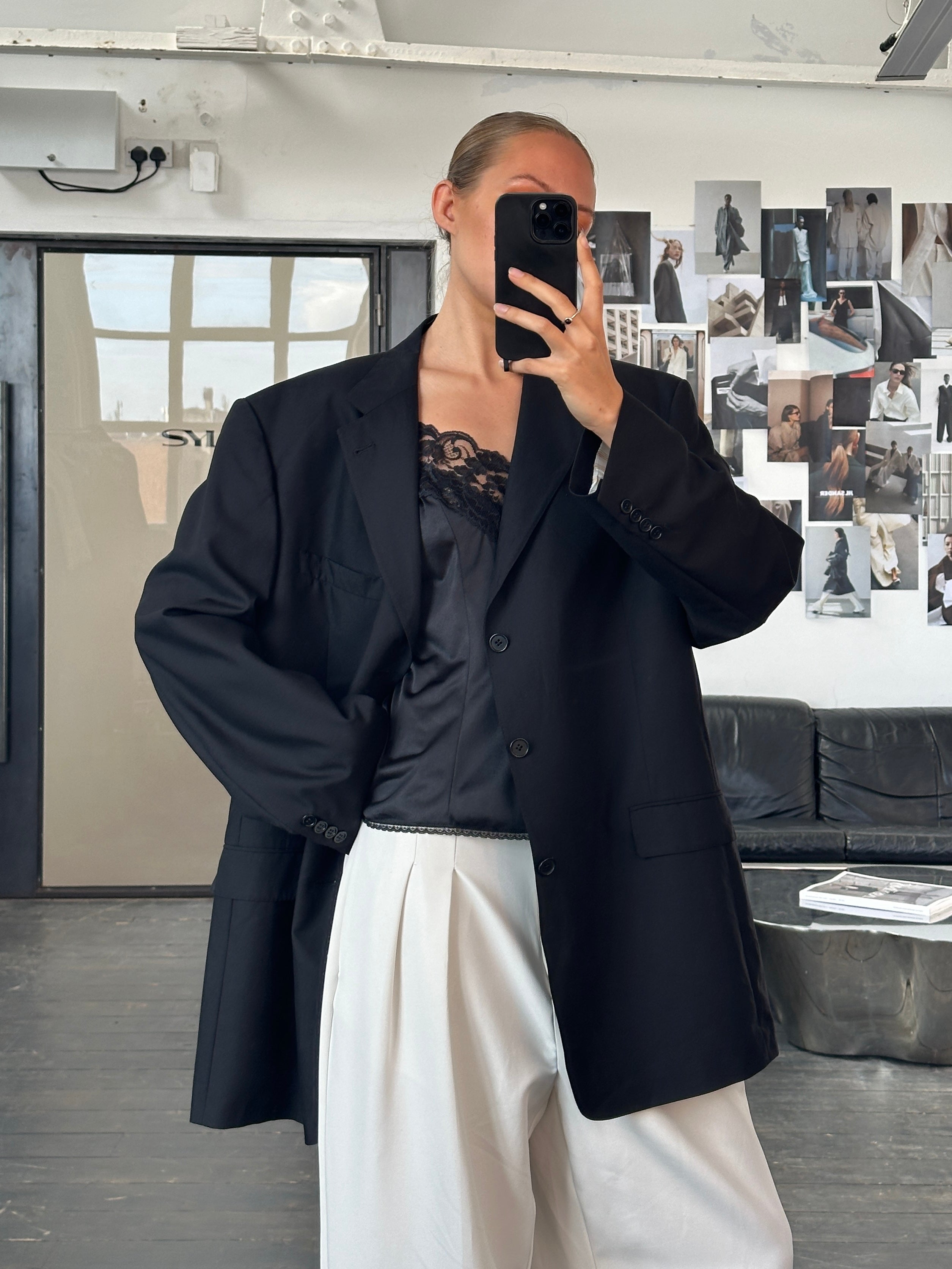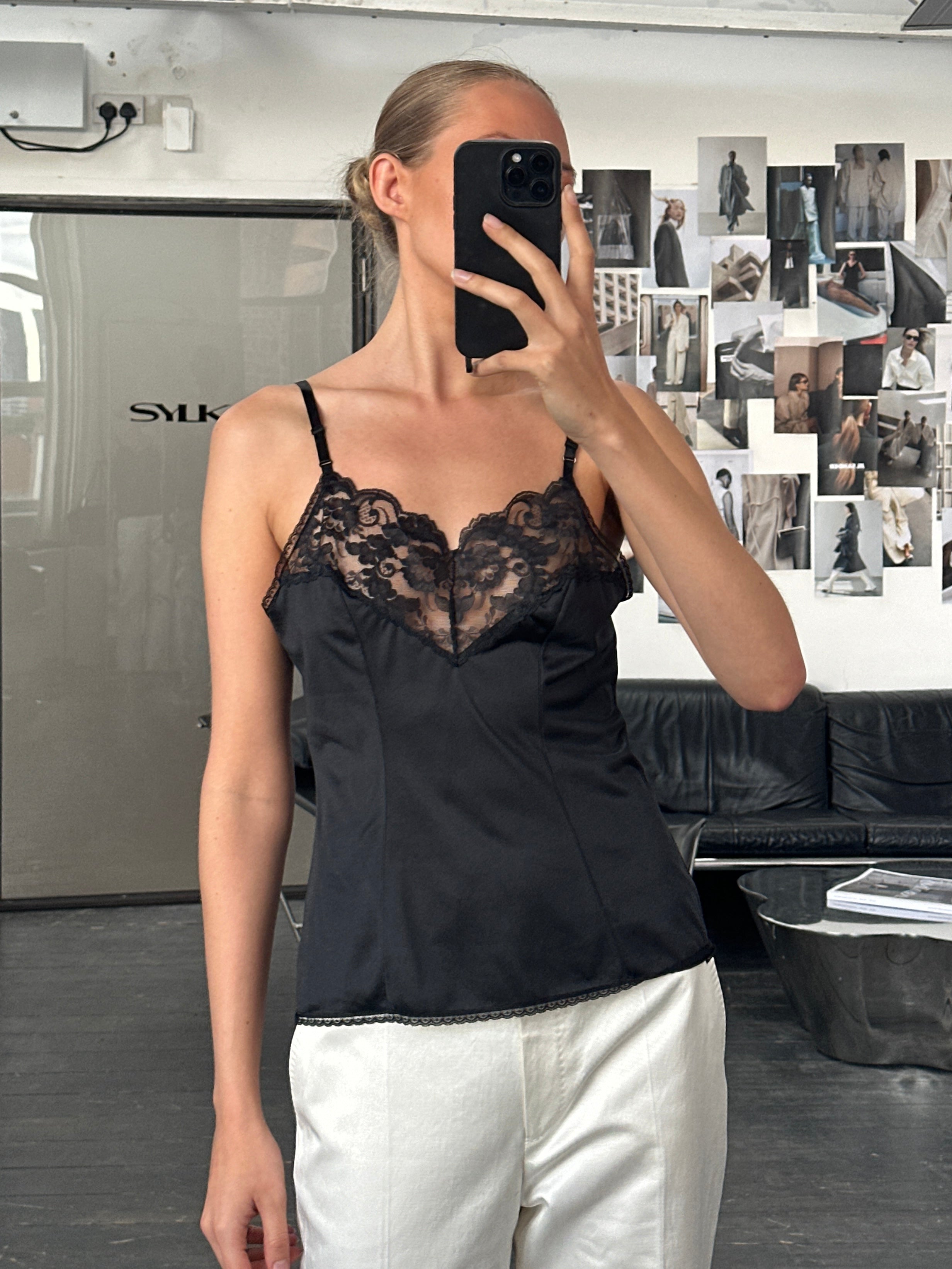 Vintage 1980s black satin cami with lace neckline and adjustable straps. Made in USA - a classic lingerie layering piece with timeless appeal.