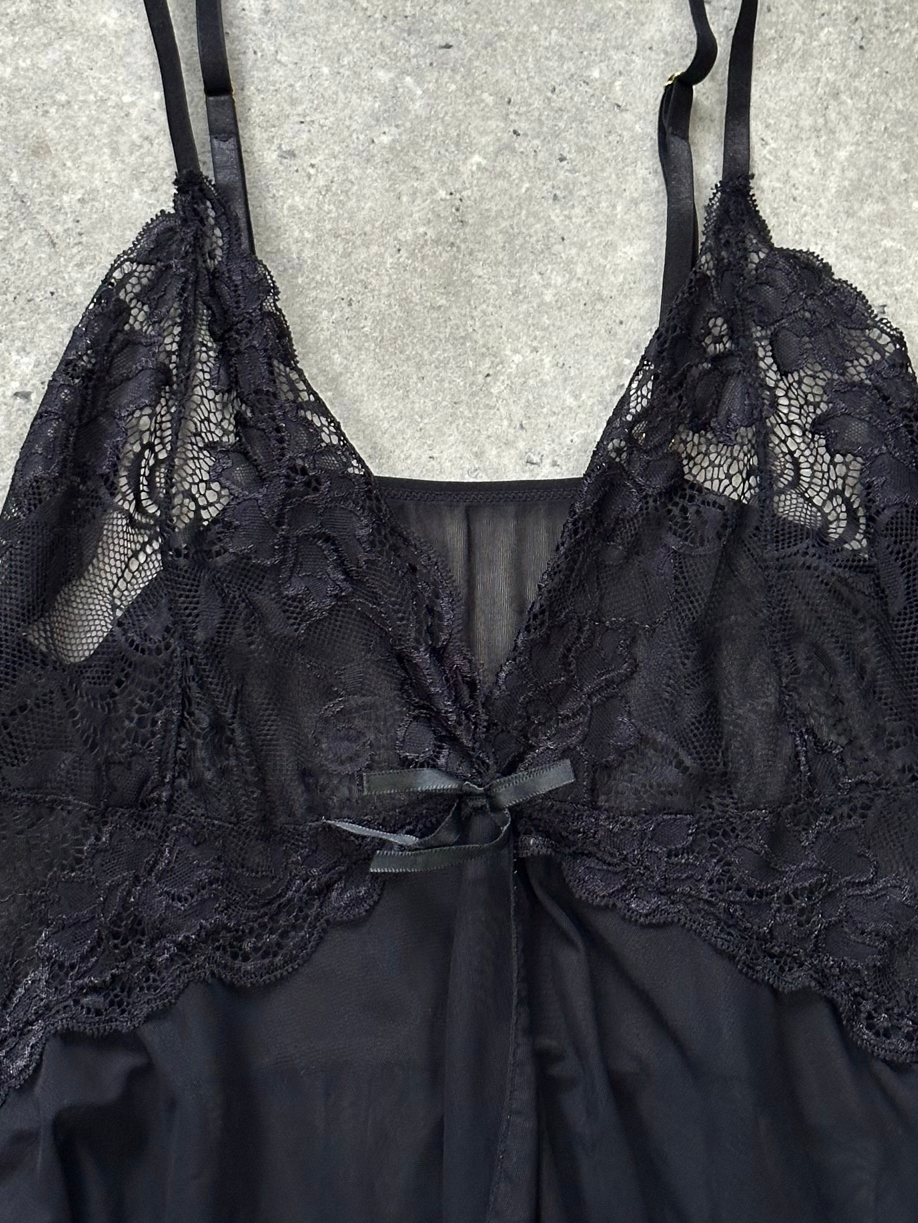 A sheer 1990s black lace and mesh camisole with delicate floral detailing and adjustable straps. Lightweight and fluid with a soft drape, ideal layered or worn as a statement piece.