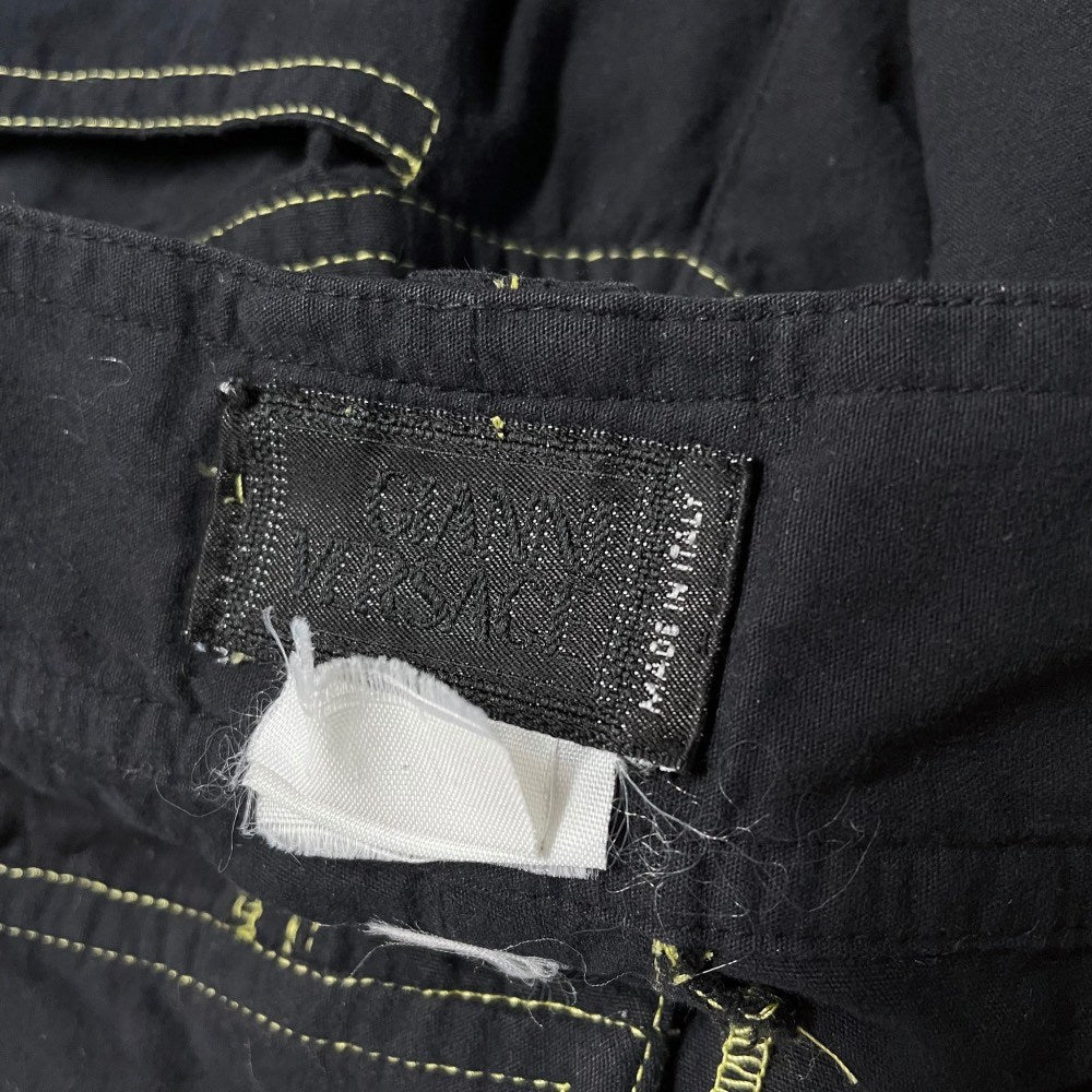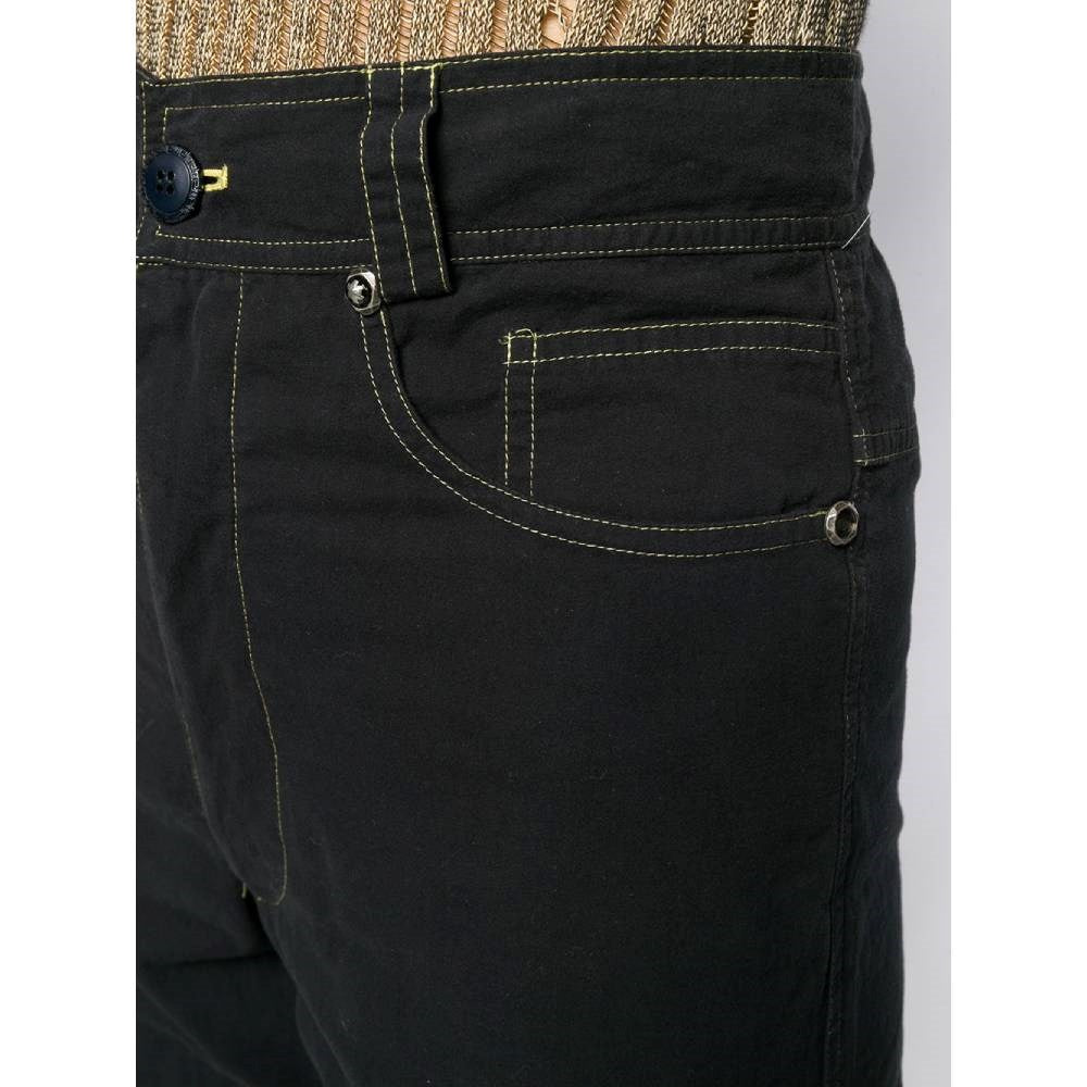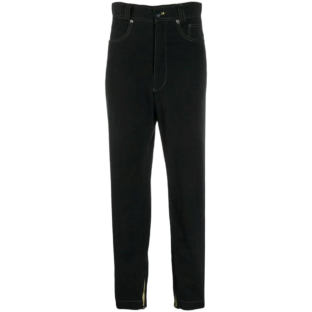 Gianni Versace black cotton 80s high waist trousers with yellow offset seam, two side welt pockets and one on the back. Bottom zipped. Frontal button and hidden zip fastening.