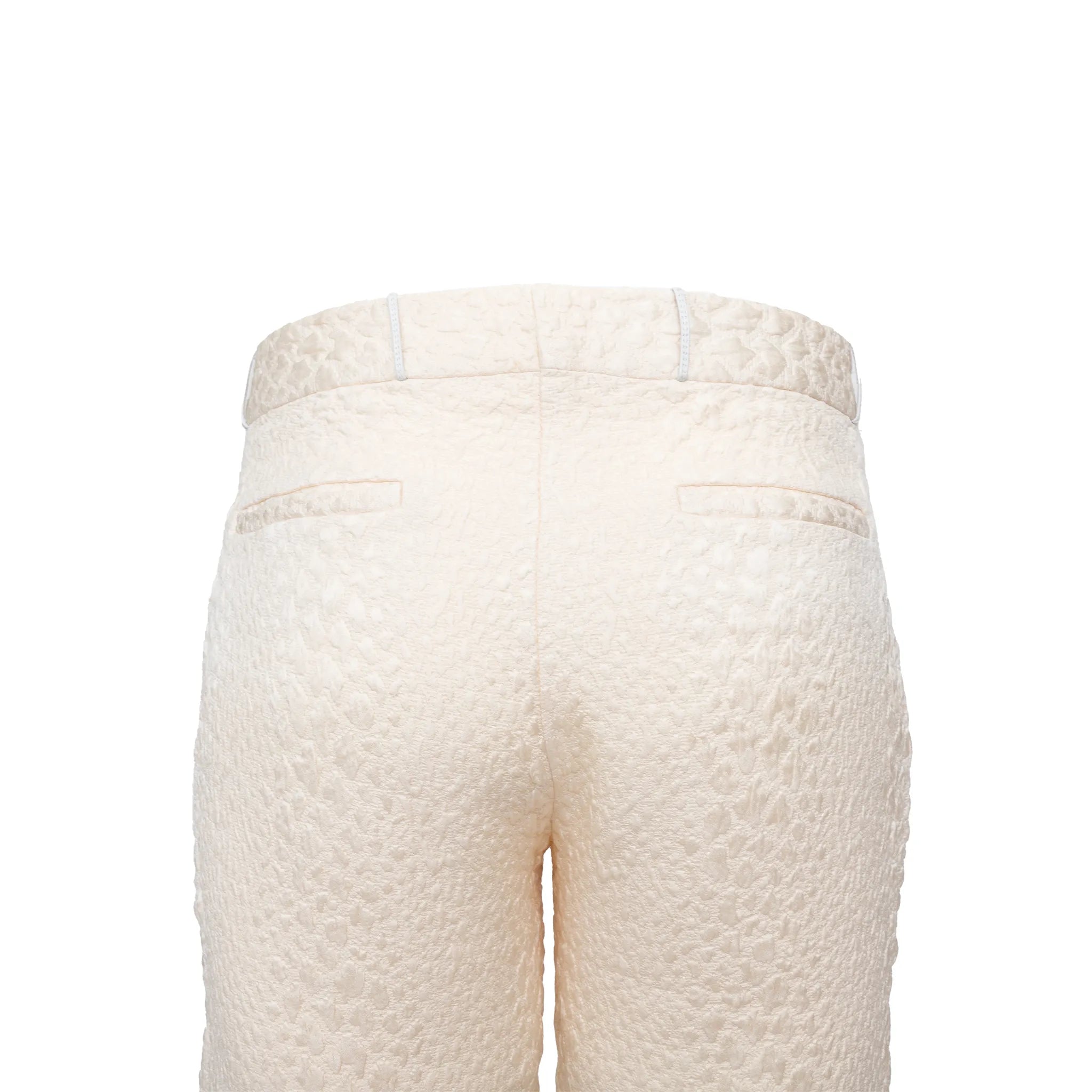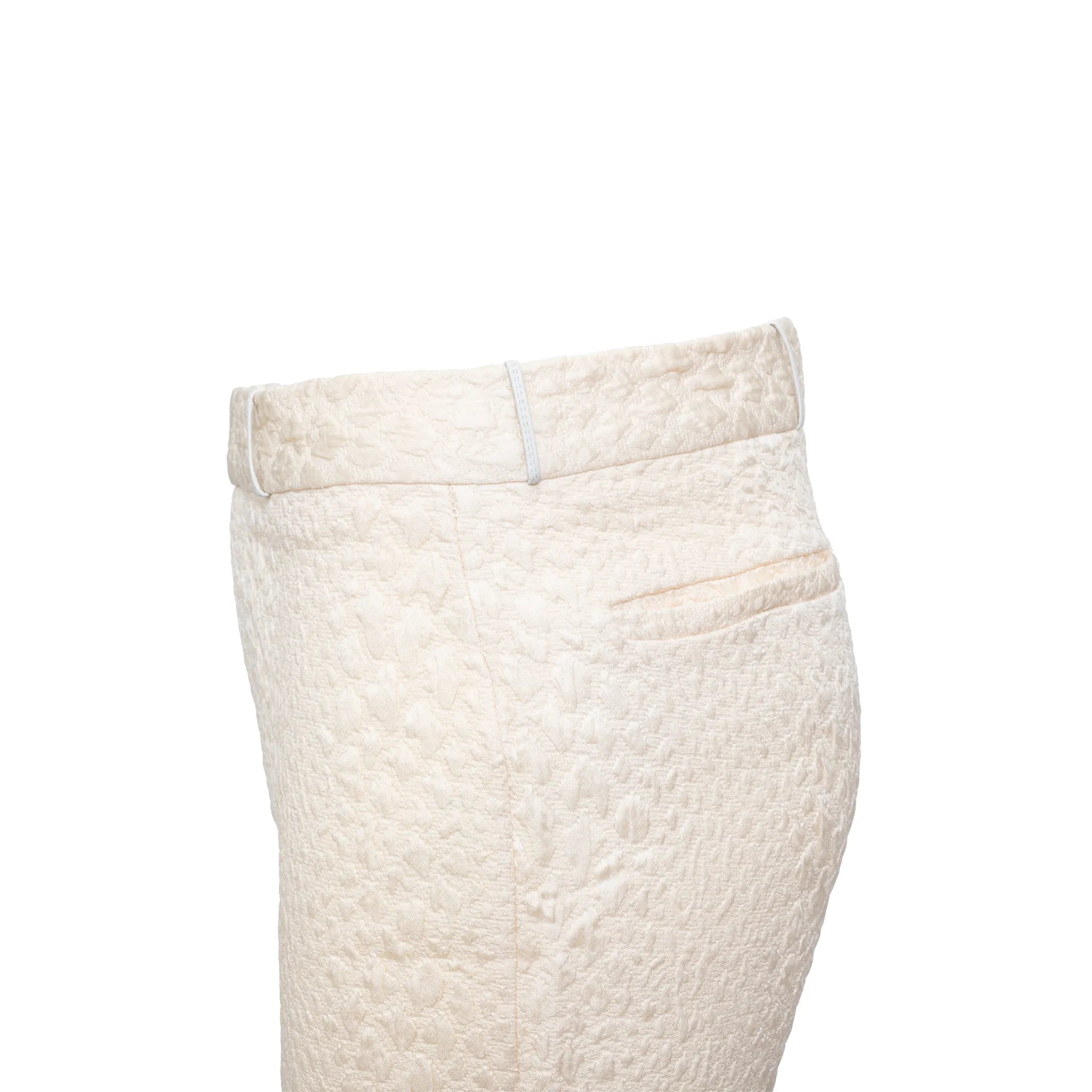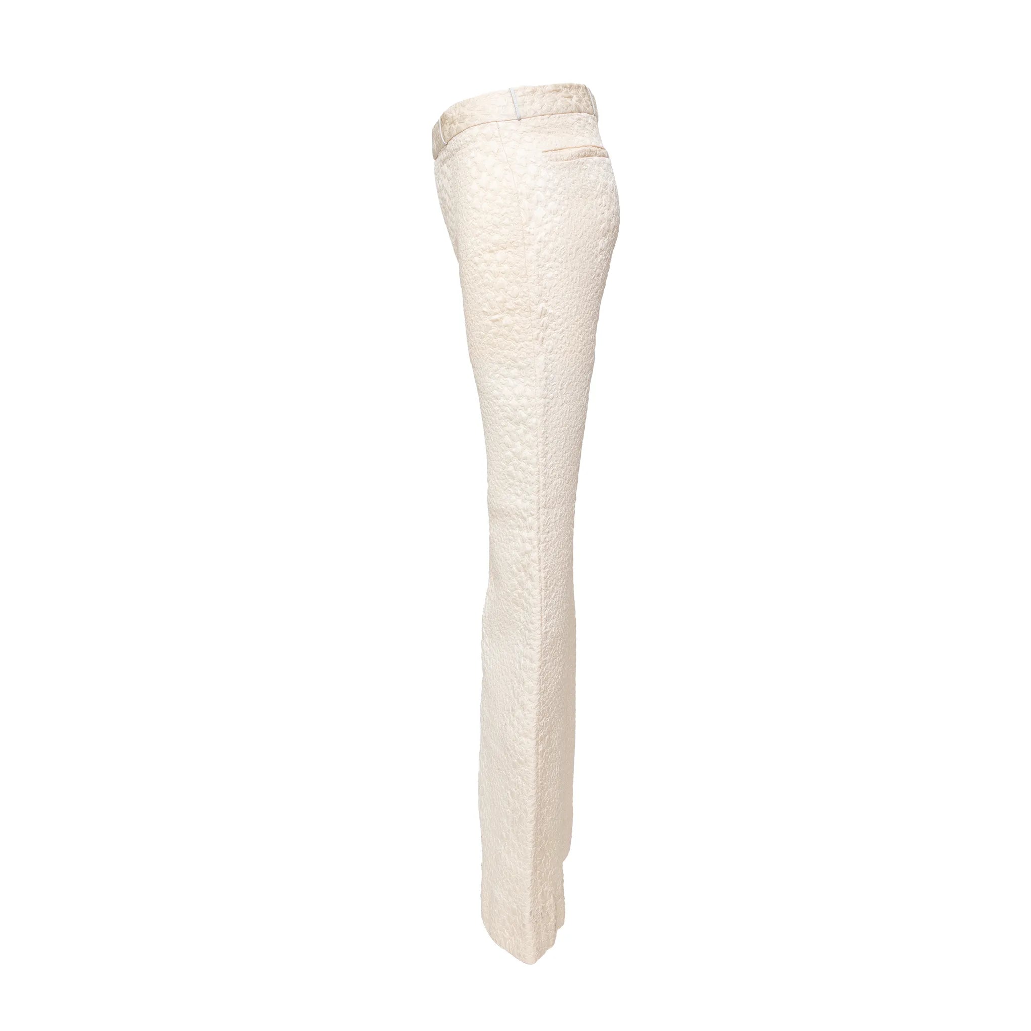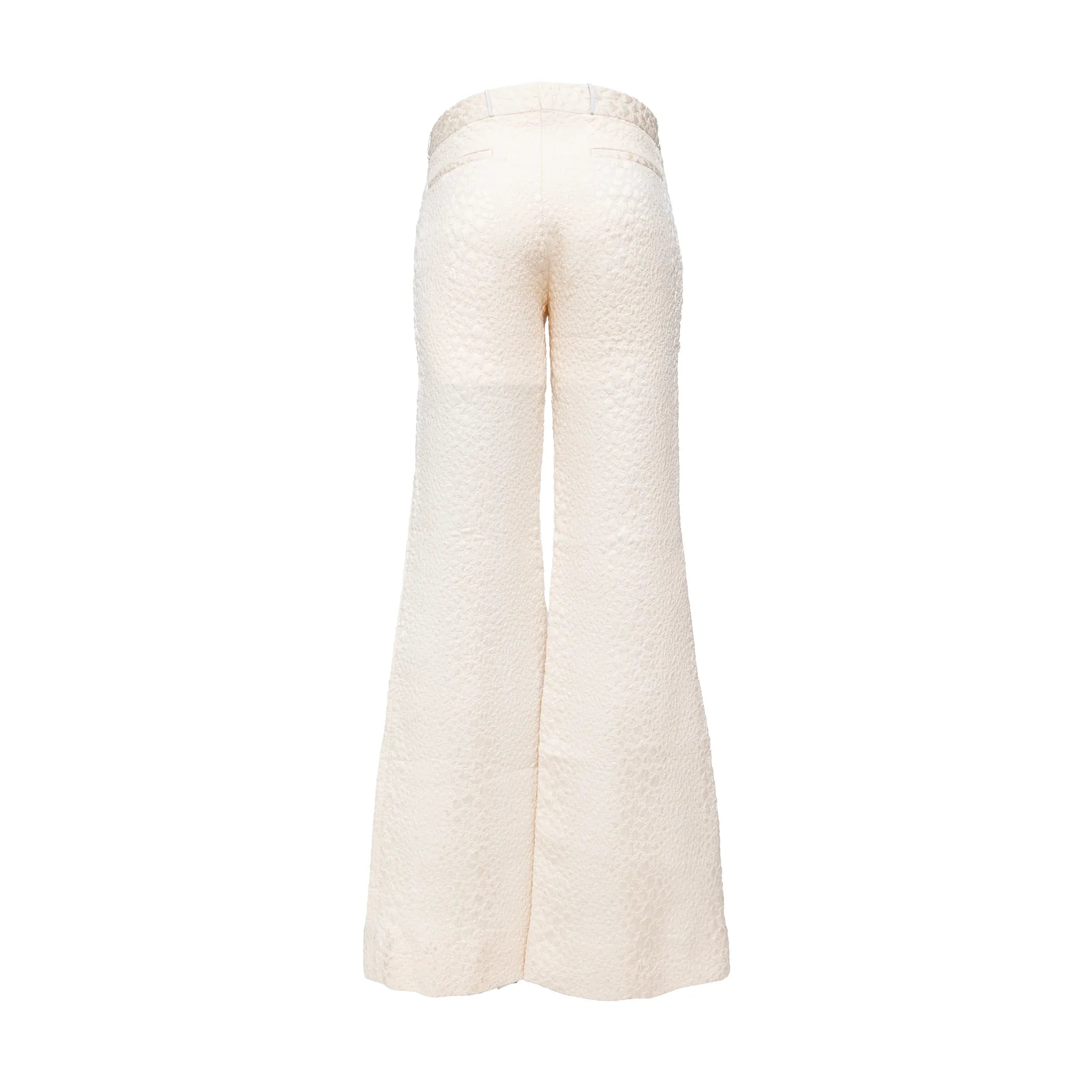 Gucci off-white pants in a silk-wool blend featuring embossed texture, leather belt loops, and a bell-bottom flare.