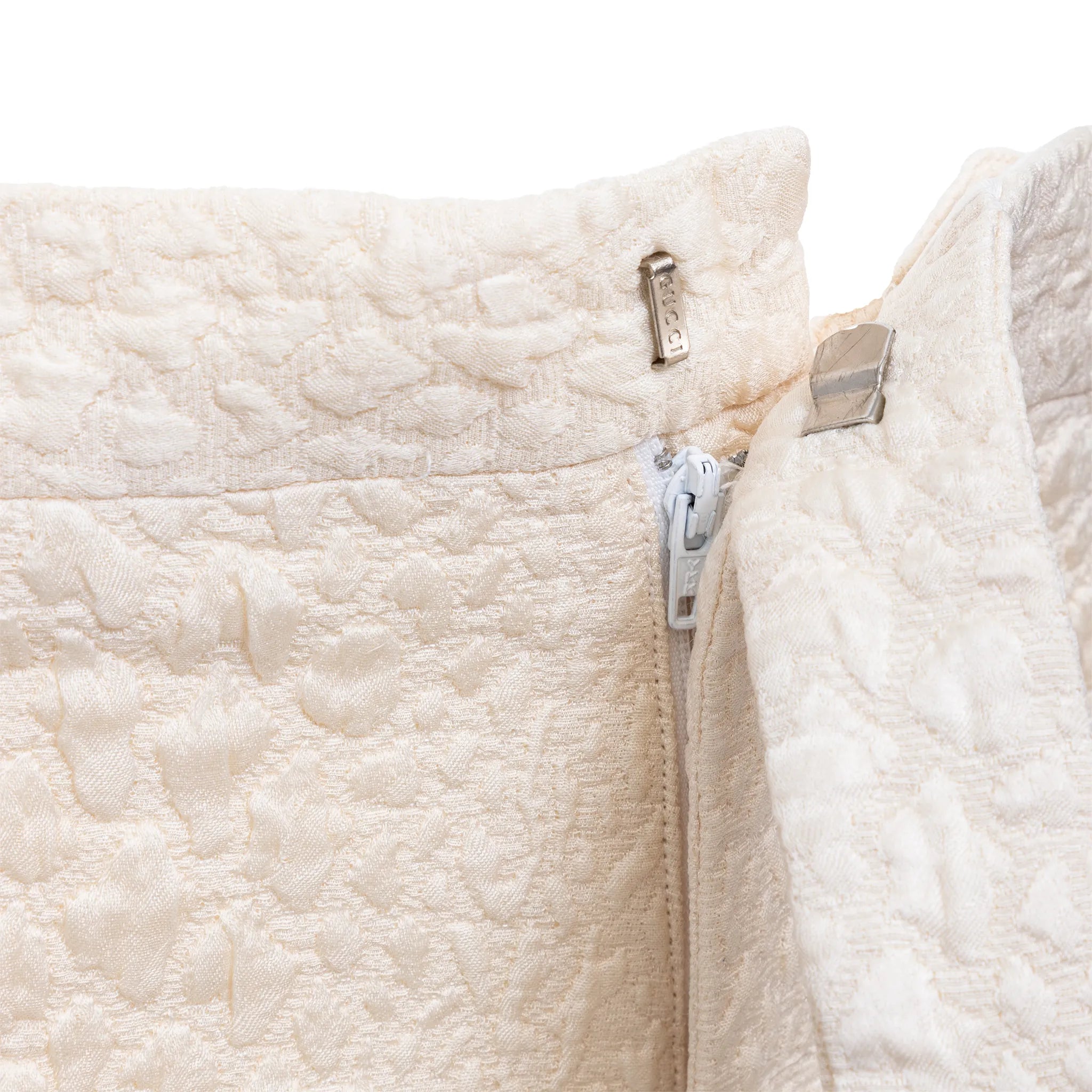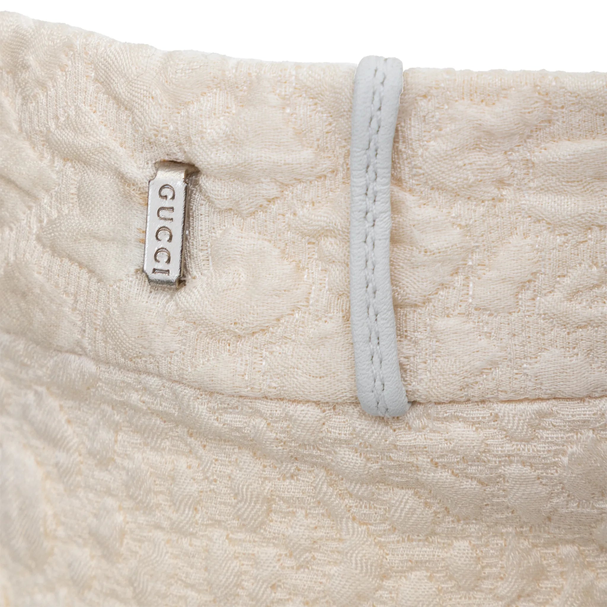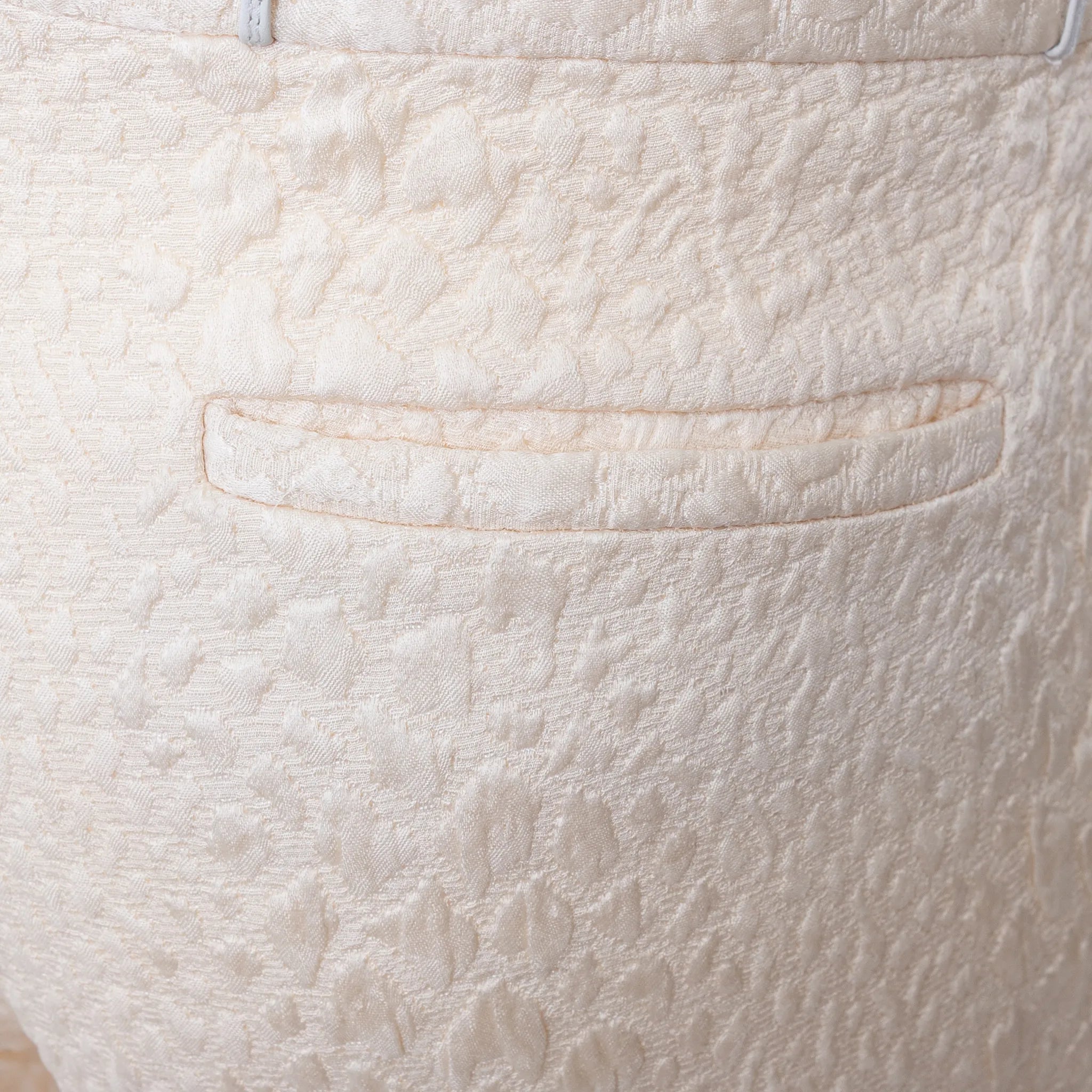 Gucci off-white pants in a silk-wool blend featuring embossed texture, leather belt loops, and a bell-bottom flare.