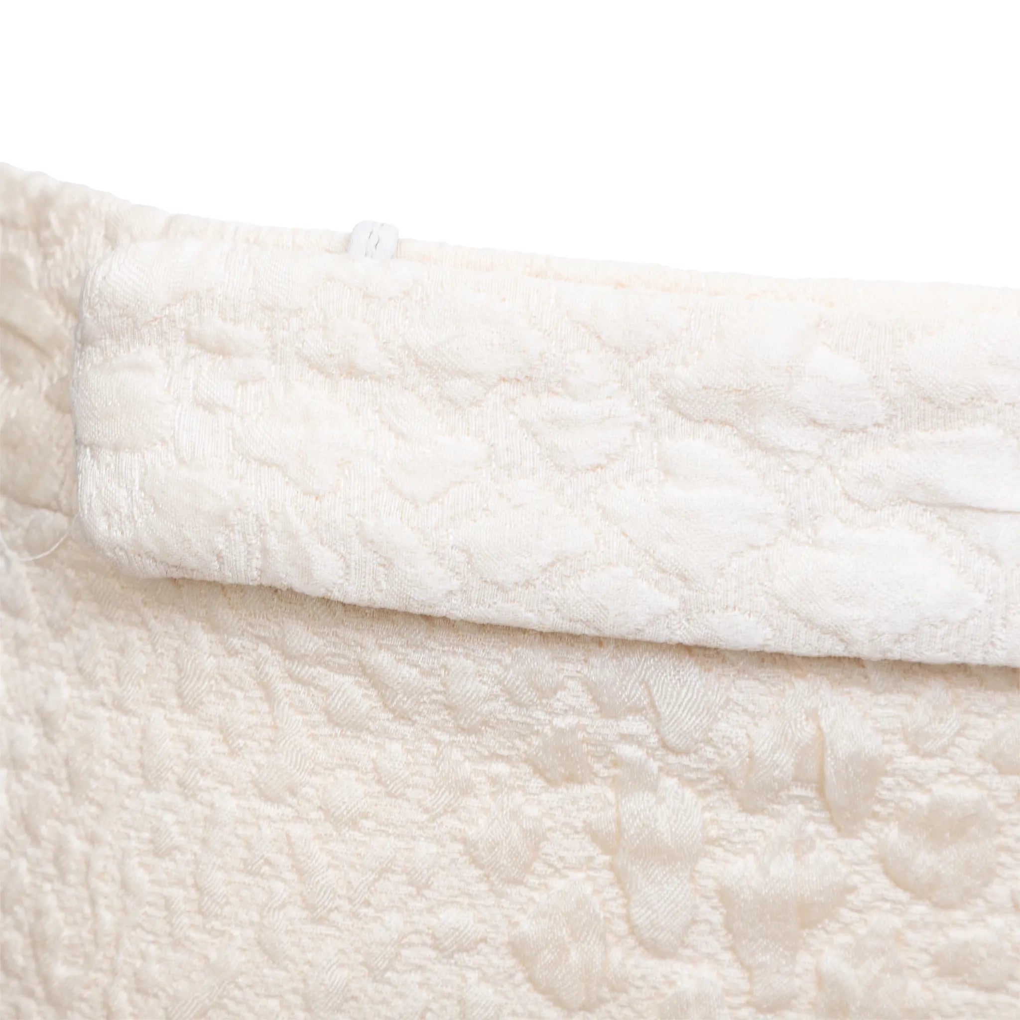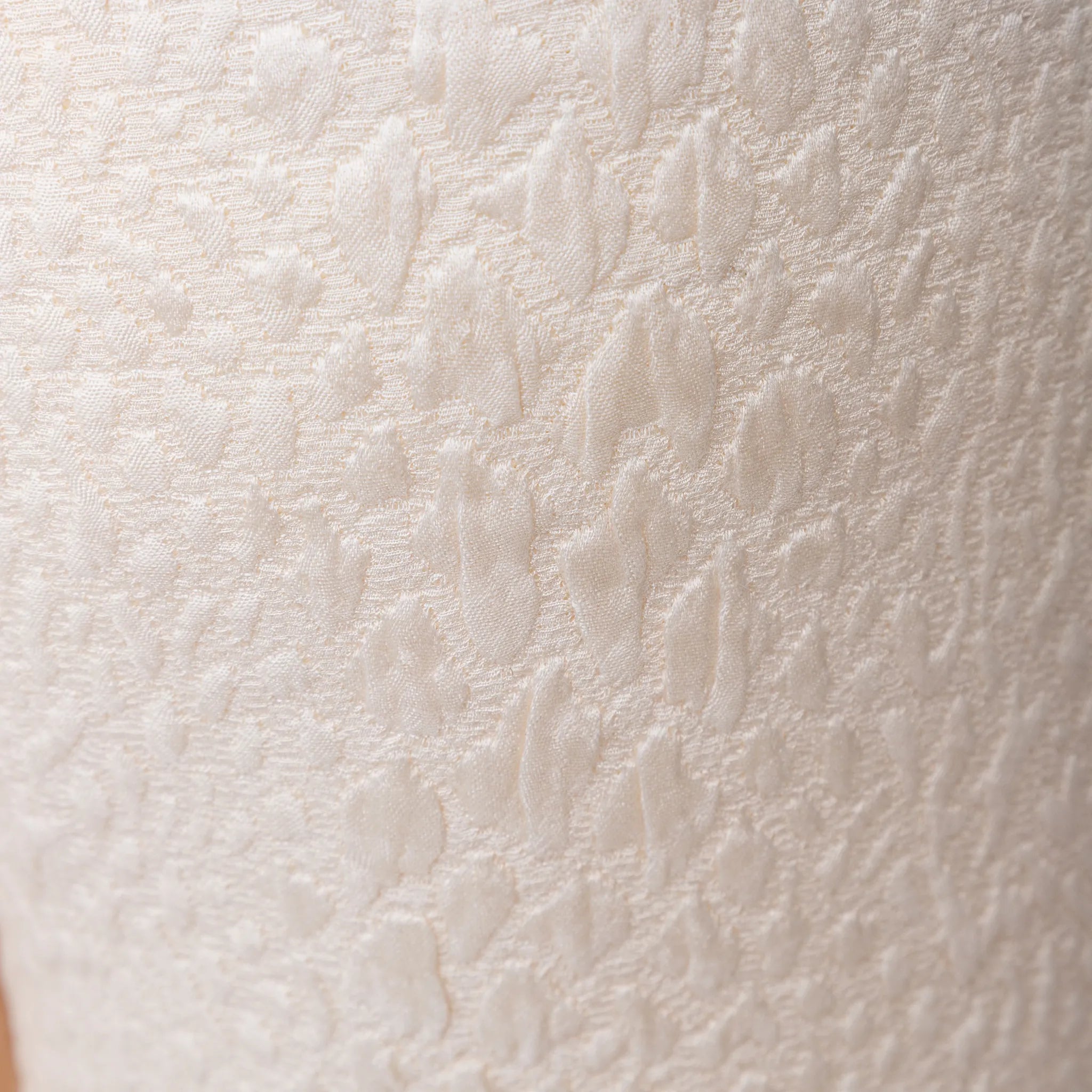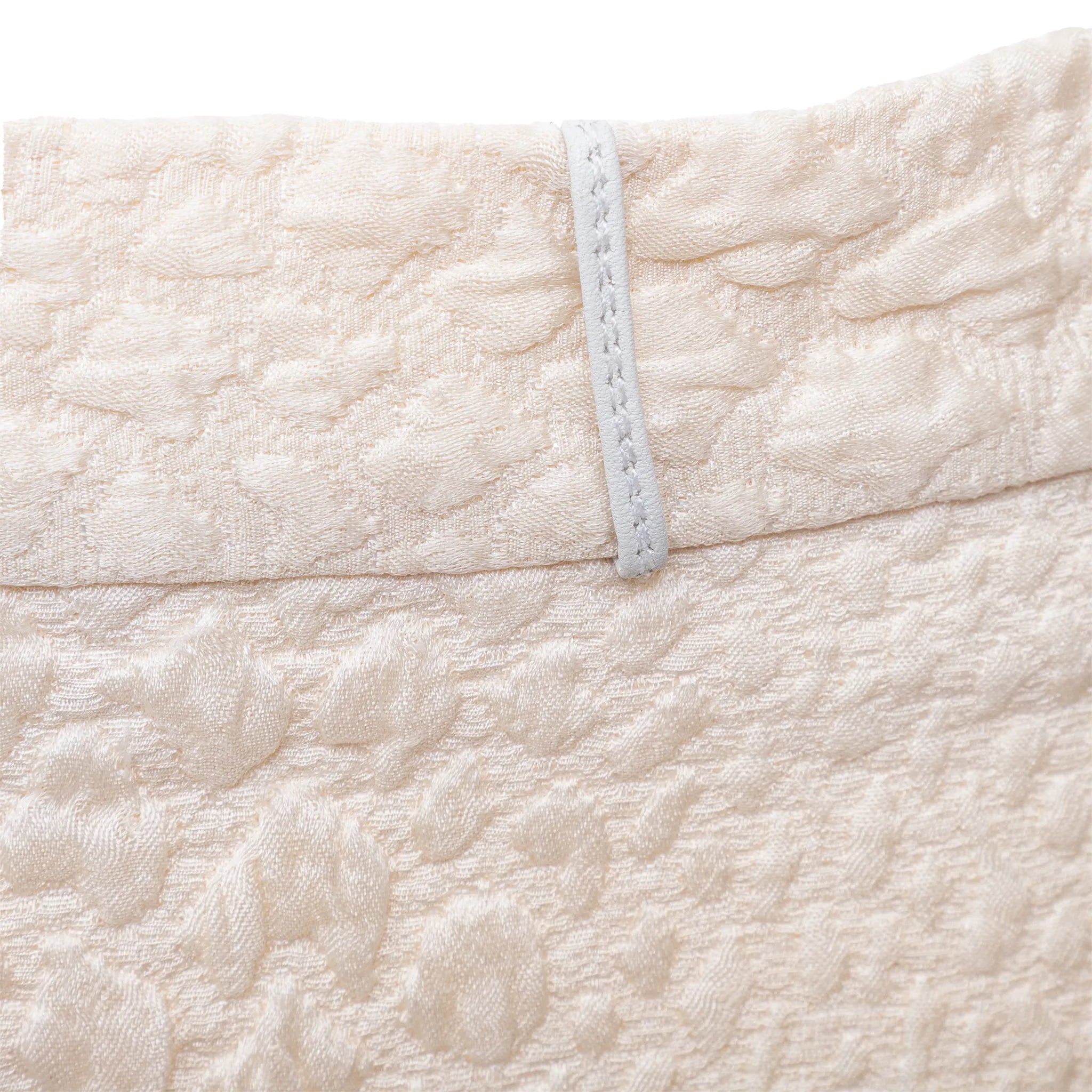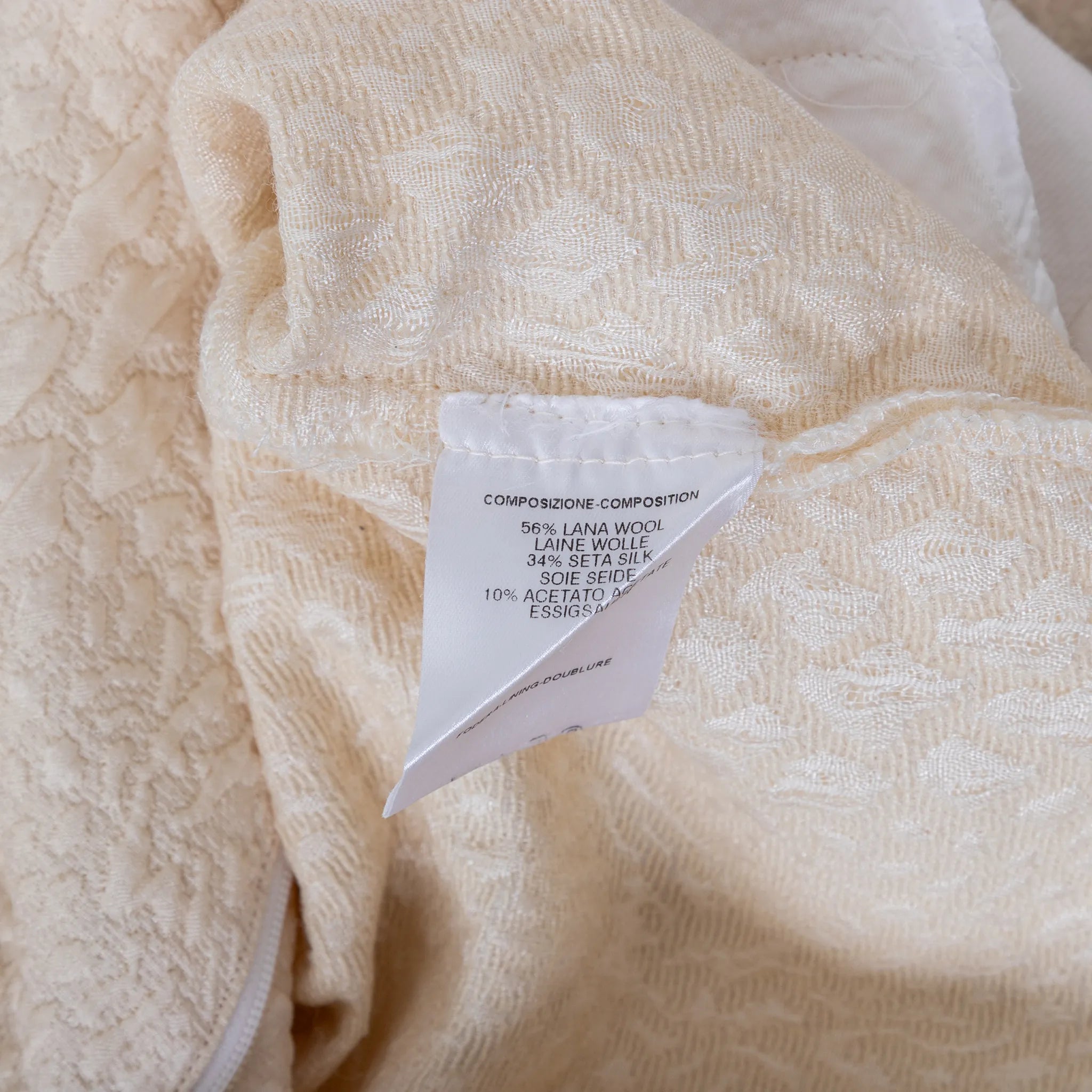 Gucci off-white pants in a silk-wool blend featuring embossed texture, leather belt loops, and a bell-bottom flare.