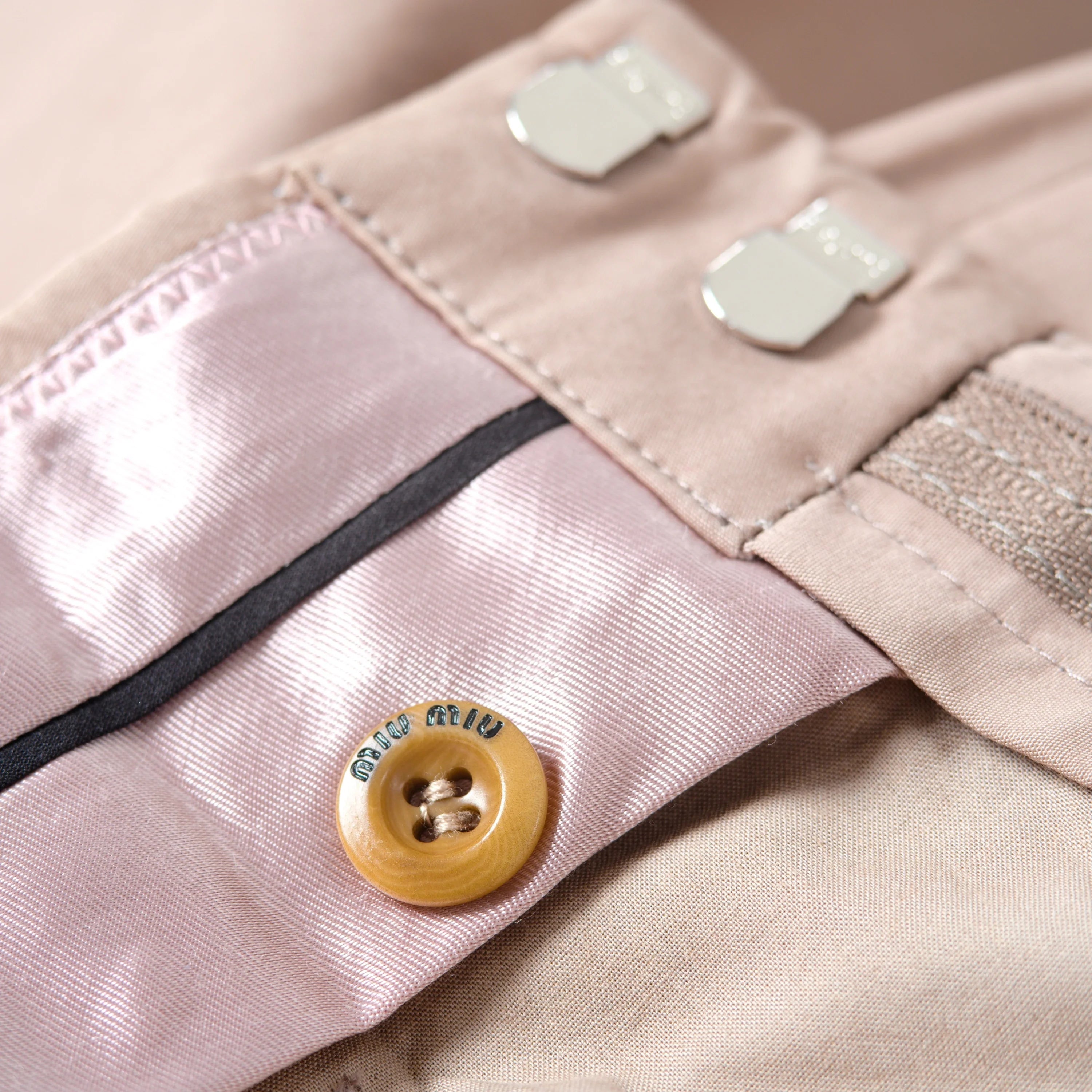 Expertly crafted from a smooth, lightweight fabric, these Miu Miu trousers showcase a refined cipria hue with a clean, minimalist finish. Designed with a flattering wide-leg cut, they feature precise front creases, belt loops, and discreet welt pockets for a polished silhouette. Finished with signature Miu Miu detailing and a soft inner lining, they offer comfort, elegance, and timeless sophistication.