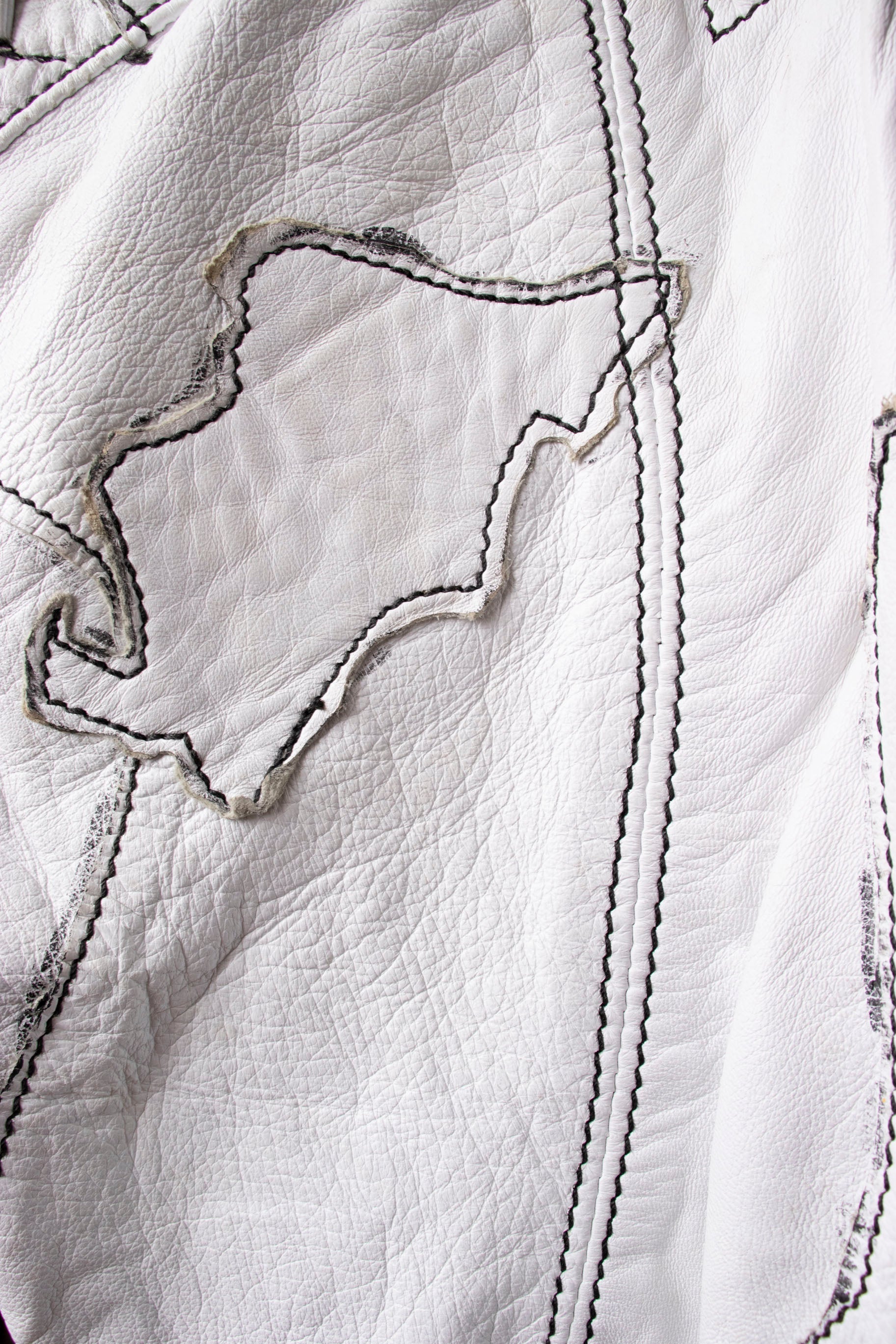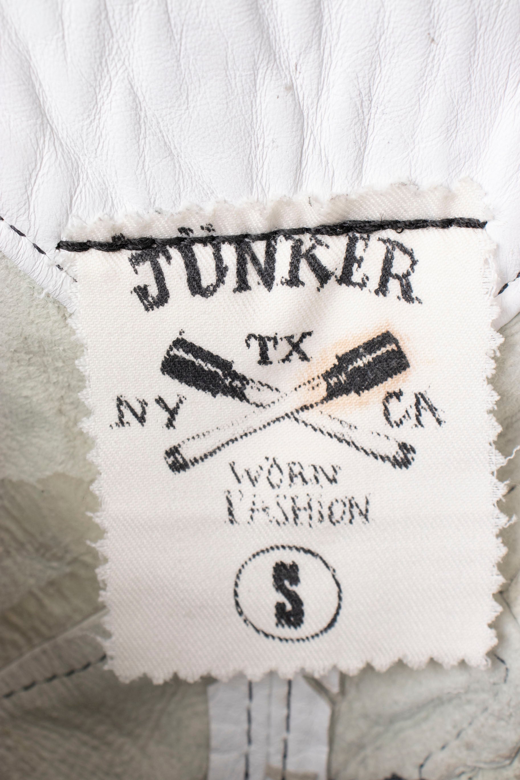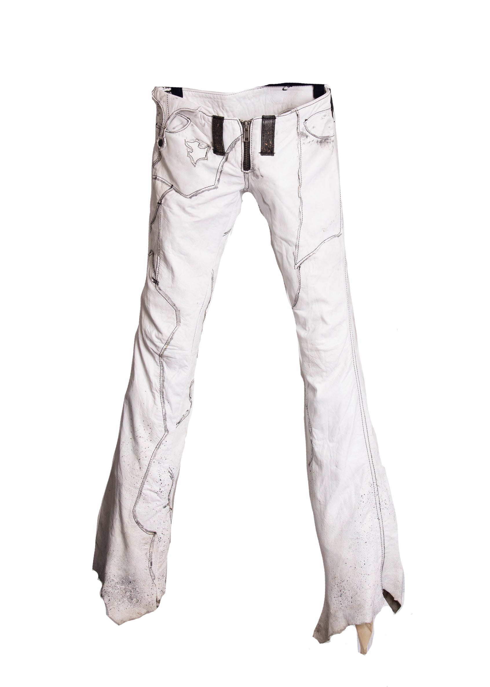 These insane Rocker pants worn by Steven Tyler are made from buttery soft and distressed white deerskin, and feature charcoal sketching detail at the patchwork seams. The raw, asymmetric hem is complete with performance stains, and we love the low-rise waist with the chunky zipper and belt loops. There are two front denim lined pockets. Handmade, hand stitched hand finished.