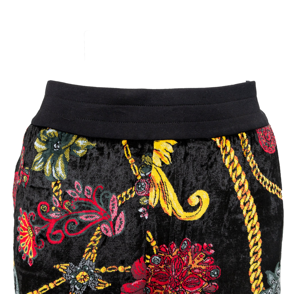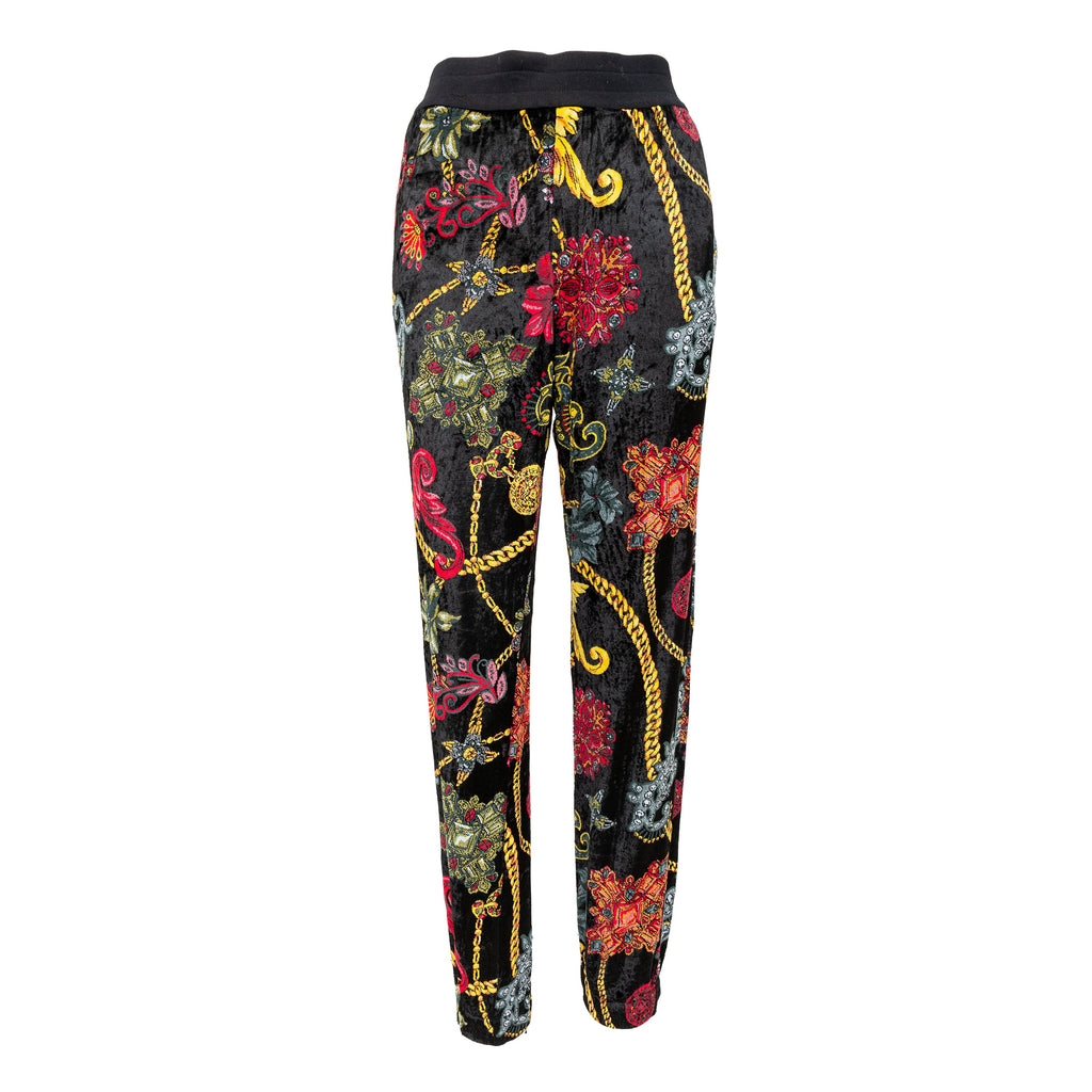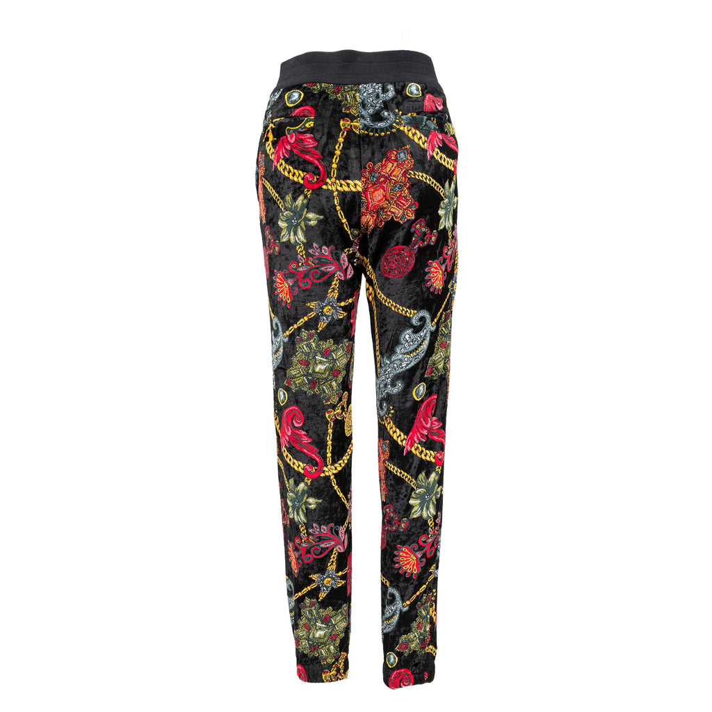 Expertly crafted with a cotton and viscose blend velvet fabric, these Versace Floral Baroque trousers exude luxury. The black color is complemented by a stunning multicolor print featuring chains, flowers, and jewels. The elasticized waistband ensures a comfortable fit for a relaxed yet chic look.