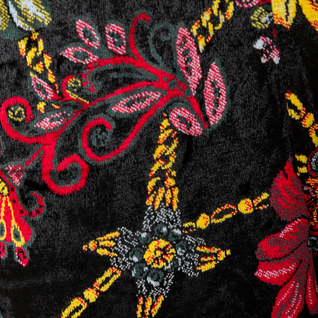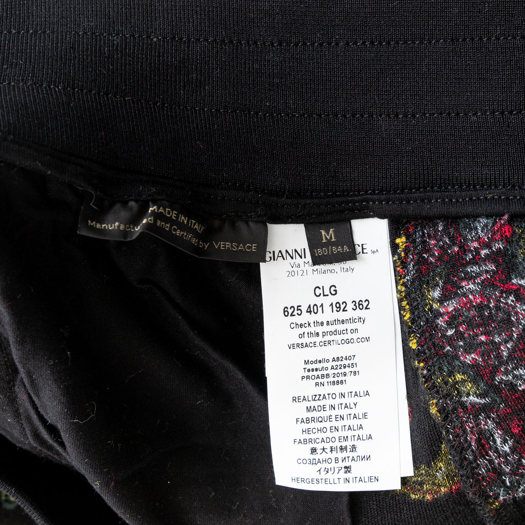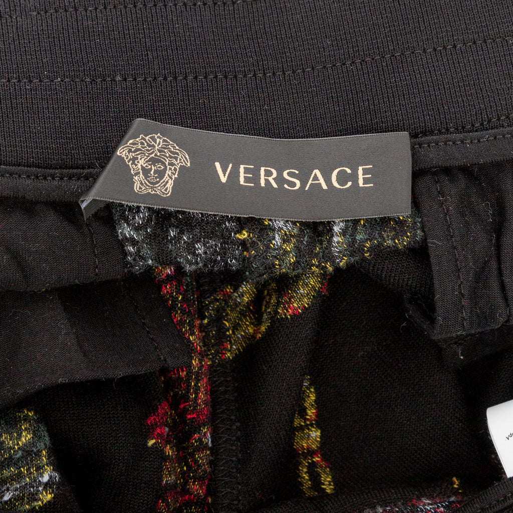 Expertly crafted with a cotton and viscose blend velvet fabric, these Versace Floral Baroque trousers exude luxury. The black color is complemented by a stunning multicolor print featuring chains, flowers, and jewels. The elasticized waistband ensures a comfortable fit for a relaxed yet chic look.