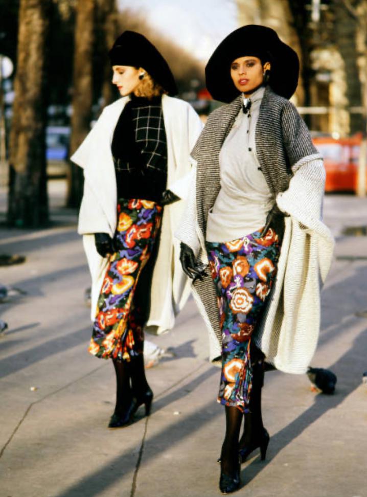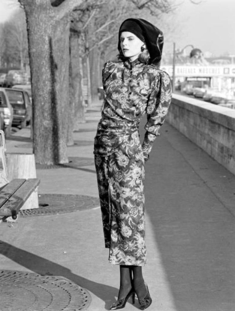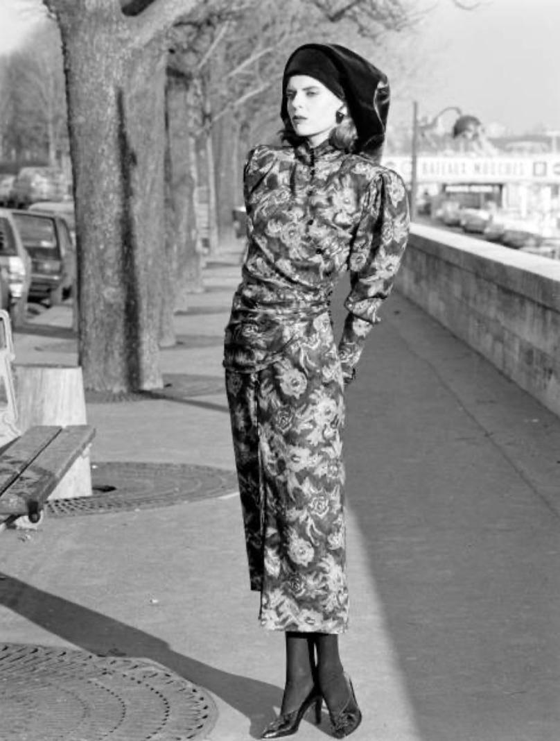 The jacket has a high ruched neck, complete with three shiny black facet cut glass buttons. It fastens to the front with the same looped buttons in a cross-over mandarin style with a concealed tie belt around the waist. It is gathered with another three button closure at the left hip whilst hanging lower across the right hip in the signature asymmetrical design. The shoulders are heavily padded, as was typical of the era and the sleeves gradually narrow along the length of the arm to the cuffs, which feature rows of five buttons along the outer side of each forearm and a zip closure. The fabric is truly spectacular – a soft jacquard silk with Asiatic floral patterns of blue, teal, purple, indigo and white against a deep pink background. This really is a statement piece, perfect with tailored trousers or a skirt and heels for a more formal look.