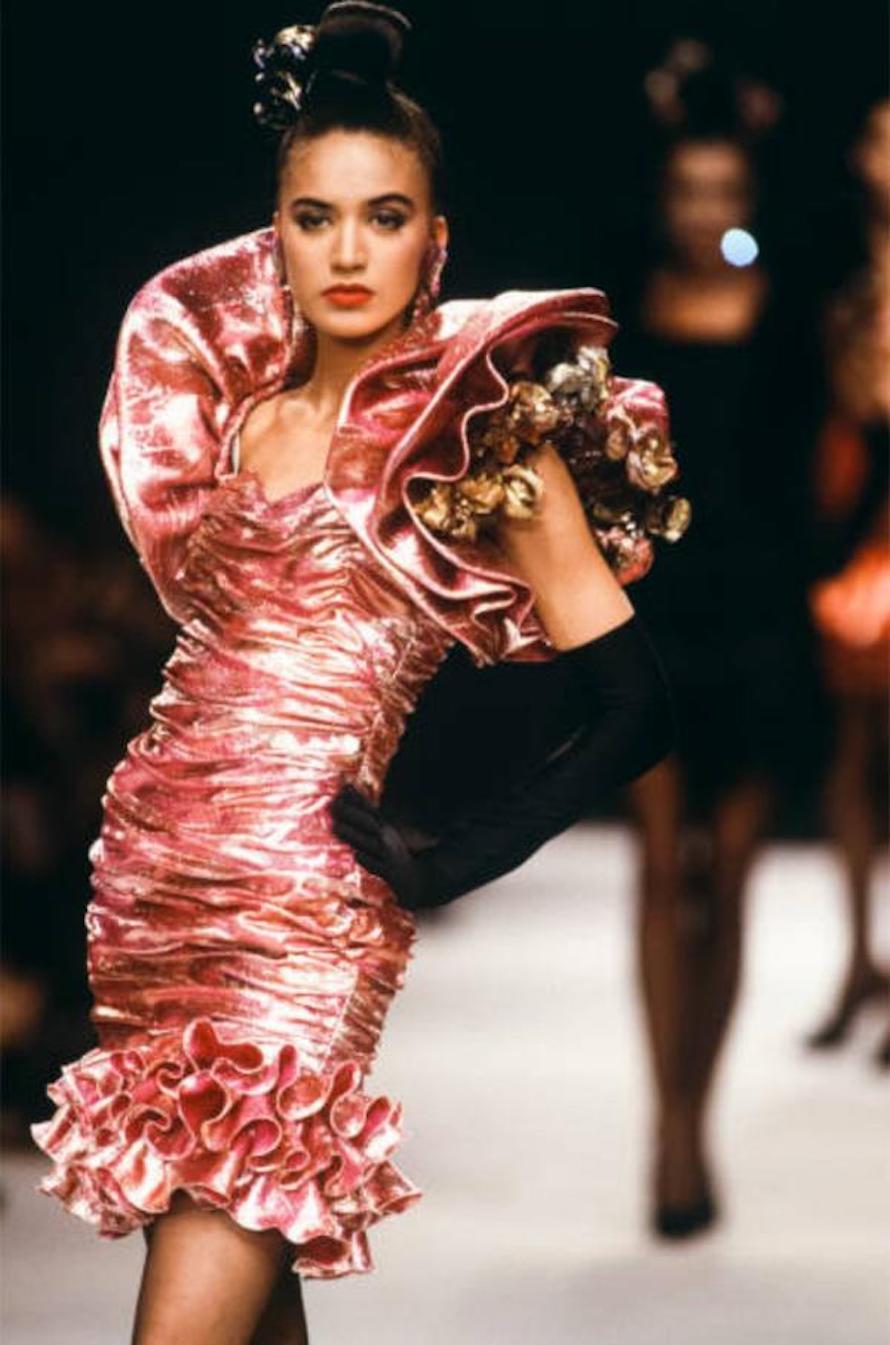 There is a strikingly similar dress from the F/W 1988-89 Emanuel Ungaro Runway Collection with similar shoulder detailing and in a matching lame fabric but in coral red. You can see the reference photo which gives you a great idea of how incredible this showstopping dress will look when worn!