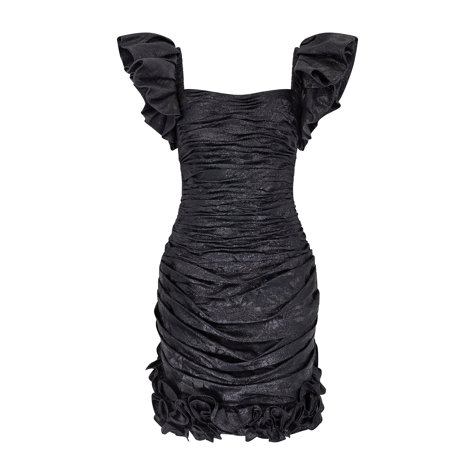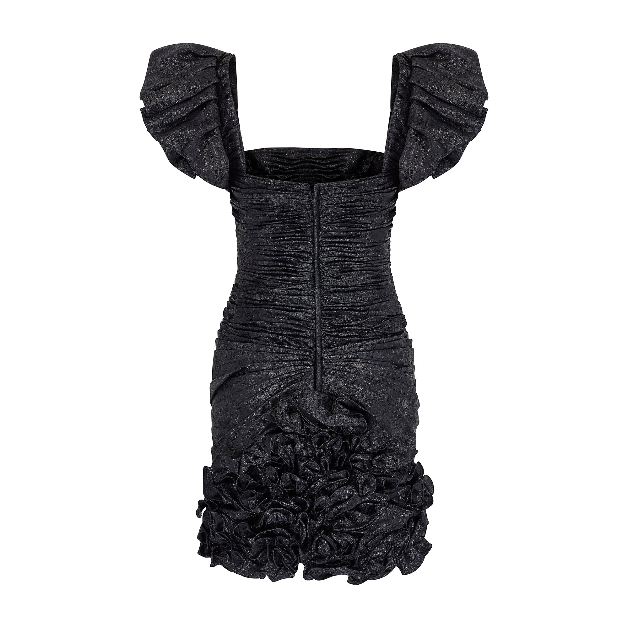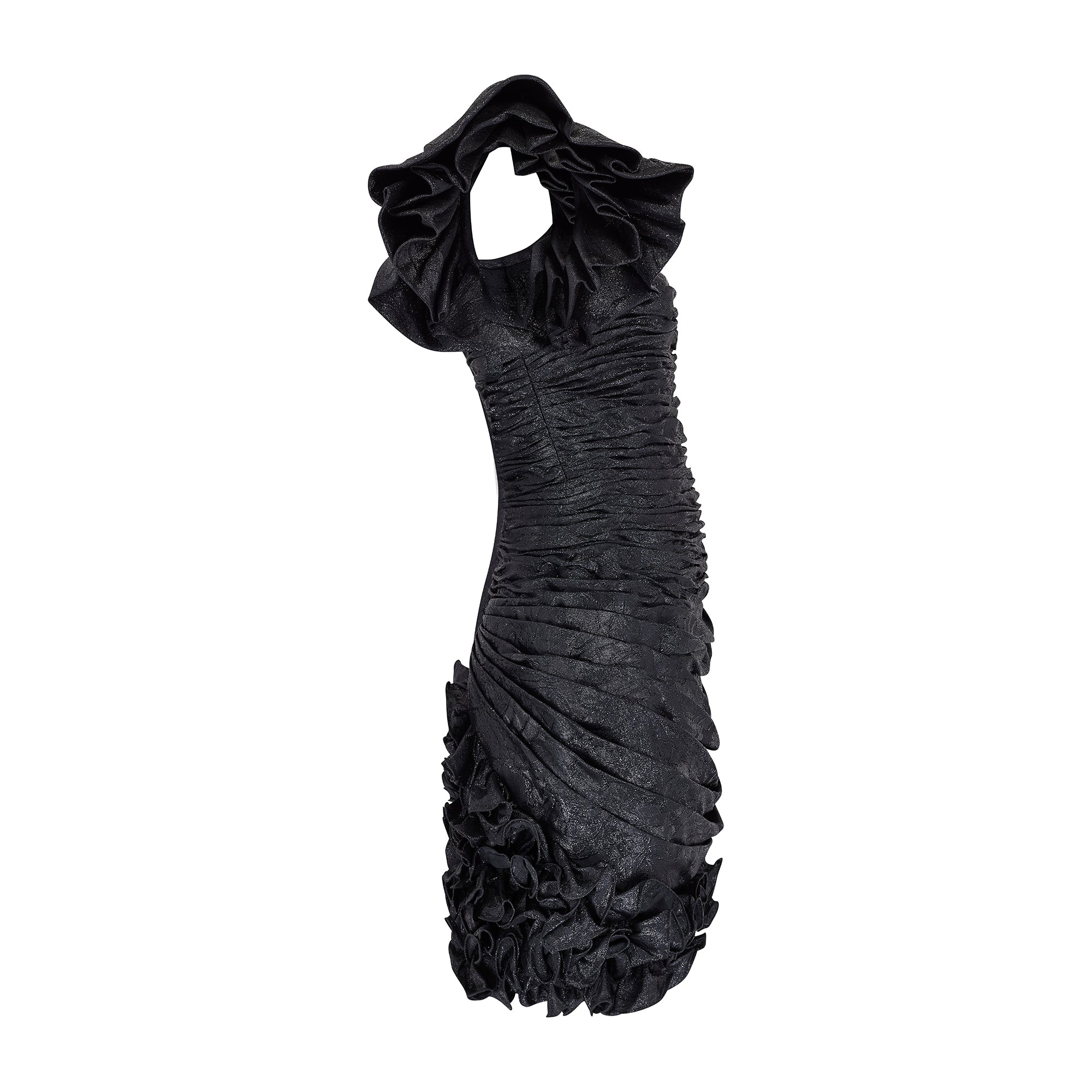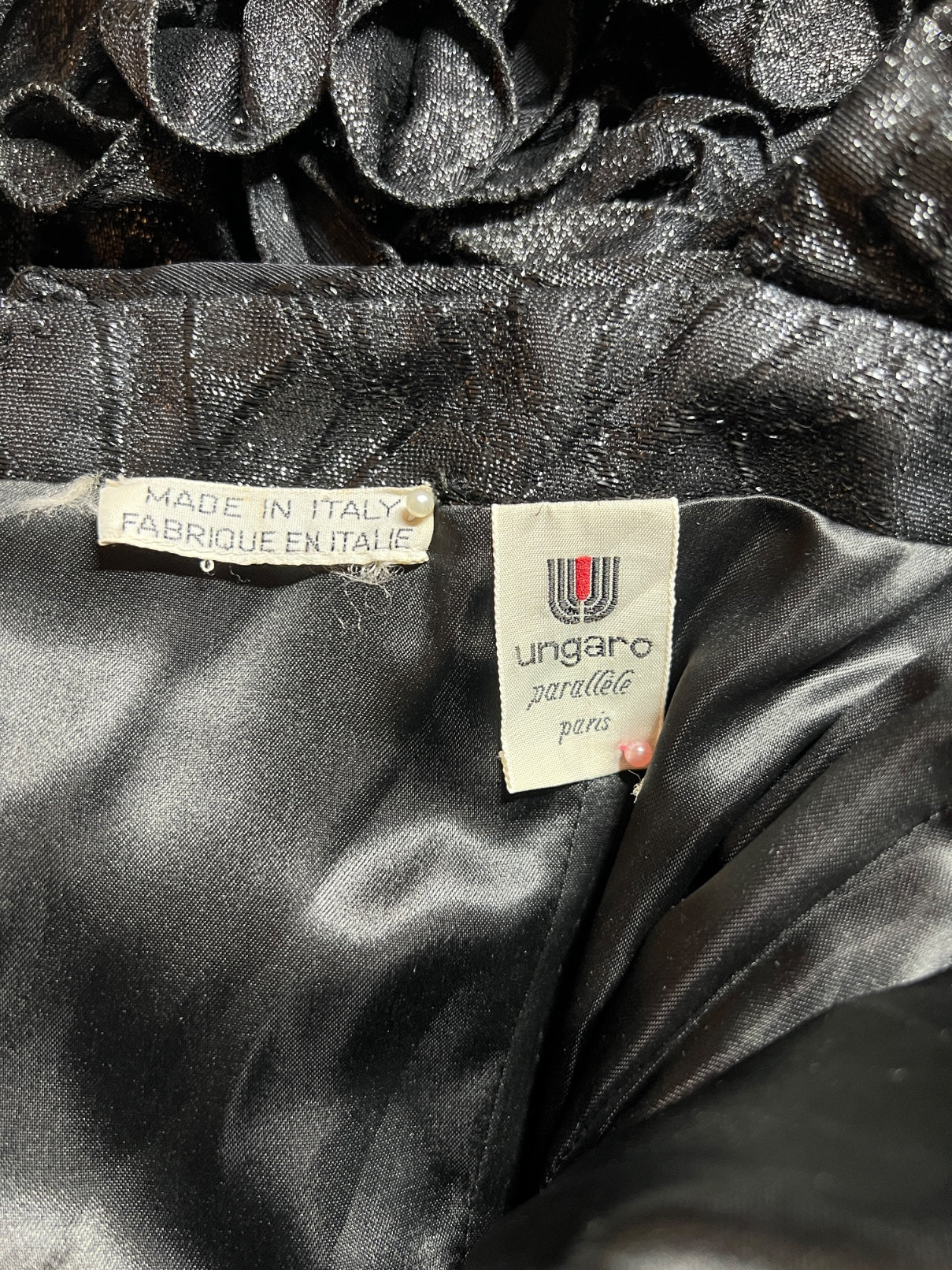 This black runway documented 1980s lame cocktail dress is by renowned French couturier Emanuel Ungaro. With a dramatic square neckline, the dress is sleeveless but with an exaggerated double layer of ruffles at the shoulders, ruched fabric wrapped around the bodice and a double layer ruffle trim around the base which gives volume and accentuates an hourglass figure. The back has a bustle design with additional ruffles cascading from the bottom of the zip at the back. Ungaro ready to wear was very well made and often, the atelier used the same fabrics as the haute couture range. This dress is masterfully and beautifully constructed in a type of jacquard fabric which has a metallic sheen - like lame. It is in superb vintage condition with no faults of any note and looks barely worn. It is sized a US 8 but vintage runs small and this is better suited to a UK 8-10 or US 4-6 in modern sizing.