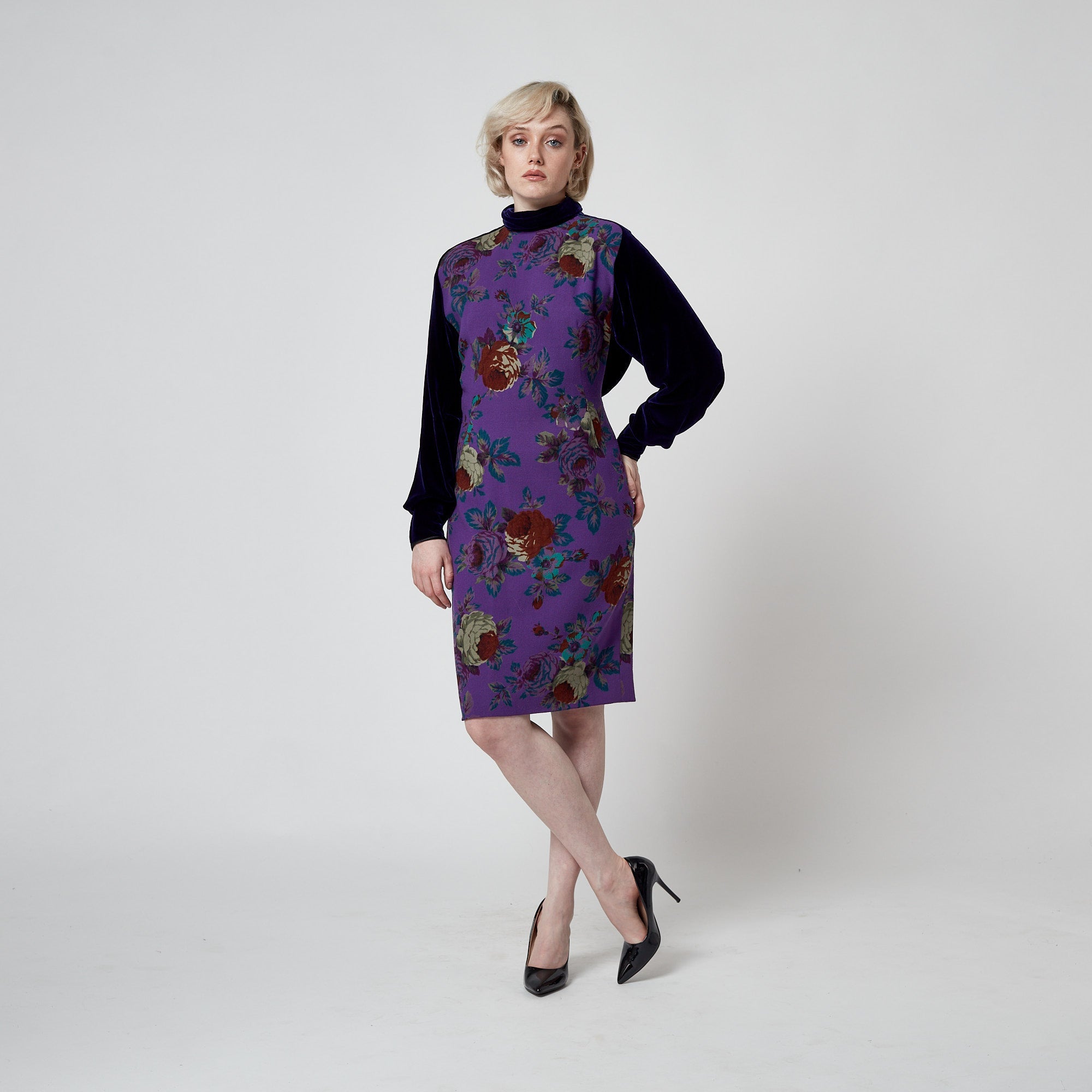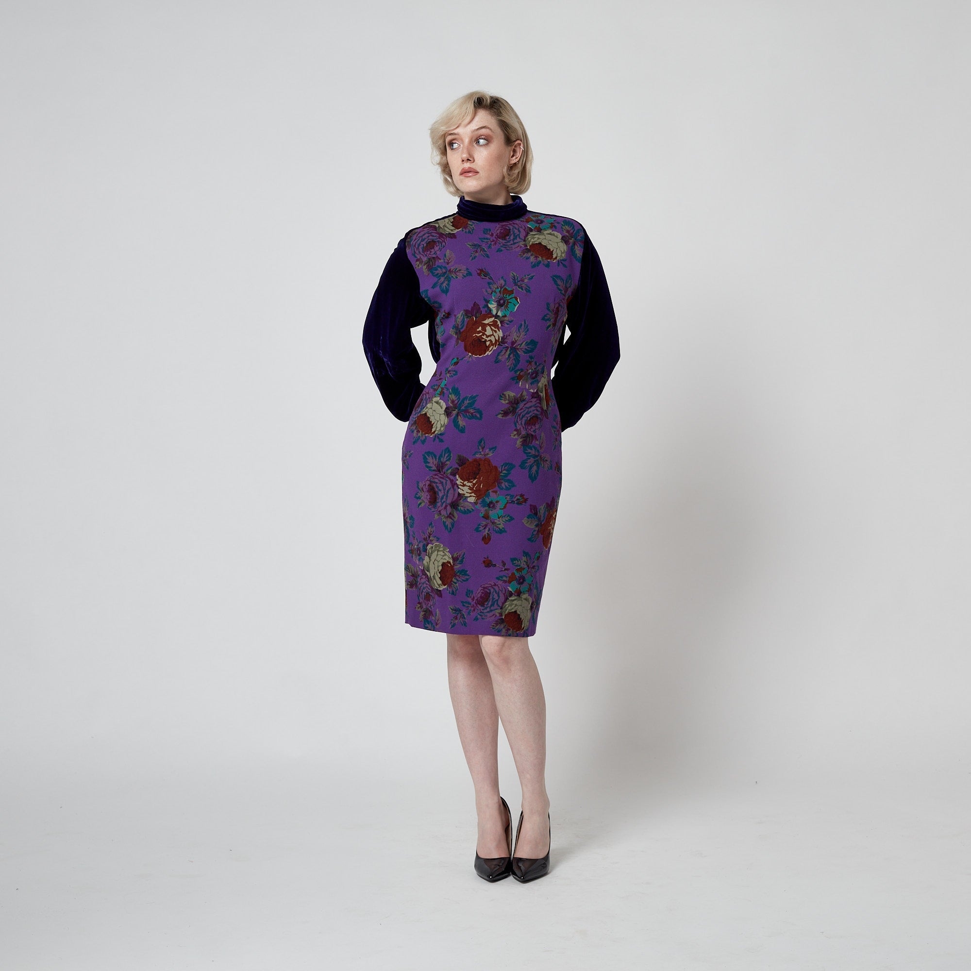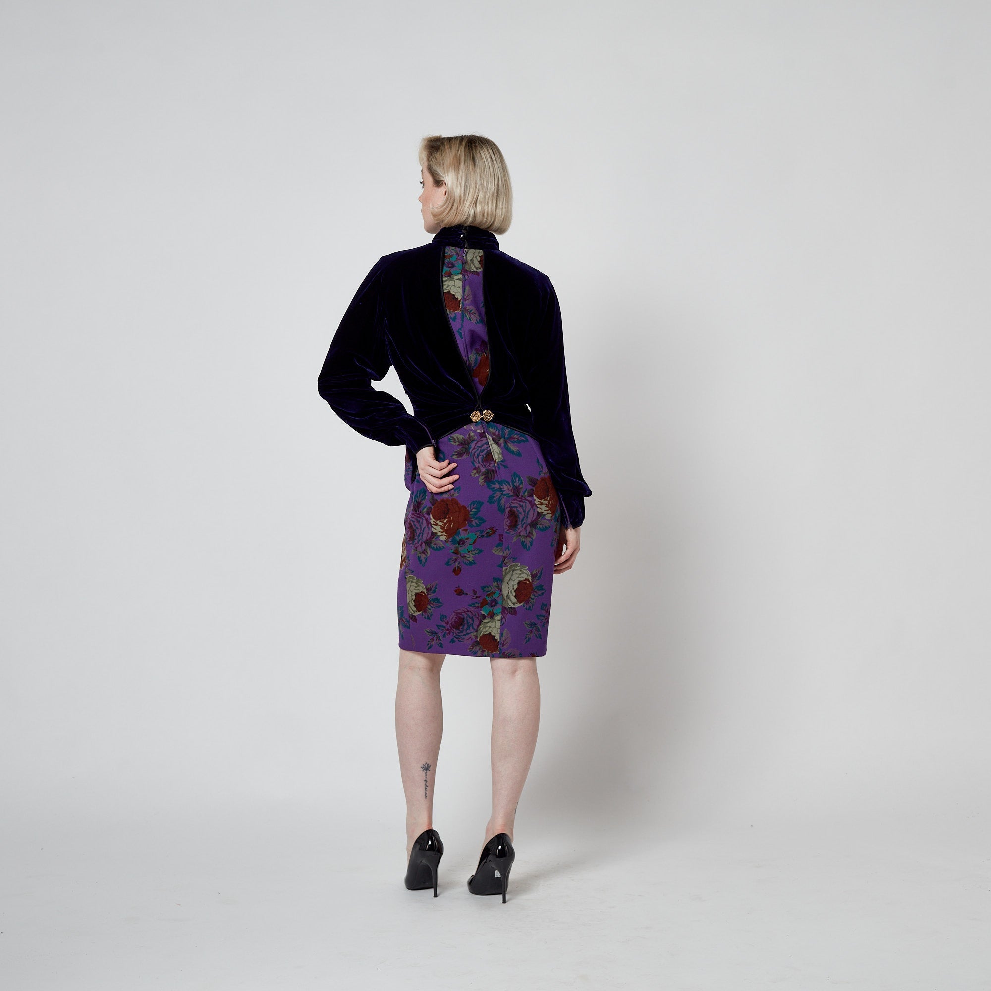 This vibrant dress was made in Italy during the late 1980s or early 1990s and was created as part of the brand’s “Parallele” line which was Ungaro's high-end ready-to-wear clothing. It is tailored from a thick crepe wool which is printed with florals in rich tones of russet, teal, aubergine and sage. The dress has a curve-skimming hourglass silhouette and falls to below the knee. It has a raised neckline and long sleeves crafted from a deep purple velvet which is buttery soft. At the back the purple panels at the neck and sleeve give way to a tromp l’oeil jacket. The fabric of the faux-jacket is gathered at the centre bottom of the back where it joins with an elaborate gold clasp with two intricately carved, heart-shaped gold buckles, alongside a small hidden hook-and-eye. The dress is lined in rich purple satin throughout for a comfortable, luxurious wear. It fastens at the back of the neck with three black buttons and fabric loops, and below this the dress is secured with a hidden purple zip.