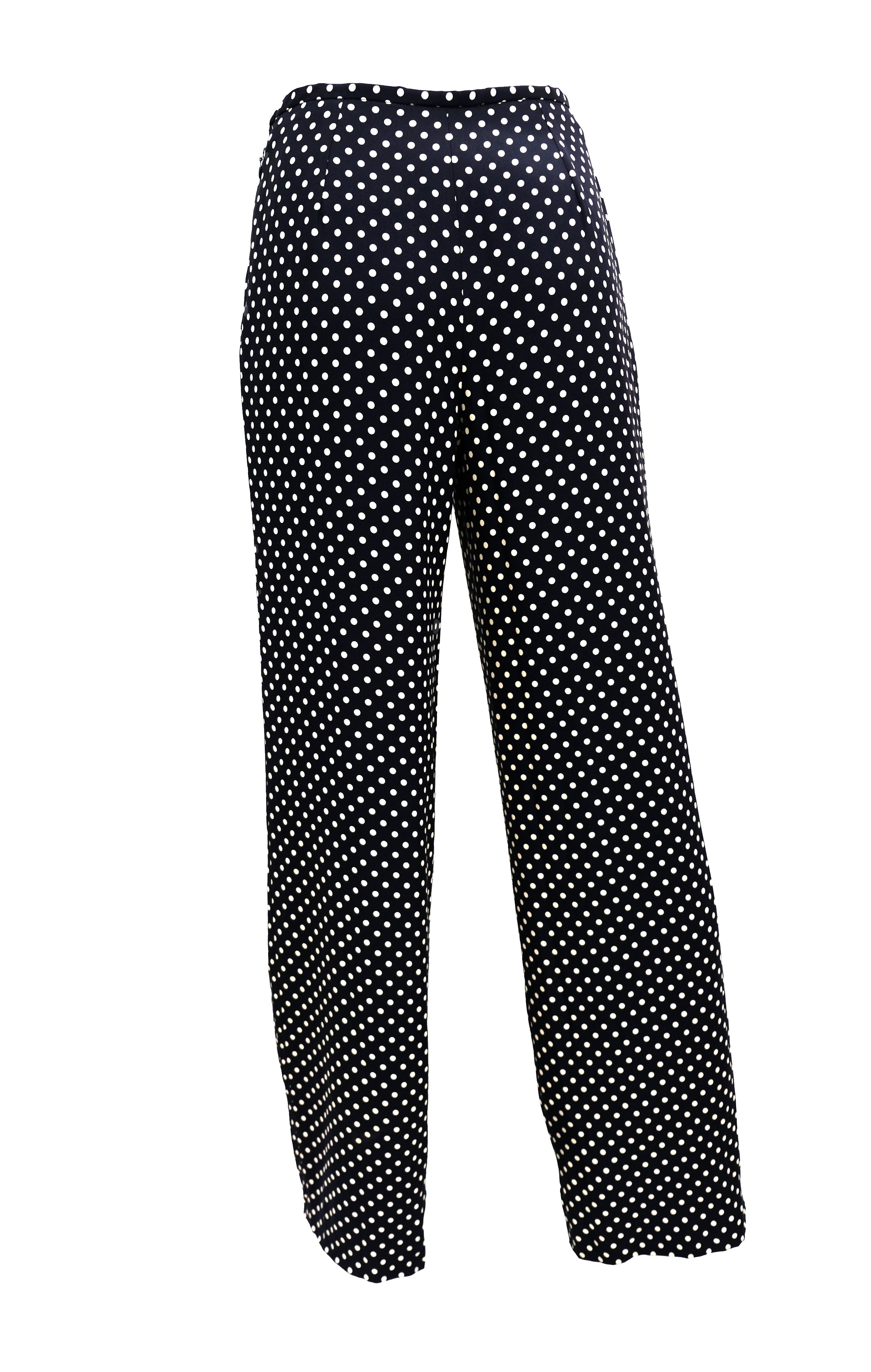 A classic pair of 1980s vintage wide leg trousers by Emanuel Ungaro, in ivory on dark navy polka dot fabric.