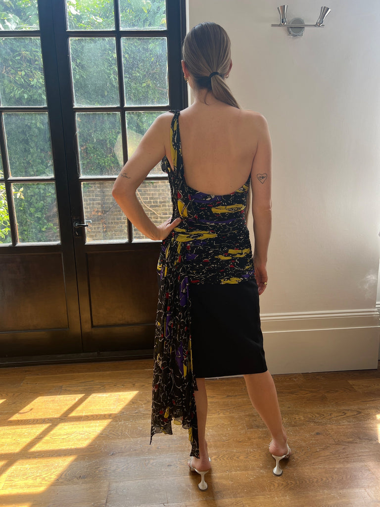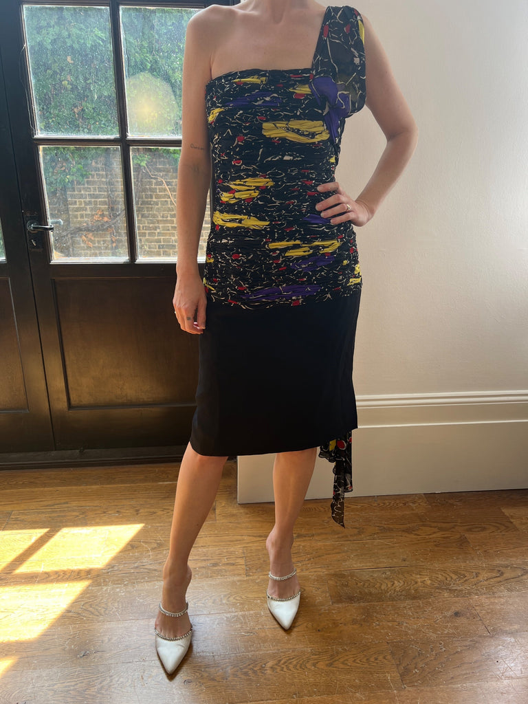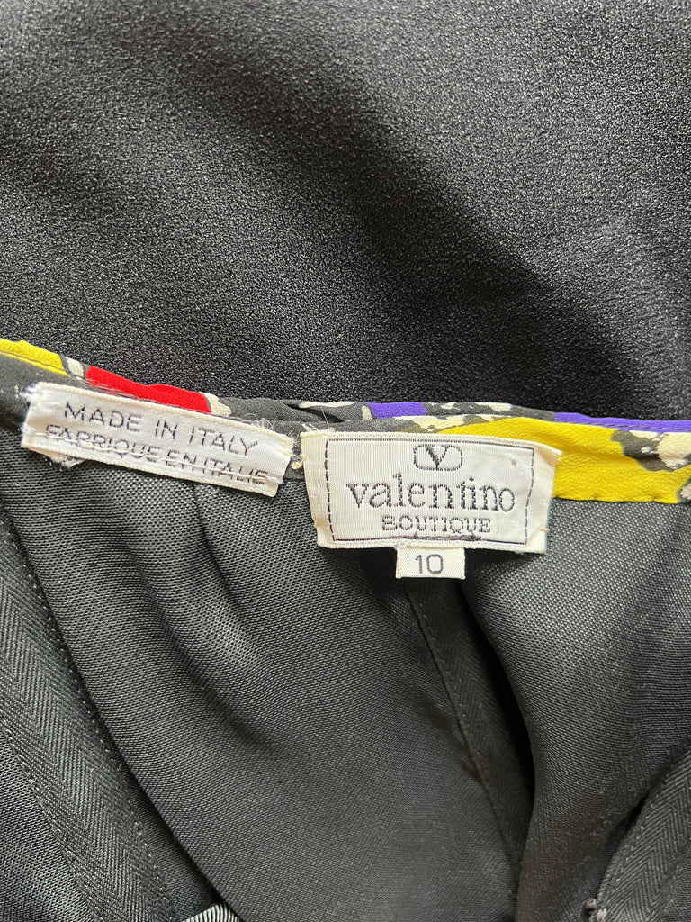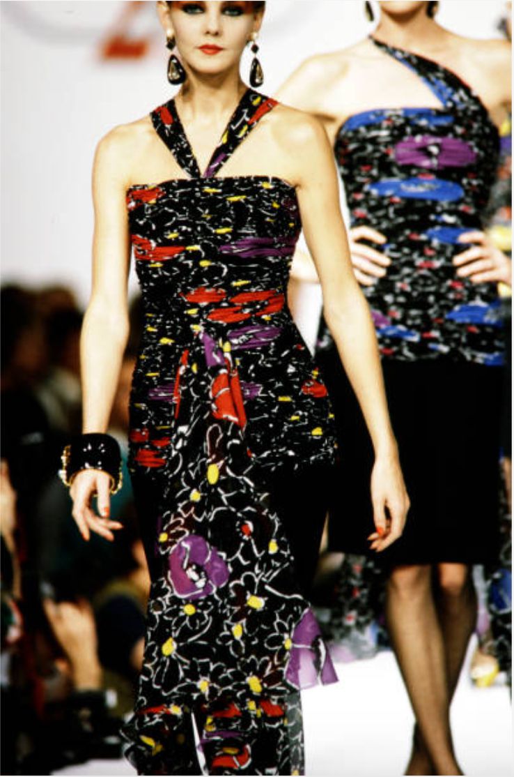 Made in Italy, this vibrant patterned party dress walked the runway for Valentino’s Spring 1985 collection. At the bust, a frothy chiffon overlay sits over a simple strapless dress silhouette. The black chiffon is patterned with painterly florals in white outlines splashed with the primary colours: red, blue and yellow. This memorable fabric is also seen in the couture collection from the same year. Stunningly crafted, the bodice is boned all the way around and is fully lined with thick black canvas. There are modesty straps to help cinch the waist further. The skirt falls straight in a pencil style and has a small pleat at the rear for ease of movement. In a flamboyant flourish typical to this collection, the dress is adorned with a large sash in coordinating patterned chiffon. This sweeps over the shoulder to form a one-shoulder silhouette and attaches at the lower back - it can be styled in different ways, straight over the shoulder or at an angle as seen on the runway. A wide train of chiffon falls from this point which flares out behind the wearer as they walk - or dance. It fastens under the arm with a hidden black tonal zip and hook-and-eye clasp.