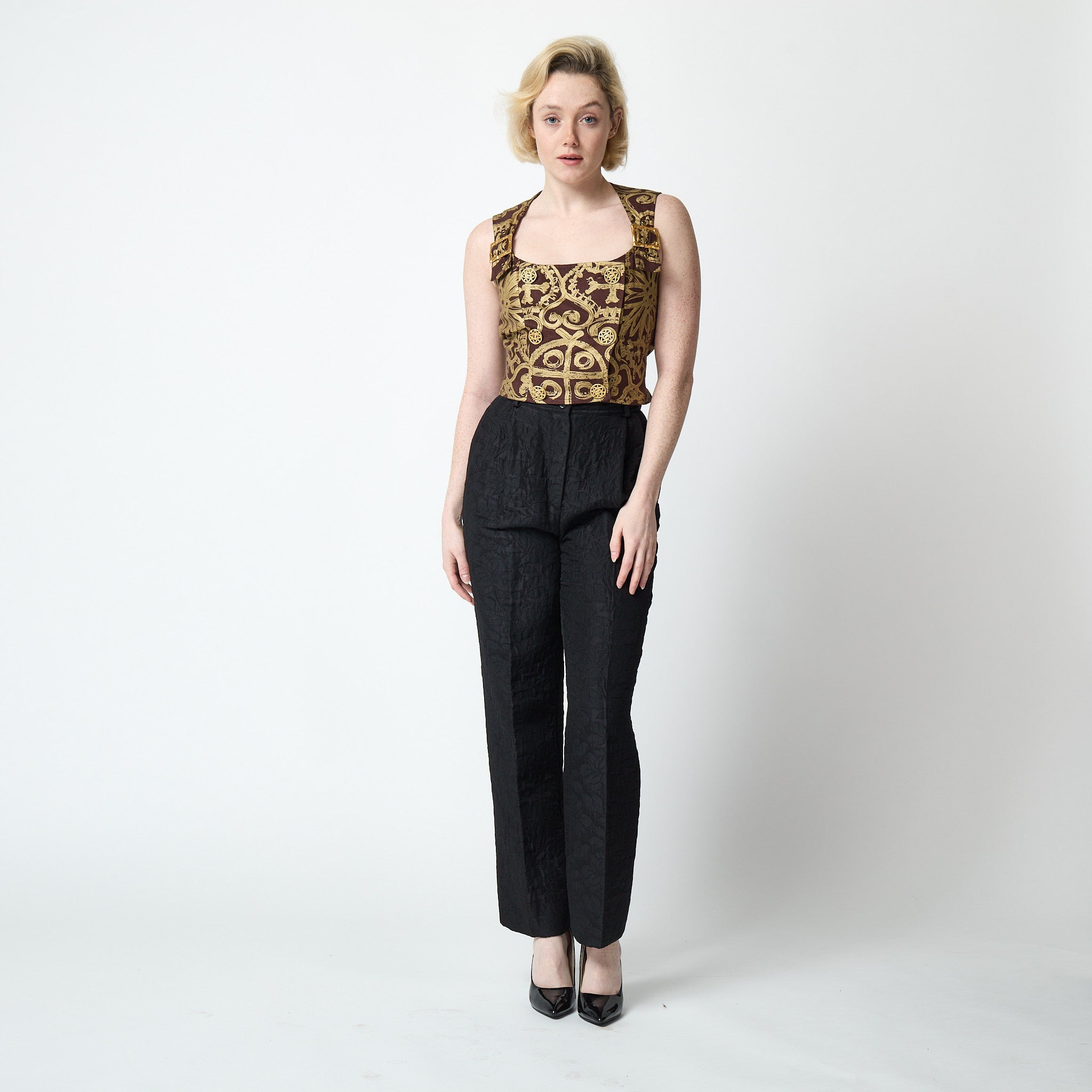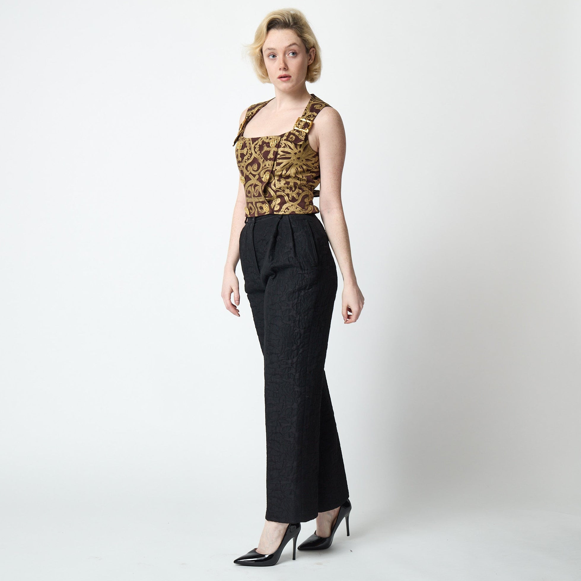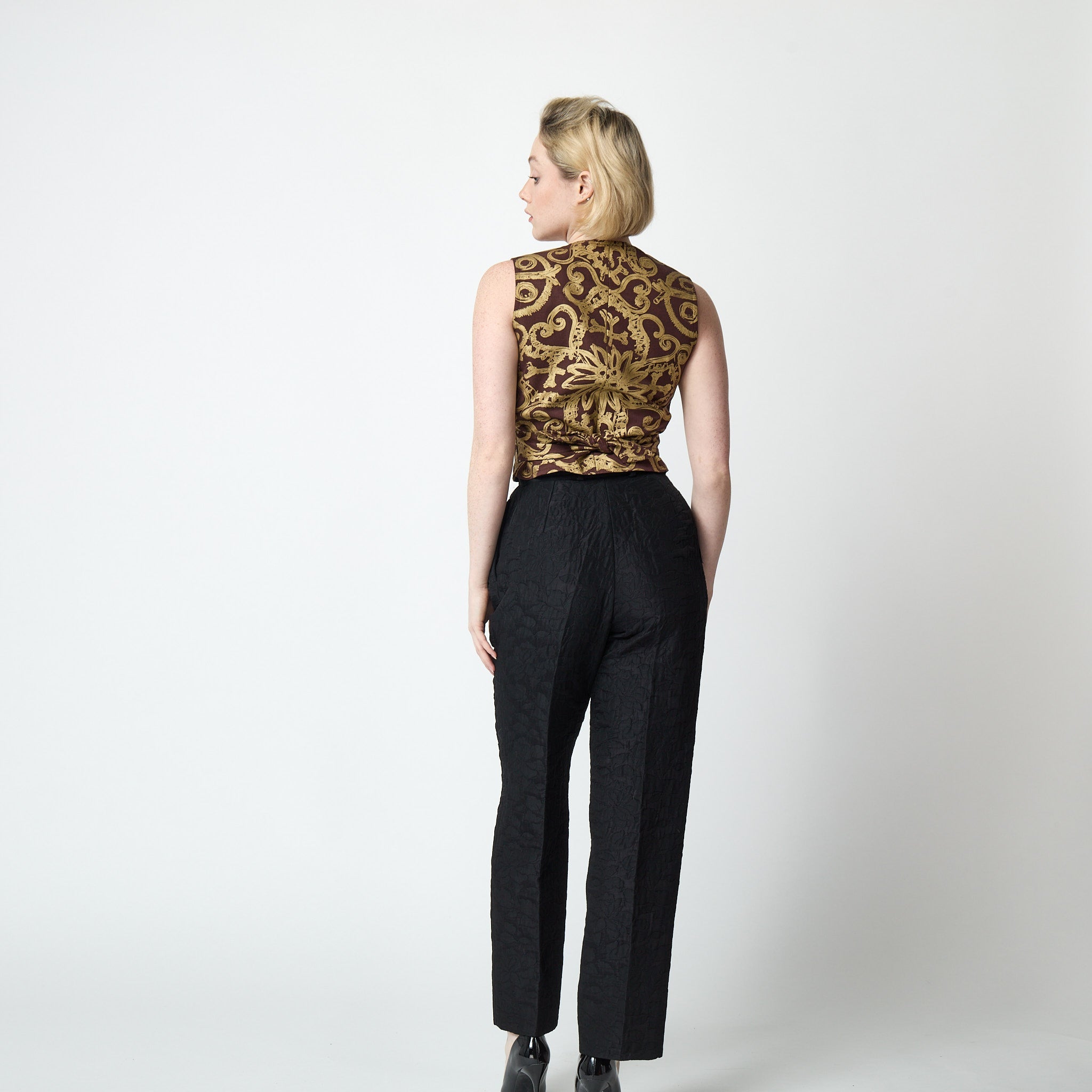 Italian designer Valentino Garavani launched diffusion line, Miss V, in the 1960s. These trousers are a 1990s vintage and tailored from a thicker wool jacquard mix with a hint of stretch. Floral motifs - a signature of the playful Miss V line - are woven across the cloth. A double-pleated, high waistband creates a flattering and tapered silhouette. Belt loops are cut from coordinating cloth. There are two buttons and a hidden zip closure at the waist and in-seam pockets sit on the hips. The original label reads “Made in Italy”. These trousers are in great vintage condition with no flaws and a best fit for a UK 6-8 or US 2-4. Of note, the trouser hem is very long, around 4 inches each leg, so these can be fully adjusted without hem lines if necessary. Our model's sizes are: Bust: 33" (84cm), Waist 26" (66cm), Hips: 34" (86cm) and 5' 7" (170cm) and she's a size UK 6-8, US 2-4. These trousers were a great fit on her.