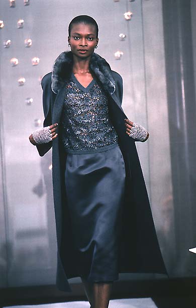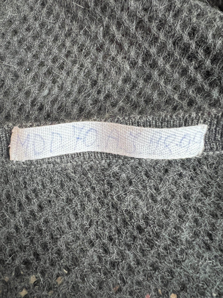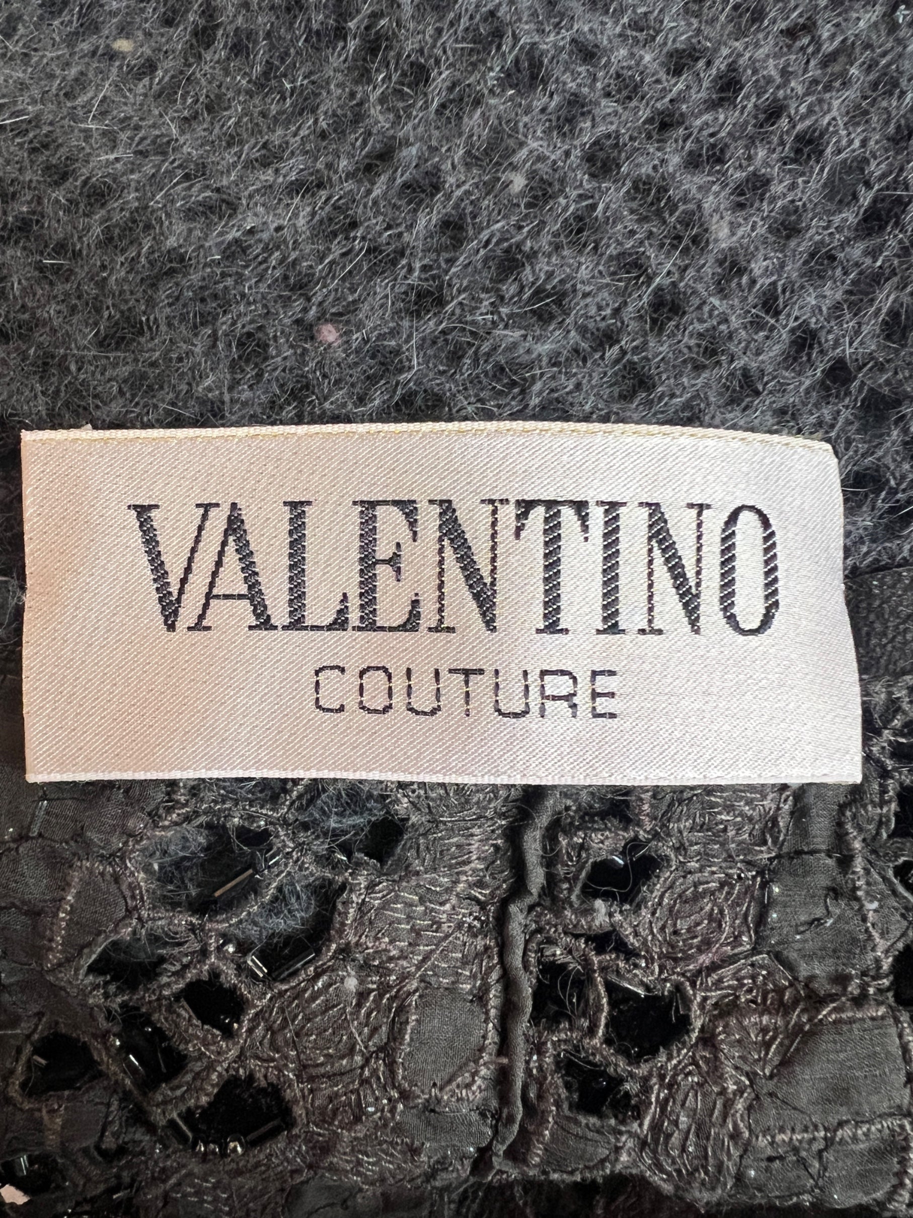This elaborate, runway documented knitted top was designed by Valentino Garavani for the Fall 1998 / 1999 Haute Couture collection. The hand-written label inside the hem states "MOD 70" and the years ”98.99”. We believe this label indicates that this may have been the runway piece itself. Woven from luxurious super-soft cashmere, the knit across the body and sleeves is a loose chain stitch which creates a peekaboo effect that hints at whatever the wearer wears underneath. The thick hems are woven more tightly and are ribbed. Varying tones of pale-grey, charcoal and navy thread result in a dark grey-blue colour overall. The beadwork and embroidery on this couture top are exquisite. The front of the body has honeycomb-like detailing created from hexagons of iridescent black and silver beads. These sit on a patchwork of charcoal grey suede leather, occasionally embroidered with spirals of silver thread which shimmer as they catch the light. This jumper is unlined. The label reads “Valentino Couture”. Paired with a silk maxi skirt during the runway presentation, the top would look equally at home on the red carpet or paired with jeans and a blazer.