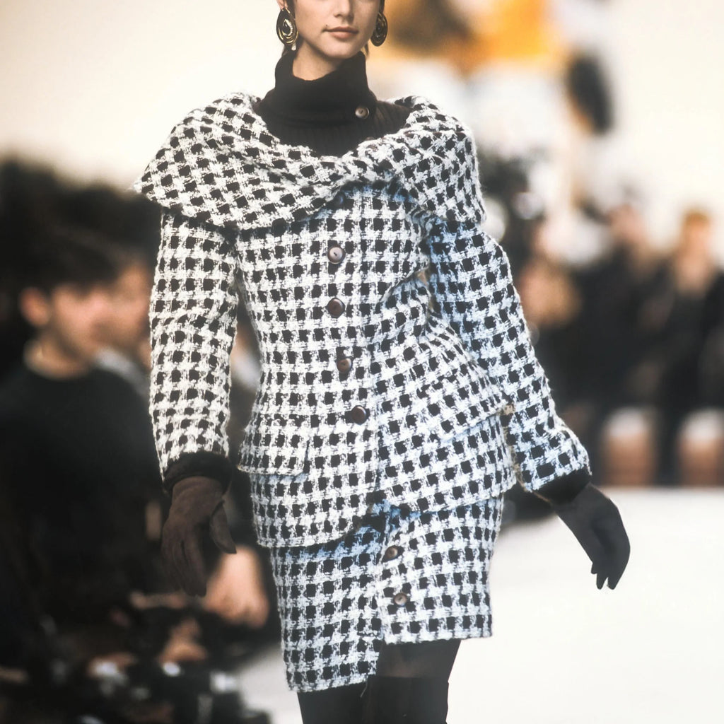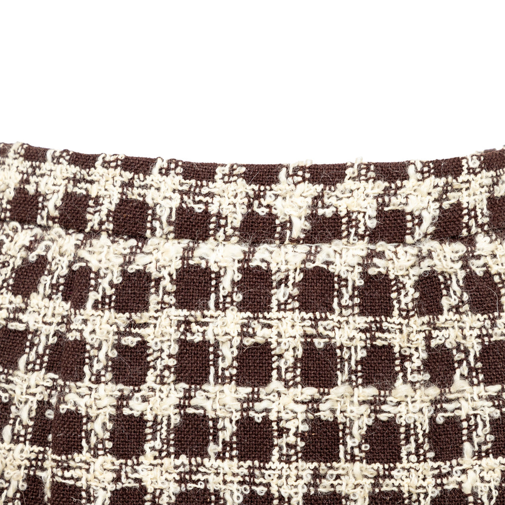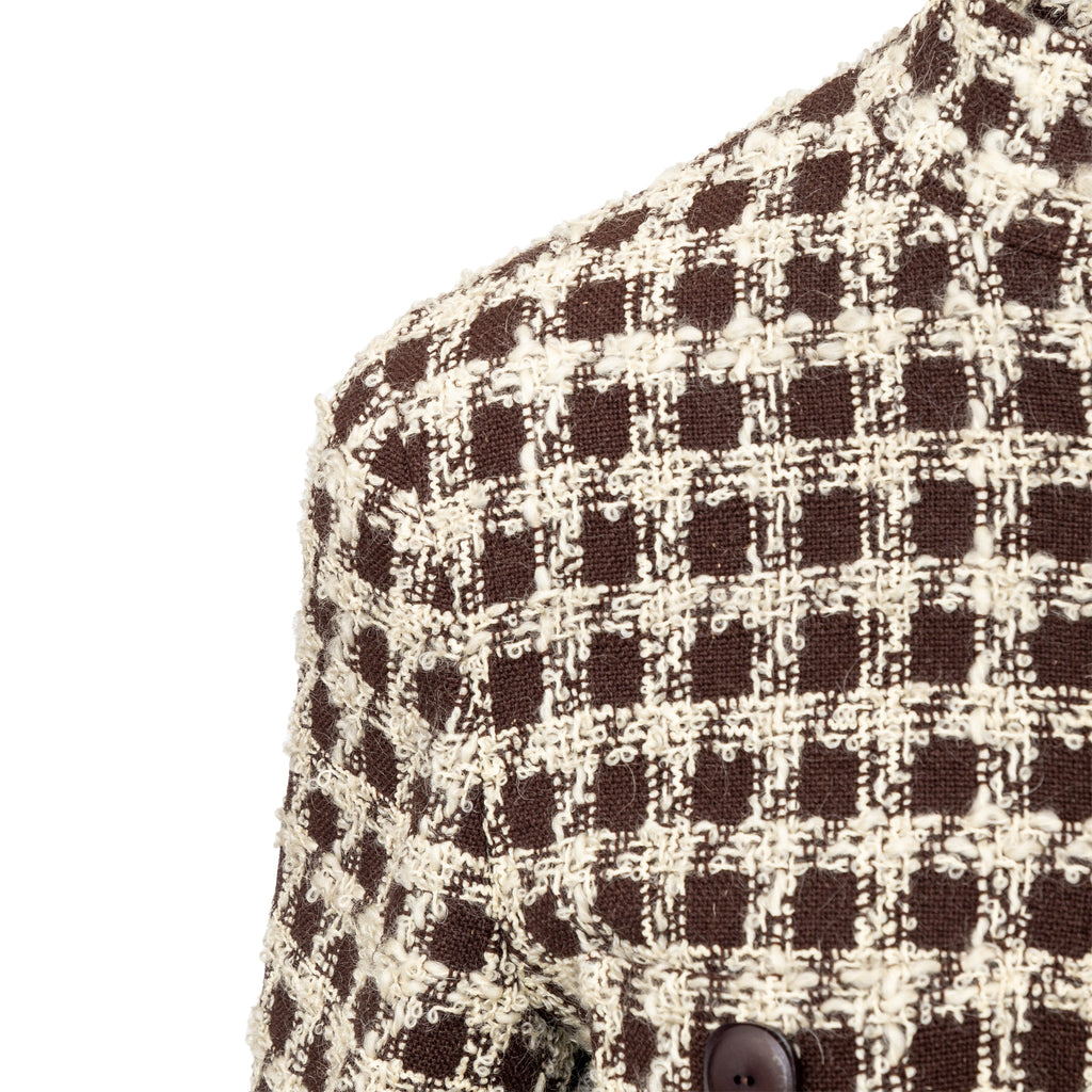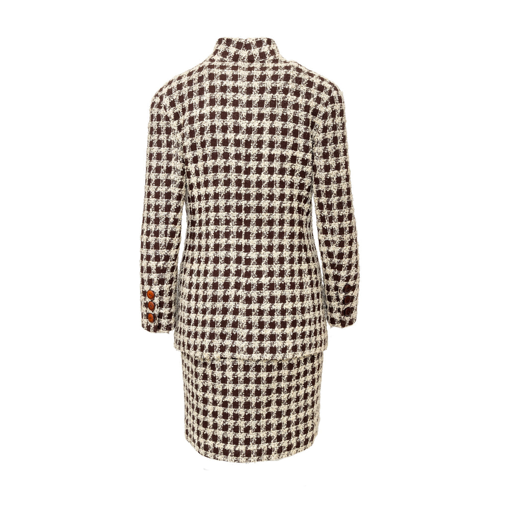 Valentino Boutique Checkered Set from the Fall 1991 collection, featuring white checkered design on brown wool. Includes a long jacket with high neck and buttoned midi skirt.