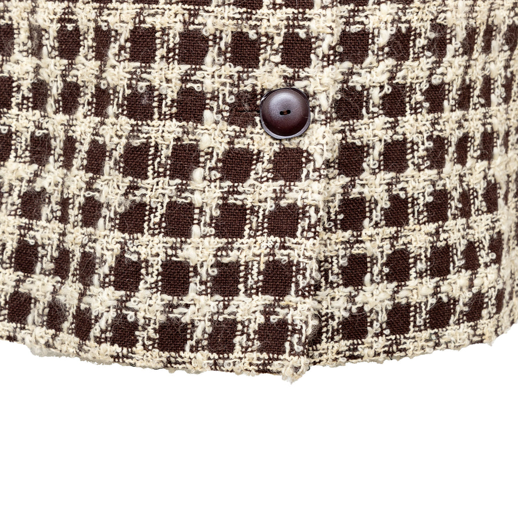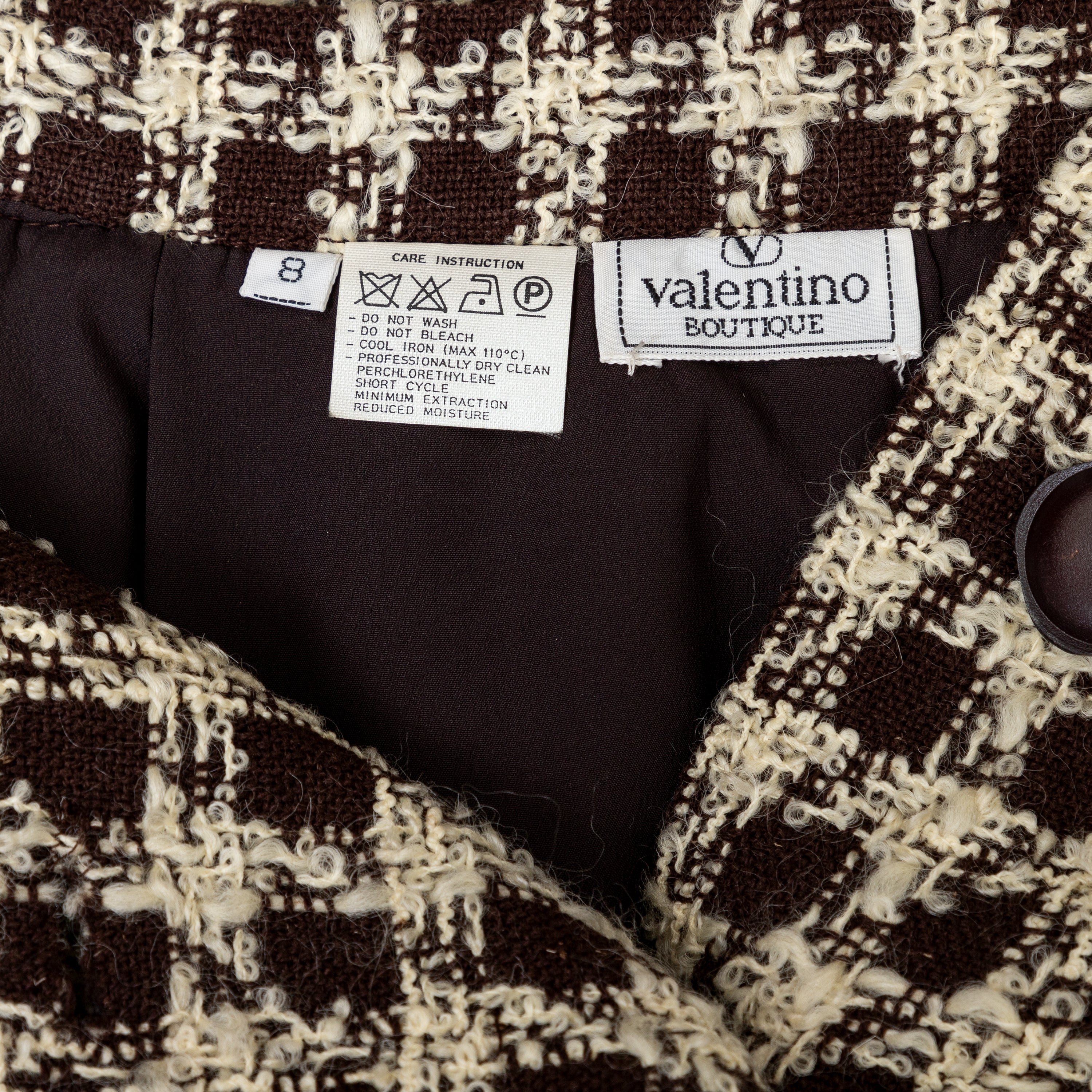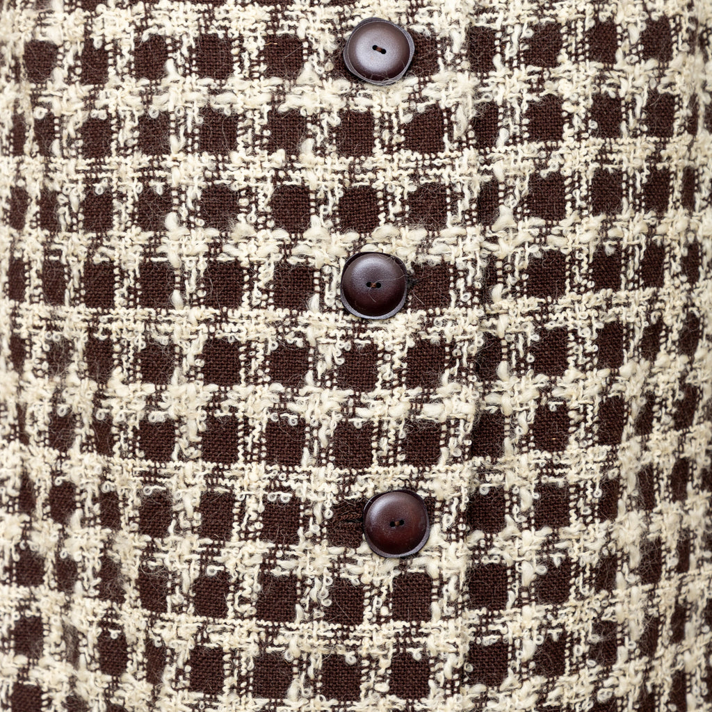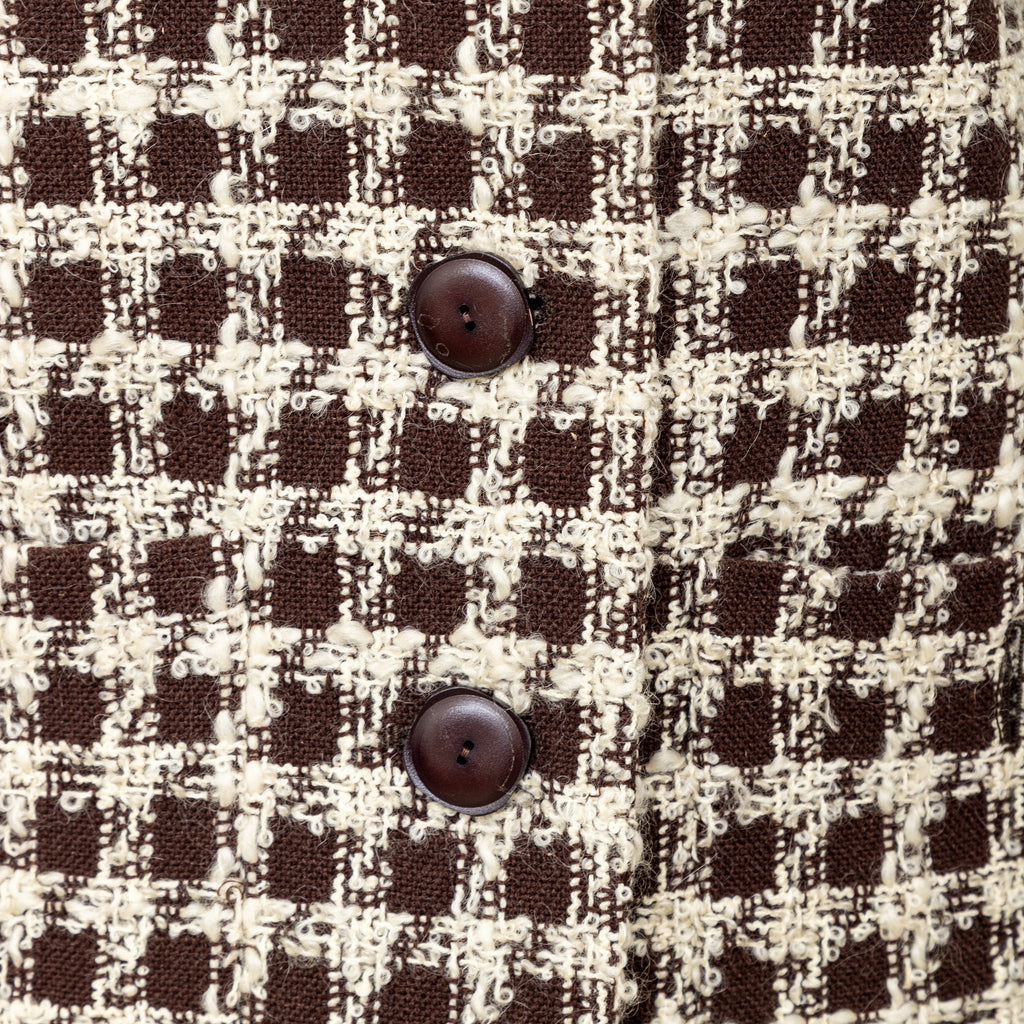 Valentino Boutique Checkered Set from the Fall 1991 collection, featuring white checkered design on brown wool. Includes a long jacket with high neck and buttoned midi skirt.