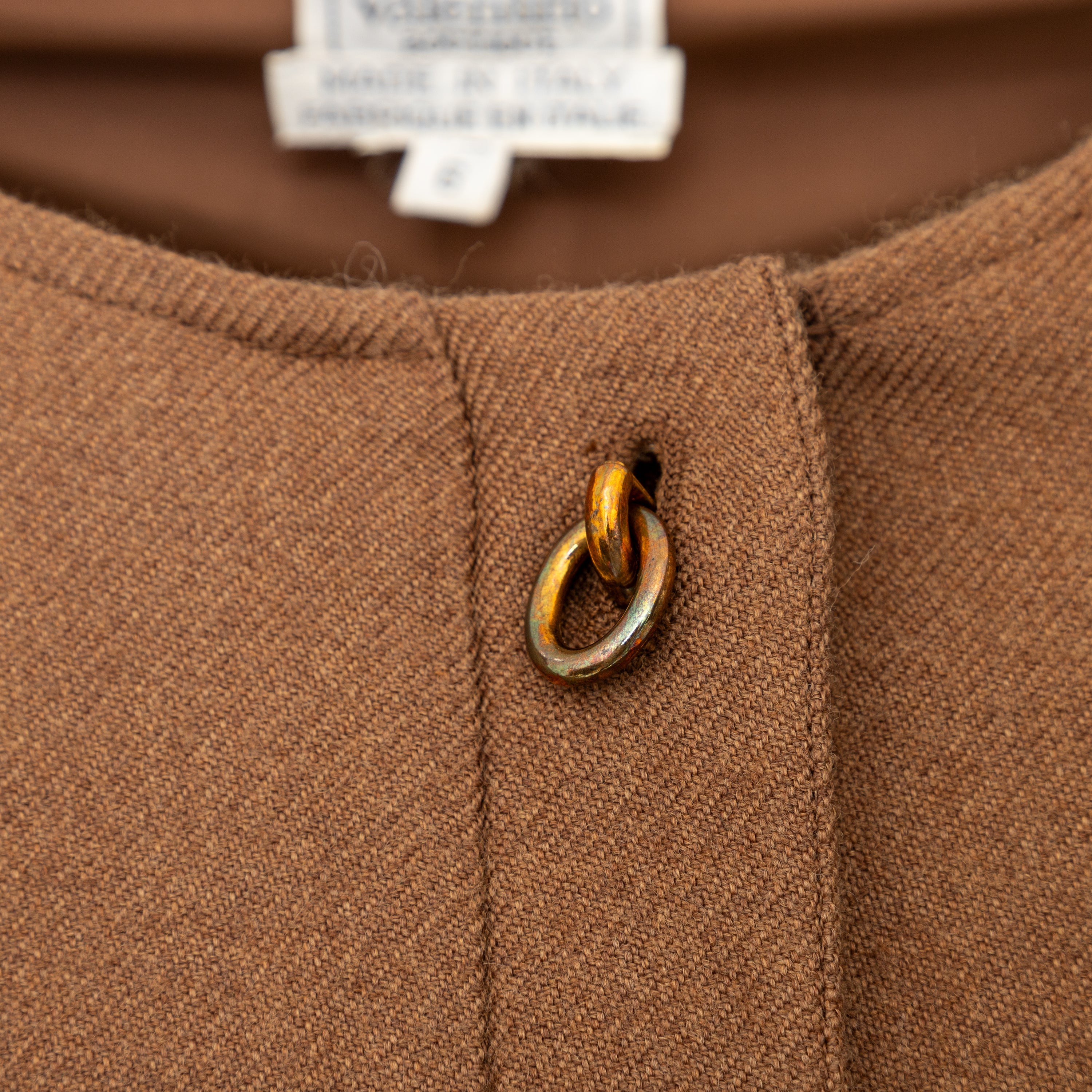Valentino Boutique 90s pleated wool dress in rich brown with a round neck, hidden buttons, decorative pockets, and chain-style detail for an elegant, refined look.