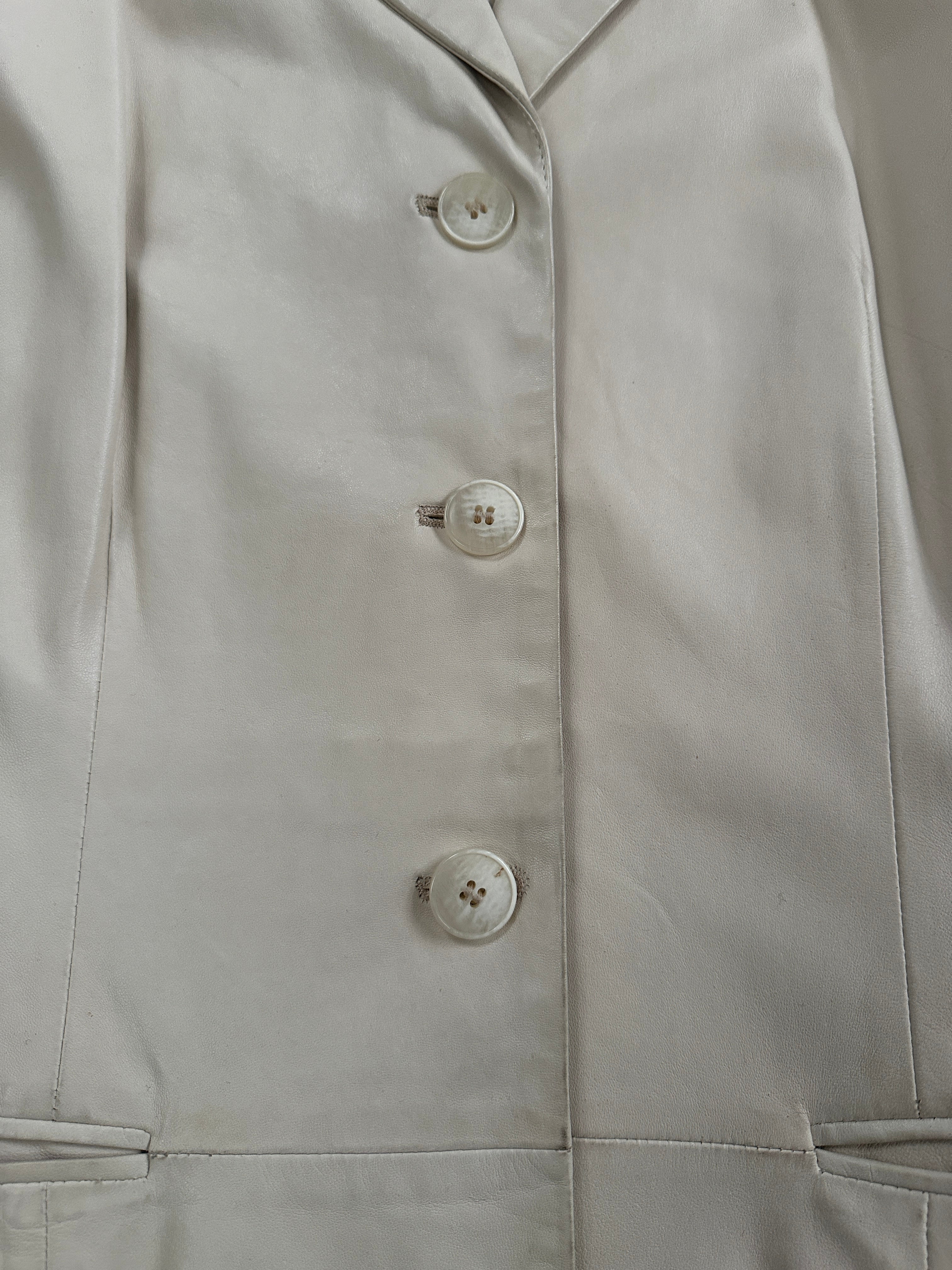 Vintage 1990s Gianni Versace cream leather jacket with a softly tailored silhouette and clean minimalist detailing. The smooth hand of the leather and the gentle shaping at the waist give this piece a quietly elevated finish.