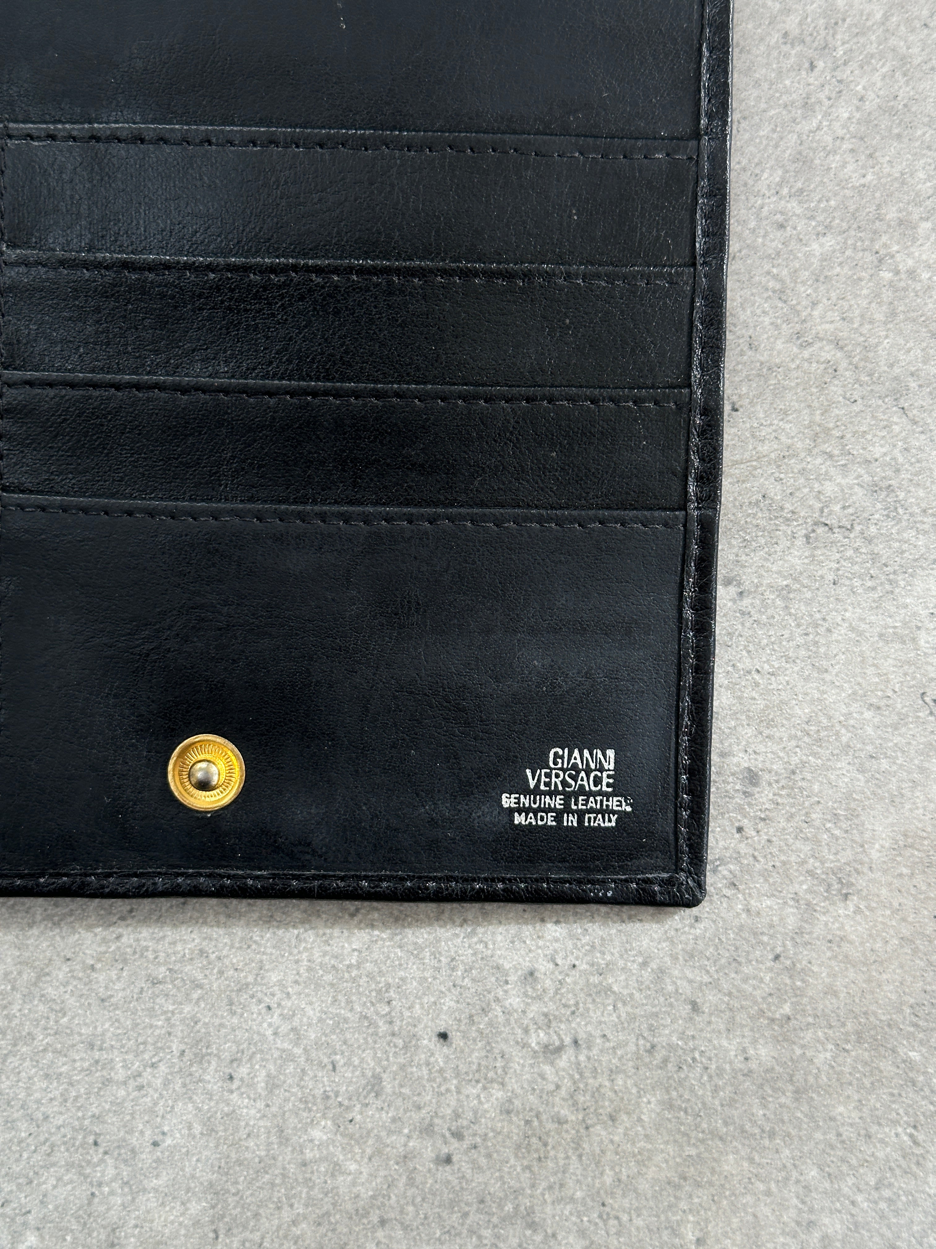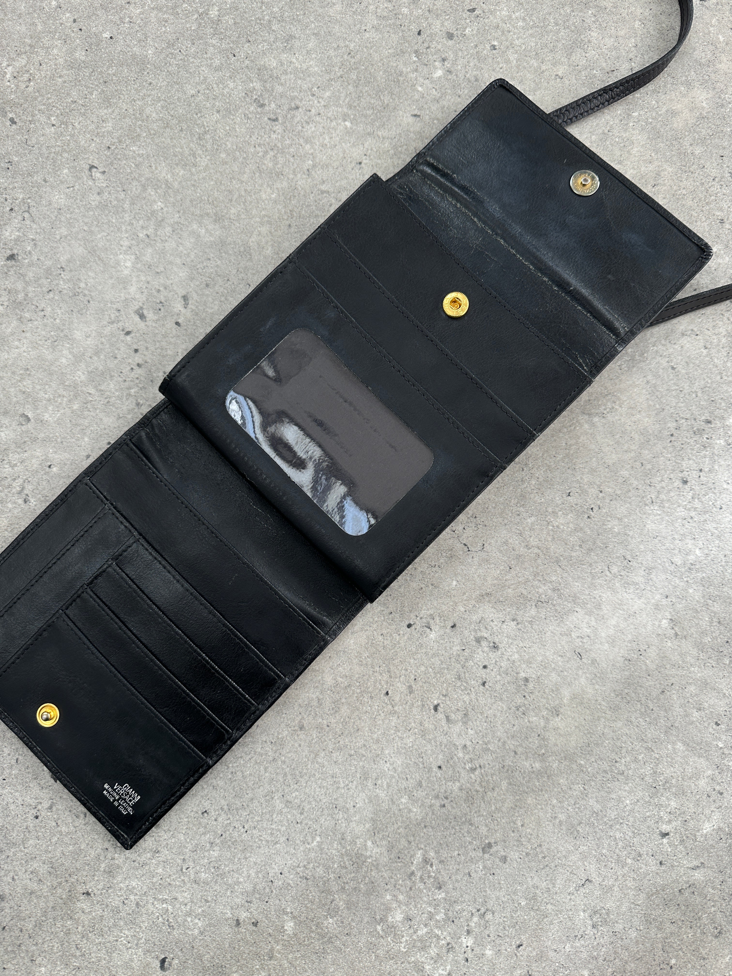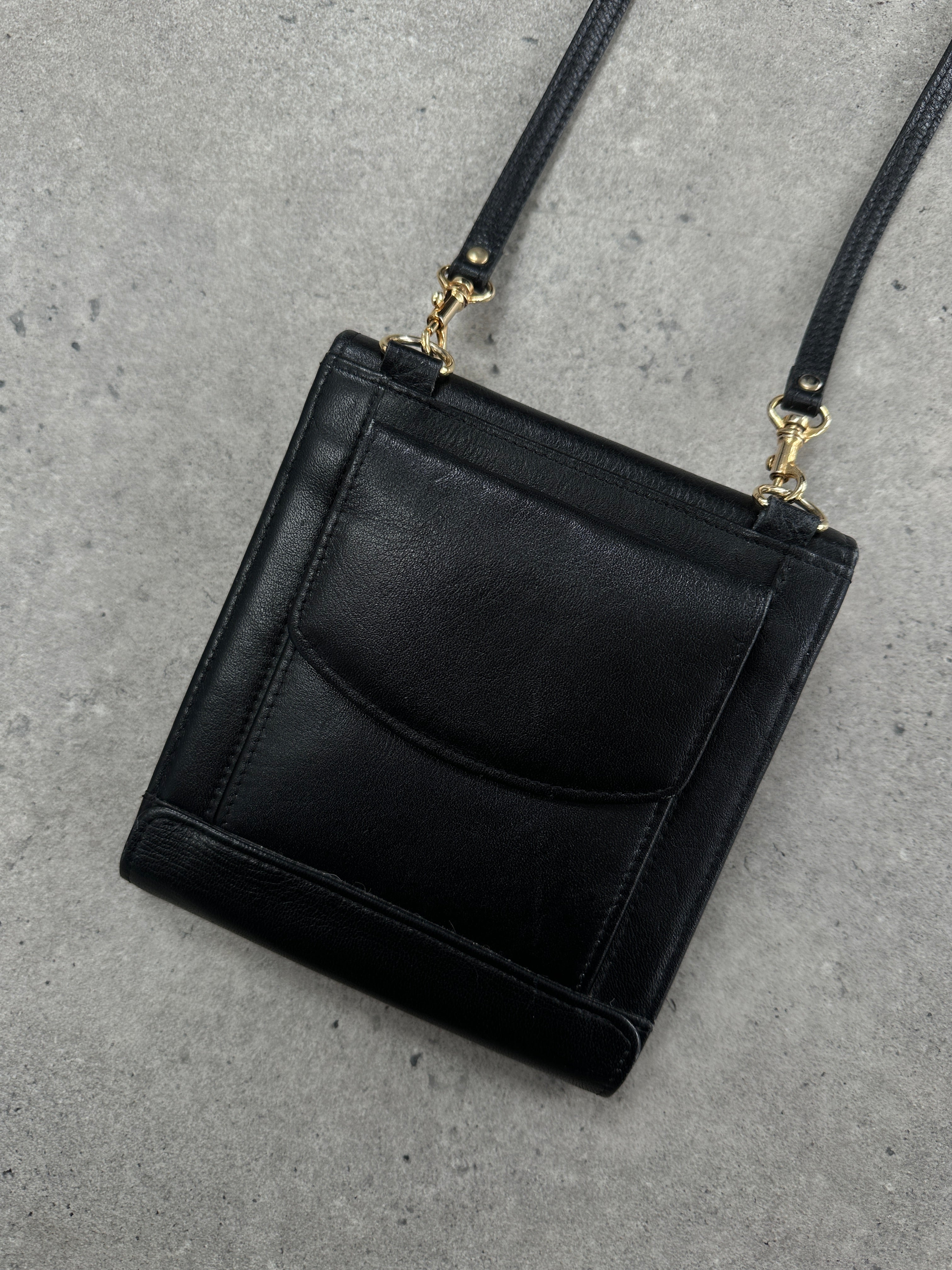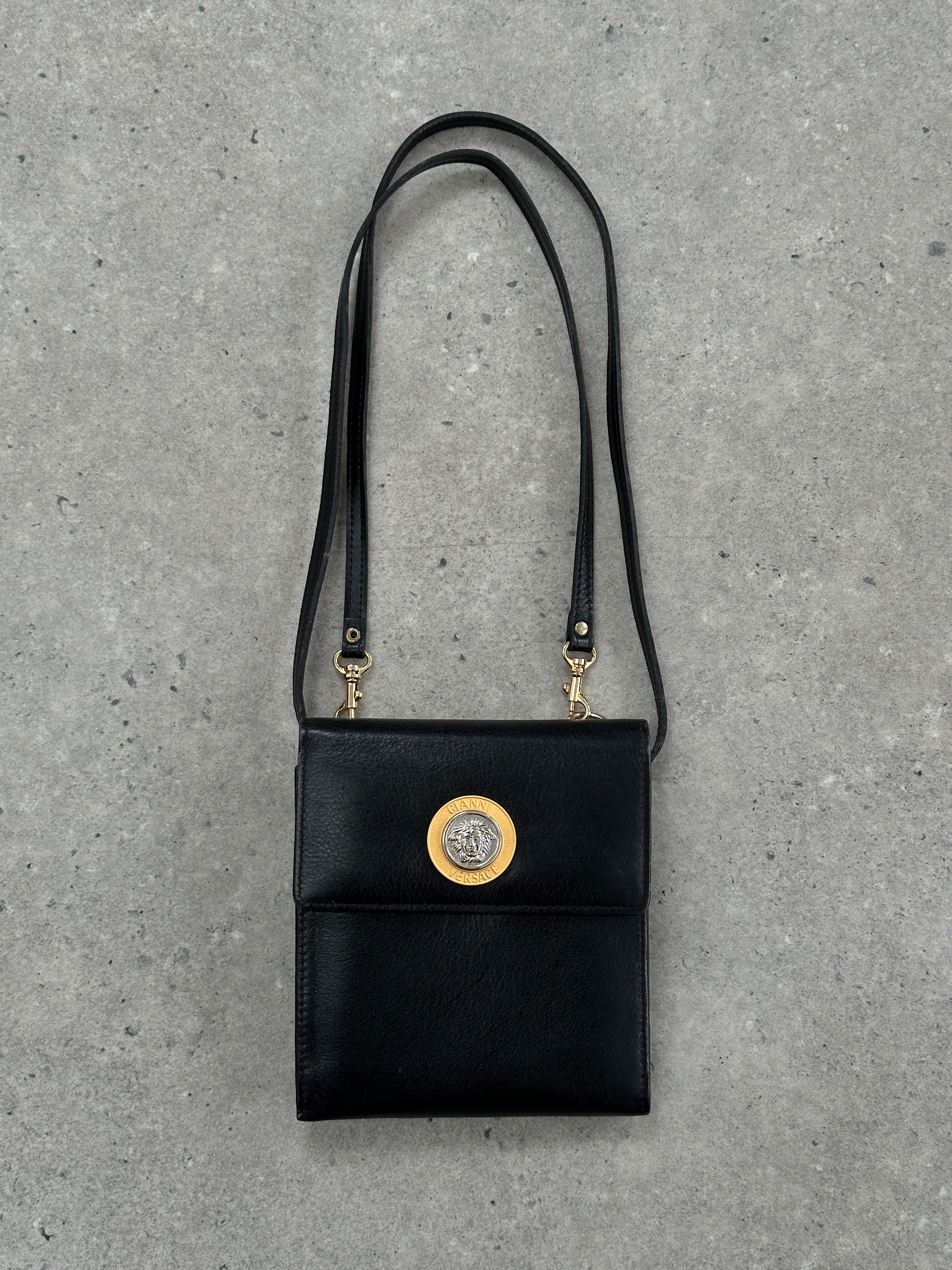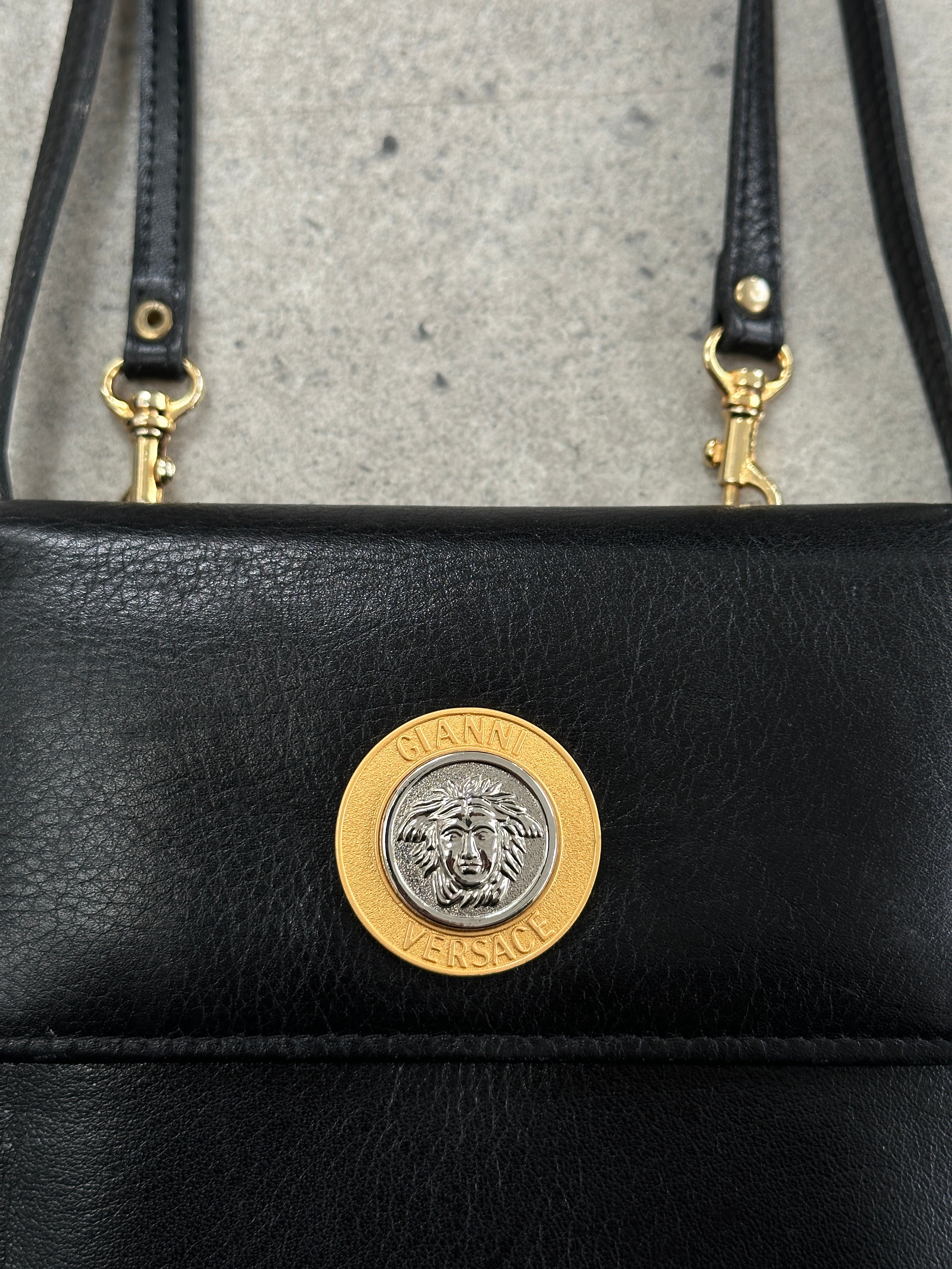 Early 1990s Gianni Versace leather crossbody with bold Medusa medallion, logo lined interior, and sleek structured boxy silhouette - a true vintage Versace statement piece.