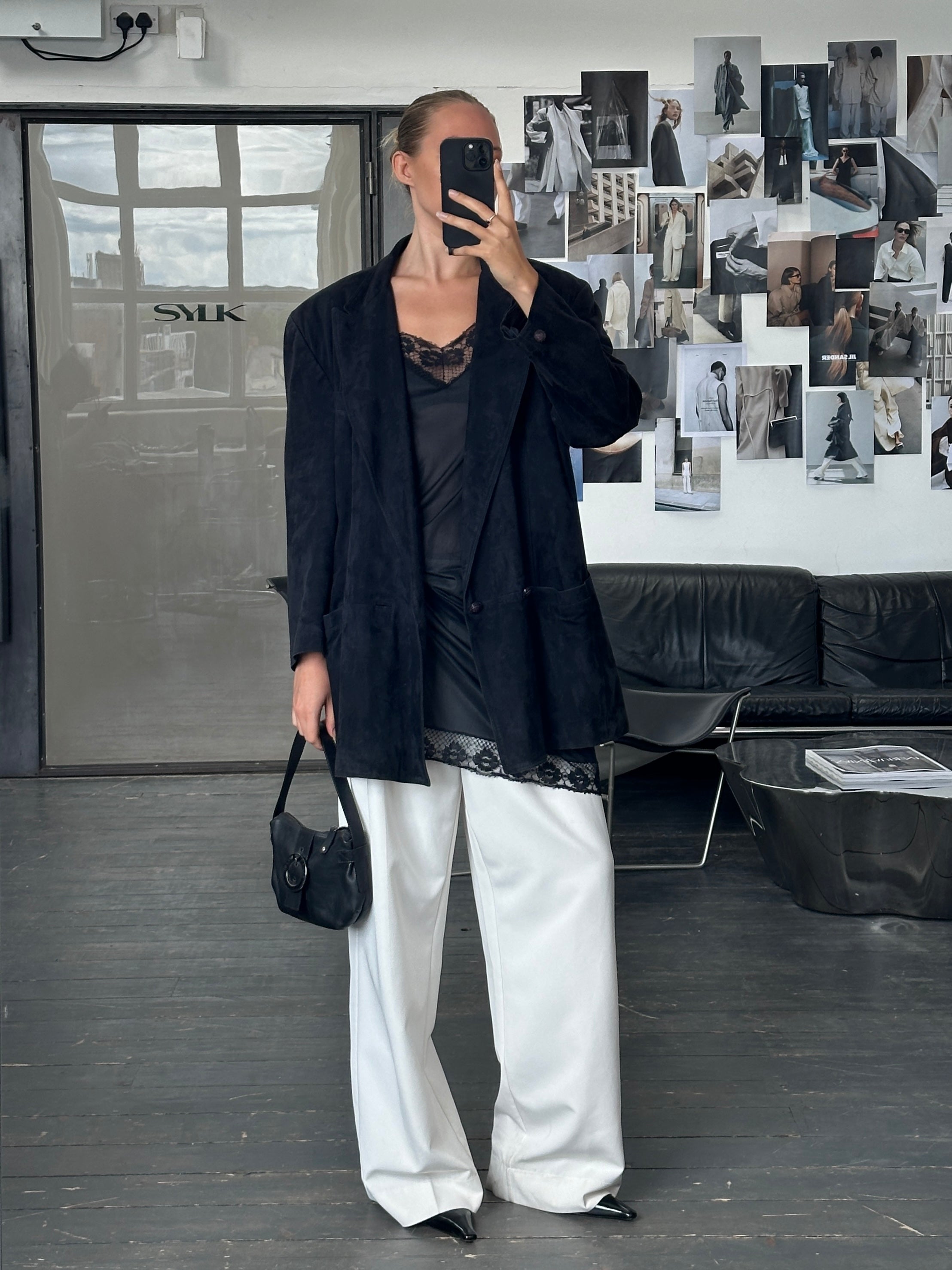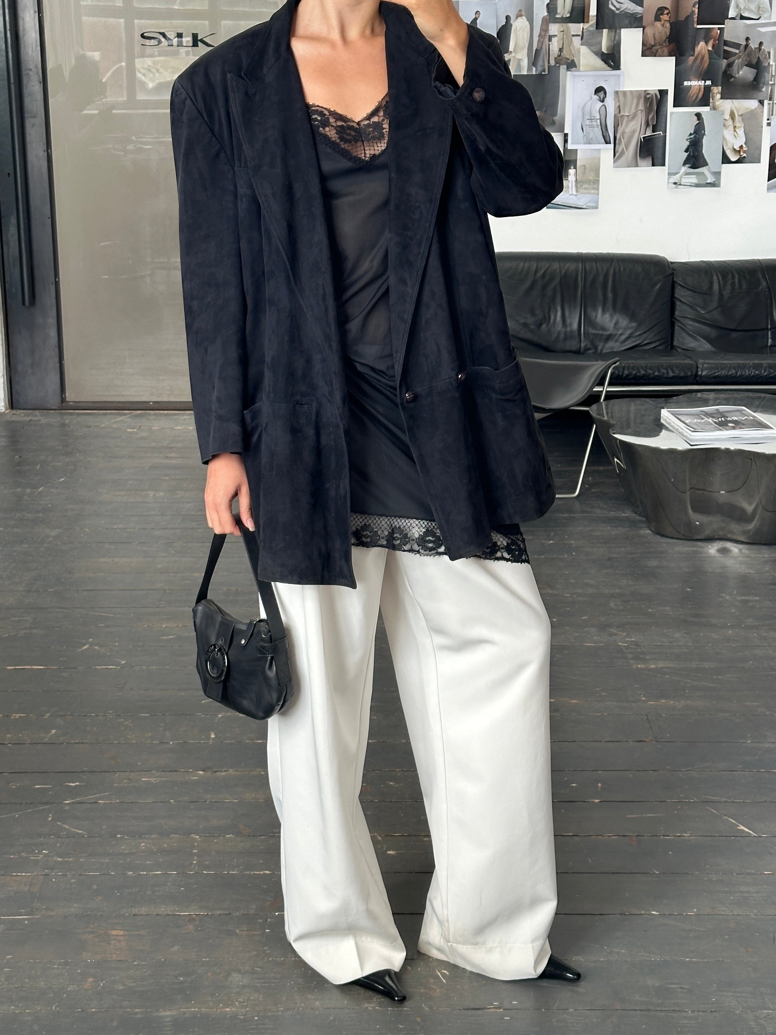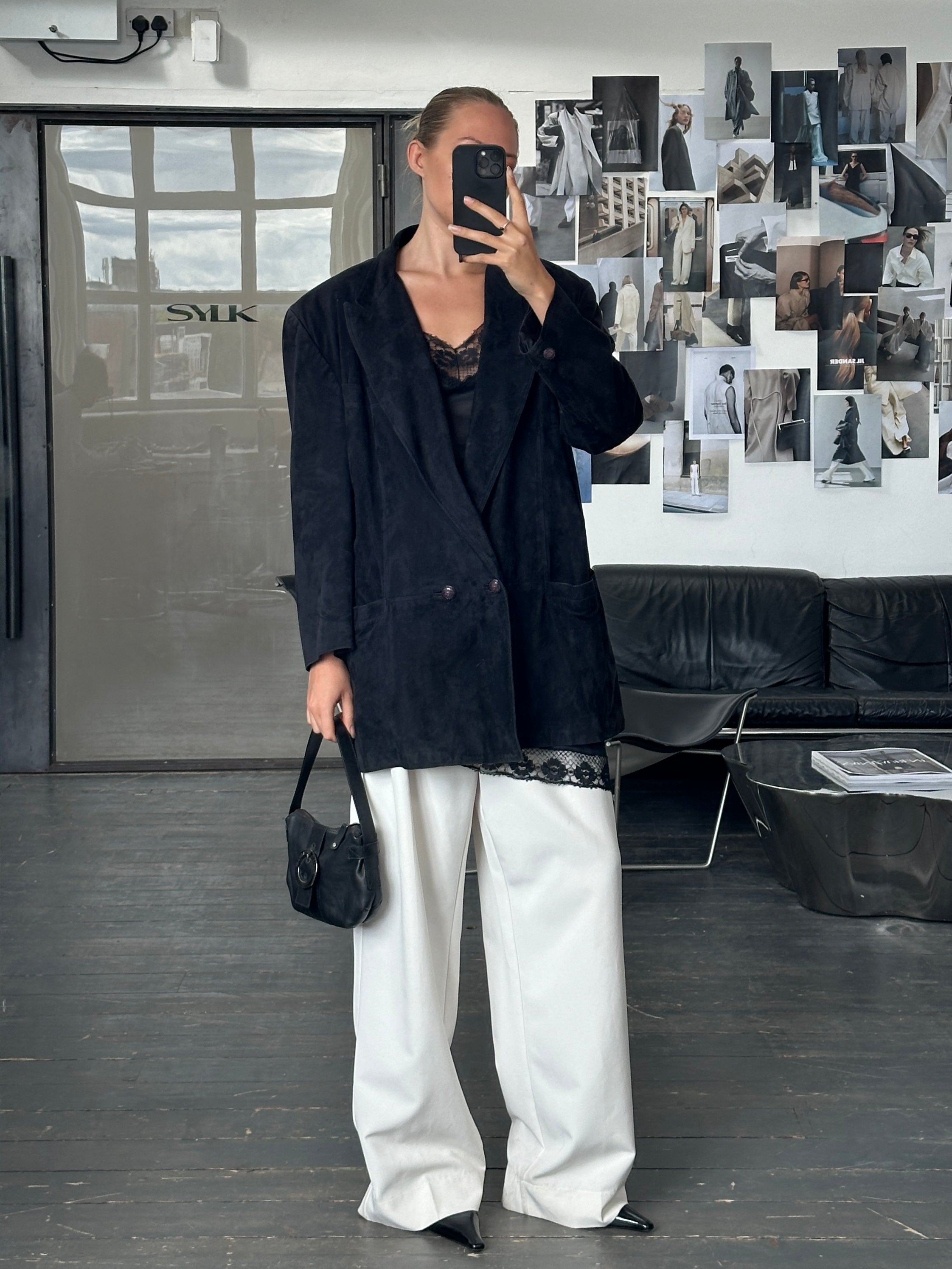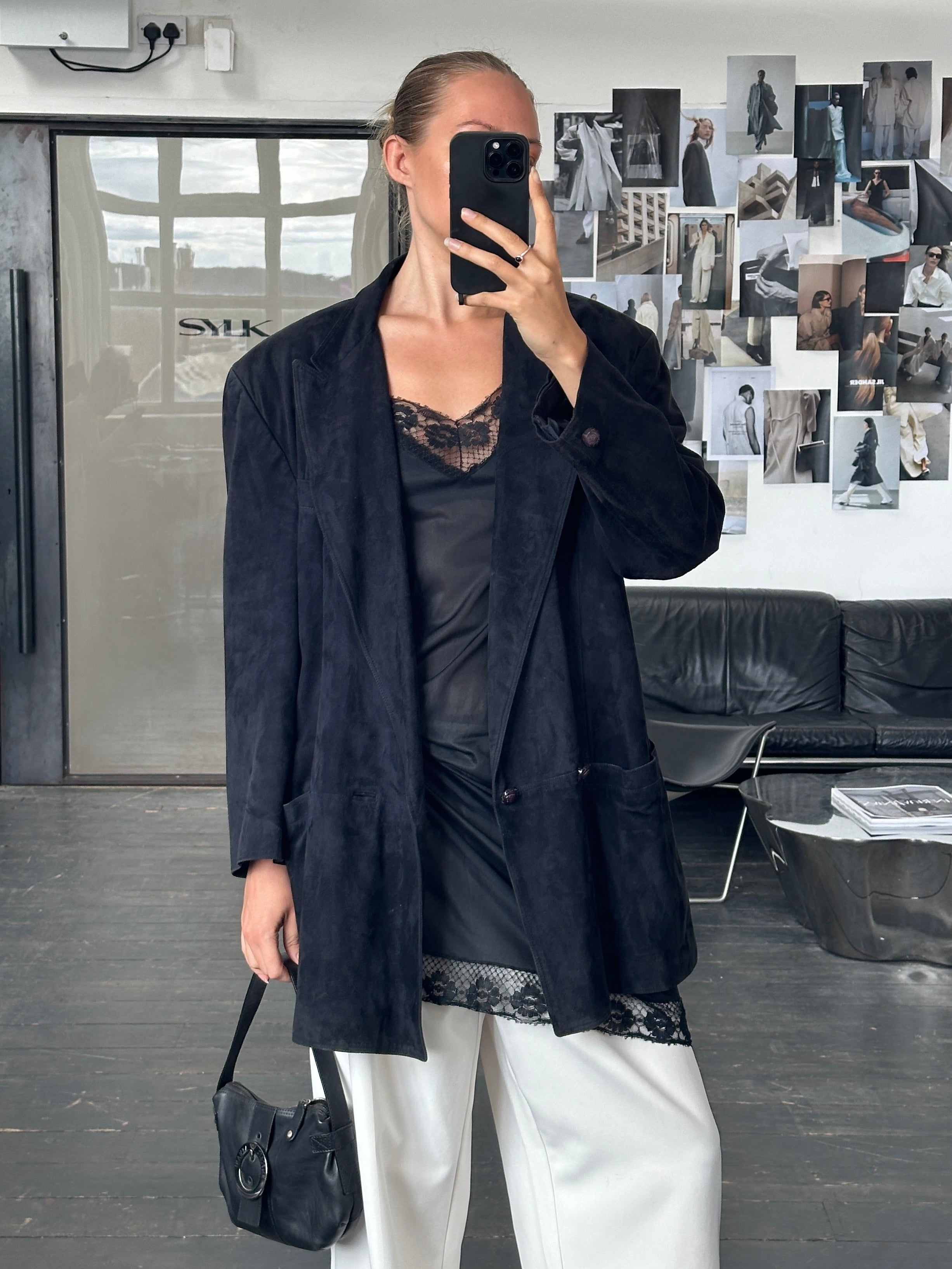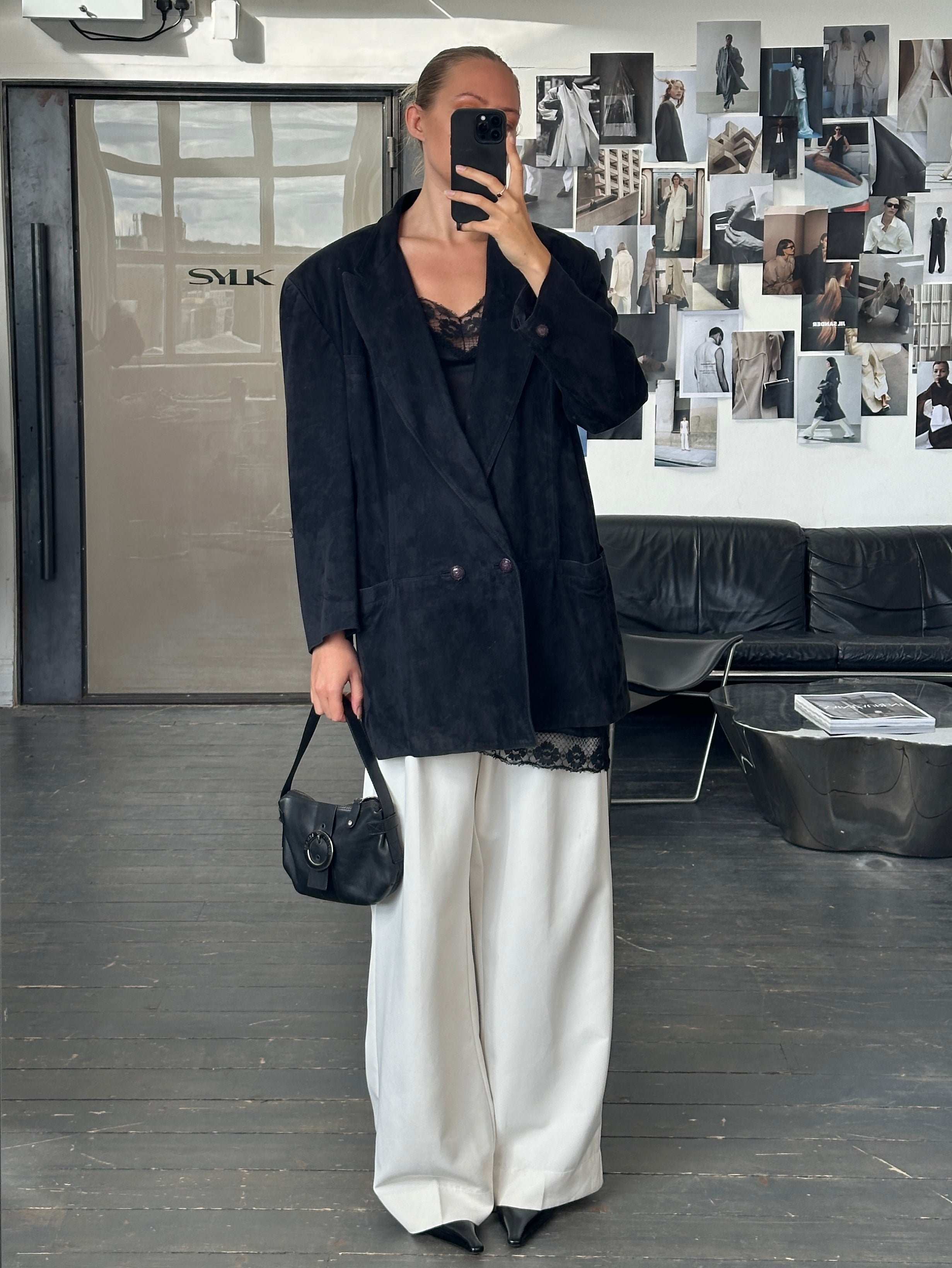 ~ Oversized suede double breasted jacket with peak lapels