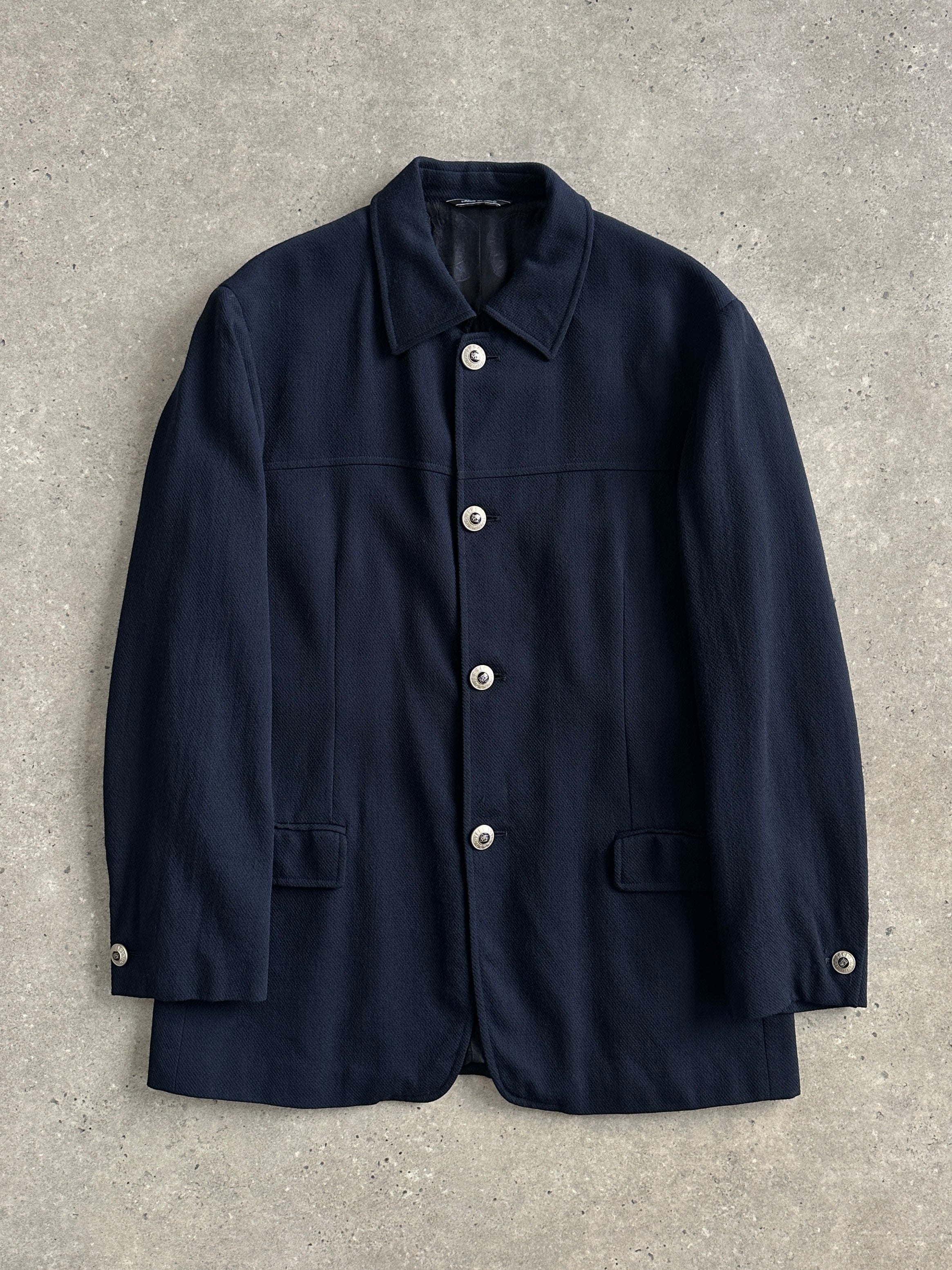 Vintage late 1990s Versace Classic V2 navy wool chore jacket featuring bespoke metal logo buttons and full monogram satin lining for a refined utilitarian finish.