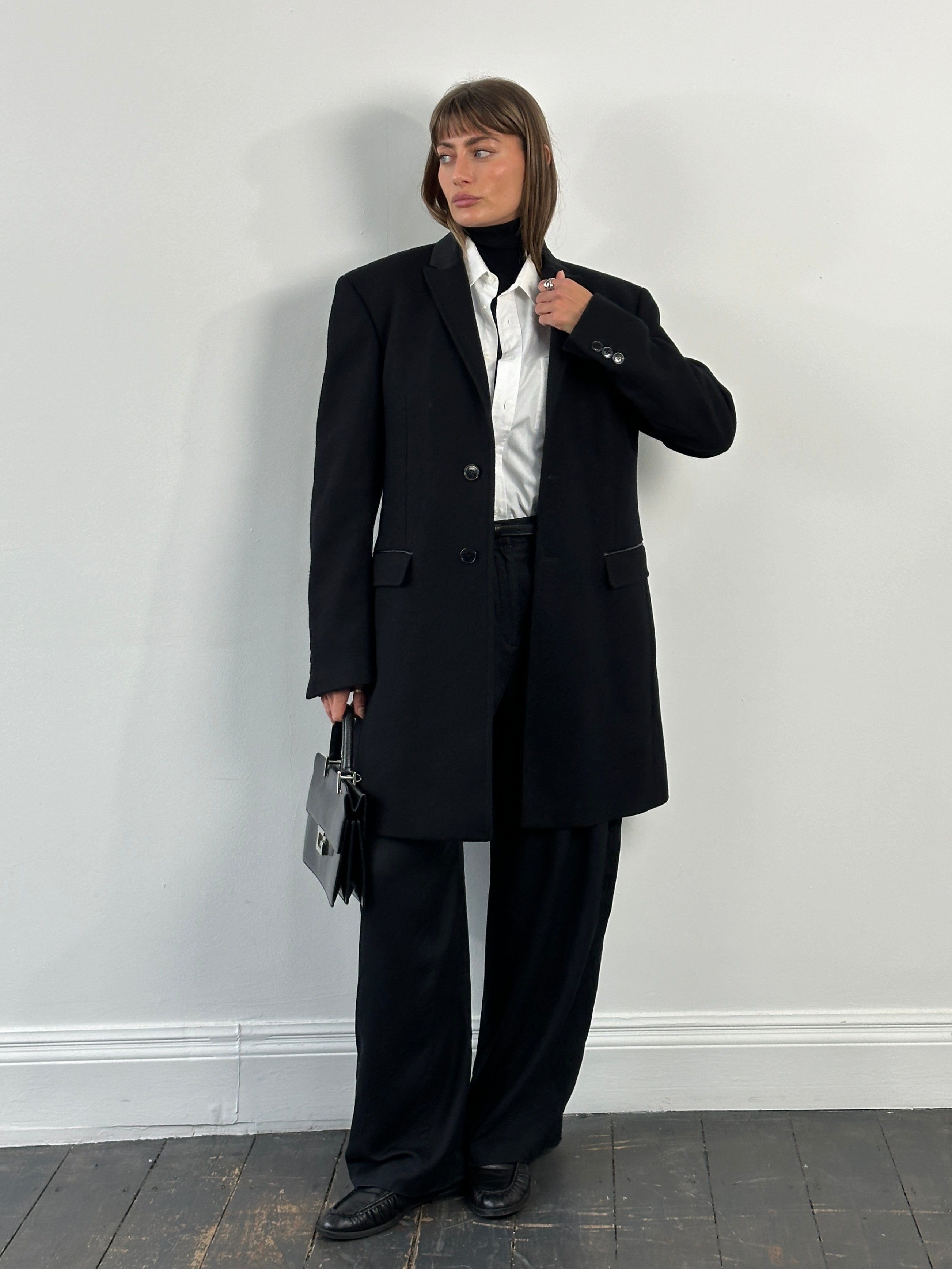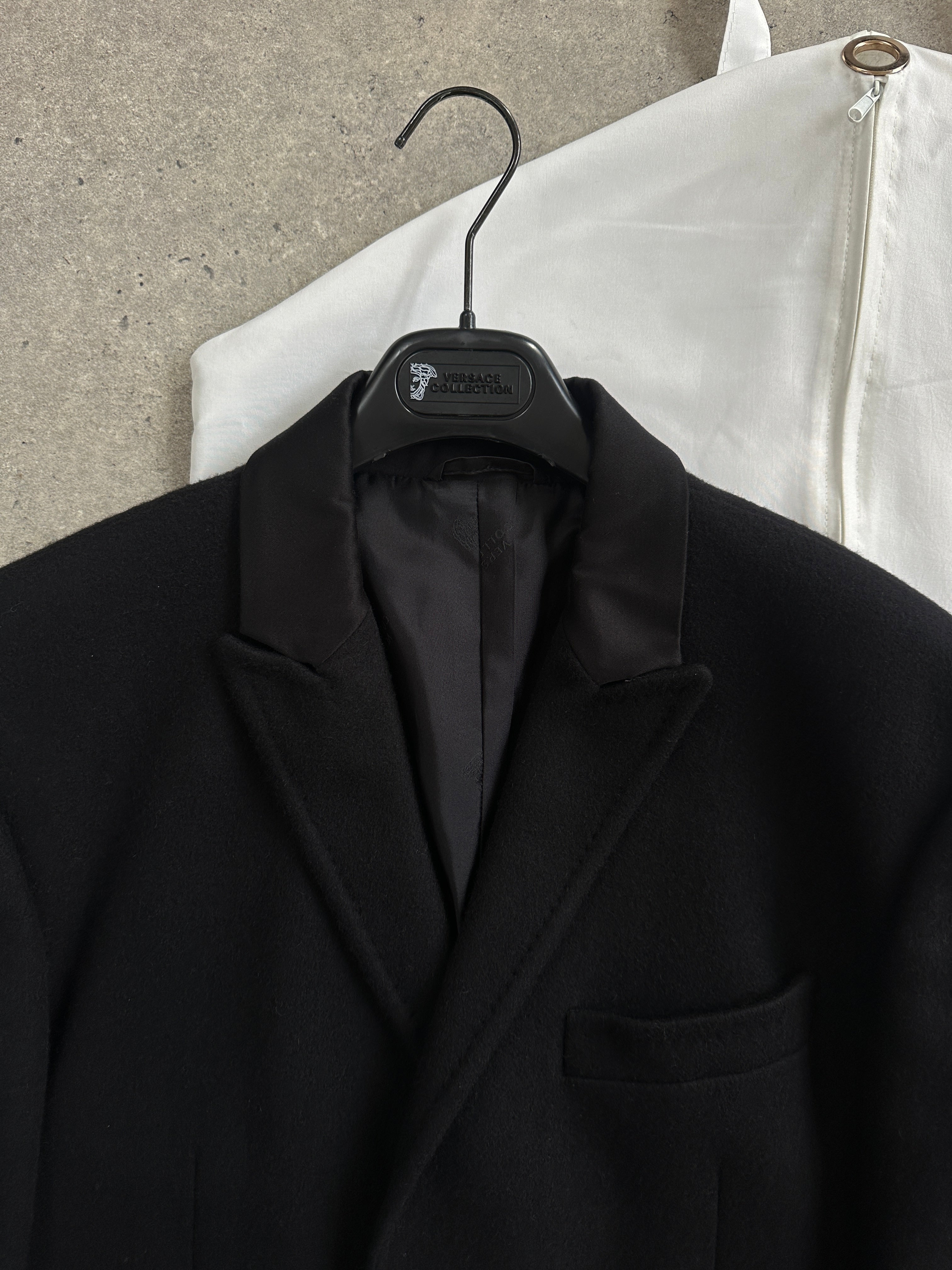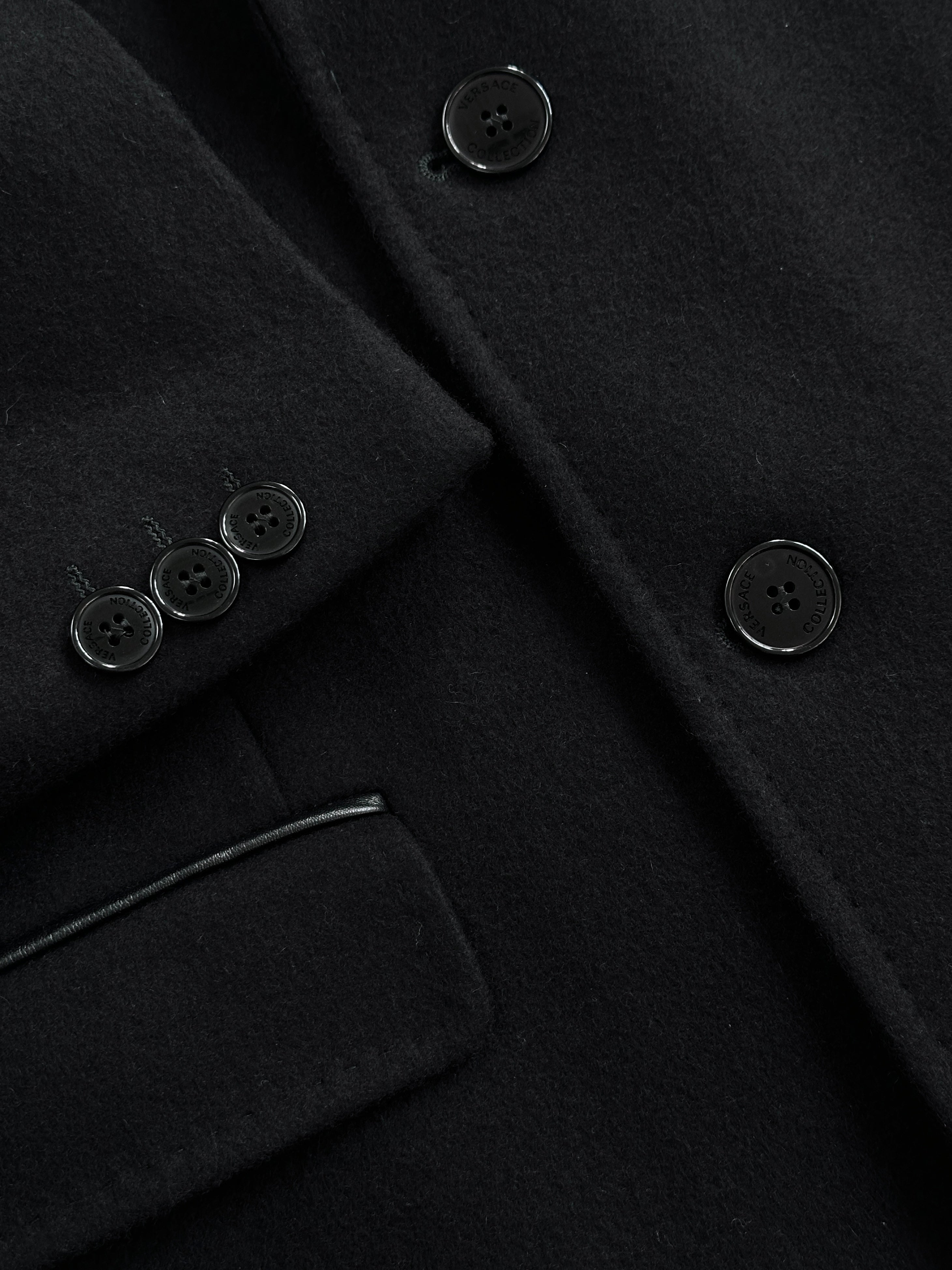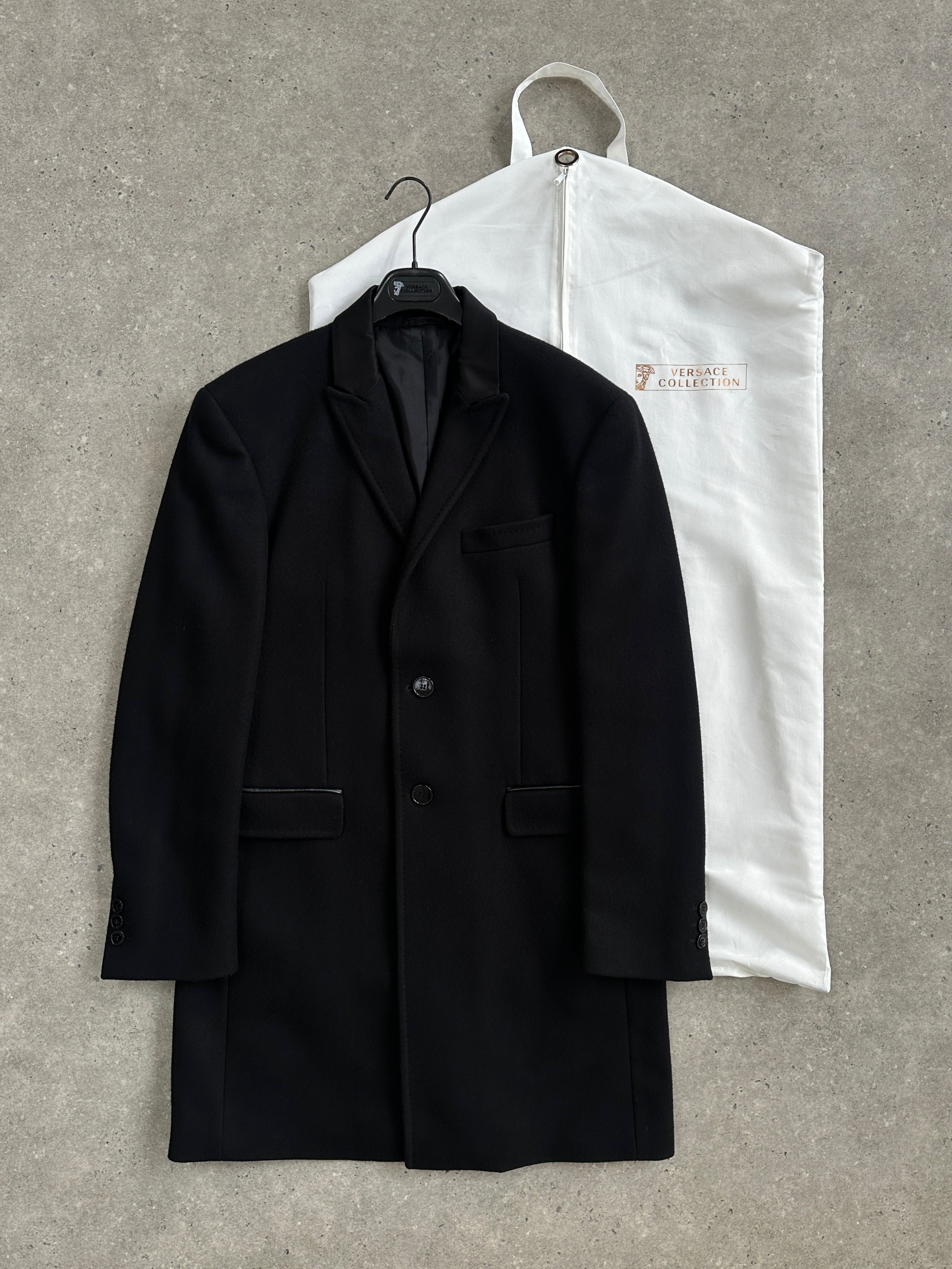 Versace Collection single breasted coat in a deep black tone. A clean tailored silhouette with subtle faux leather trim that feels sharp and quietly refined. Supplied with original hanger and dust bag.