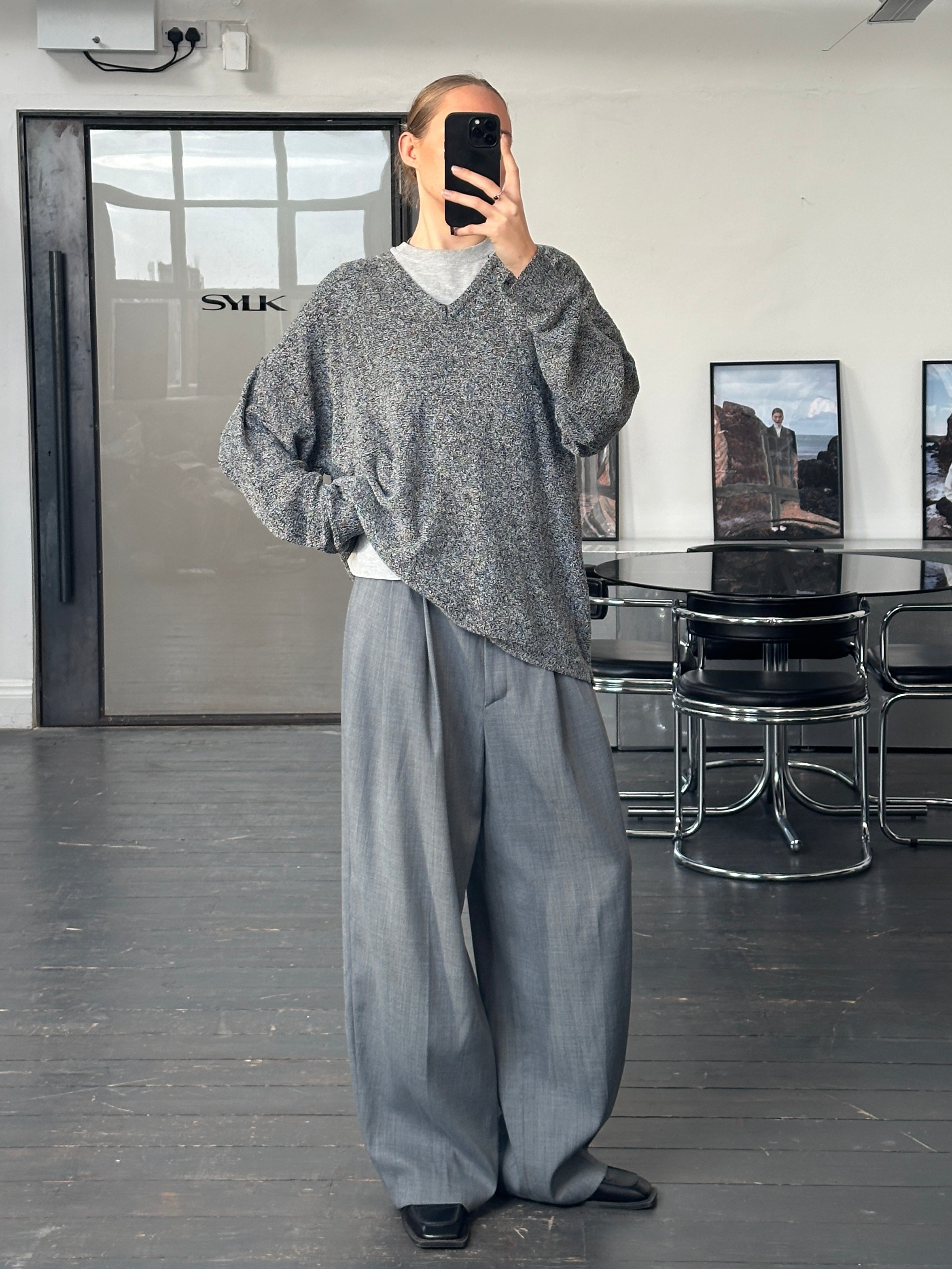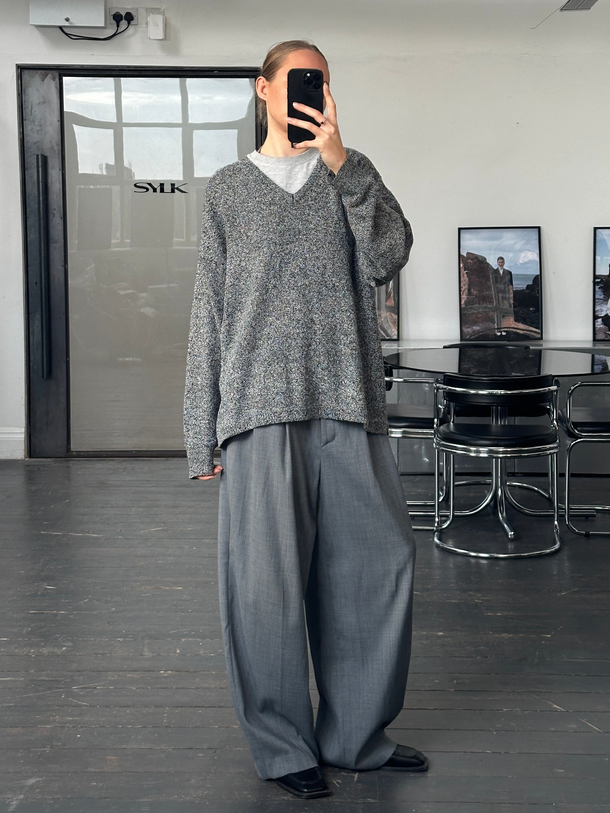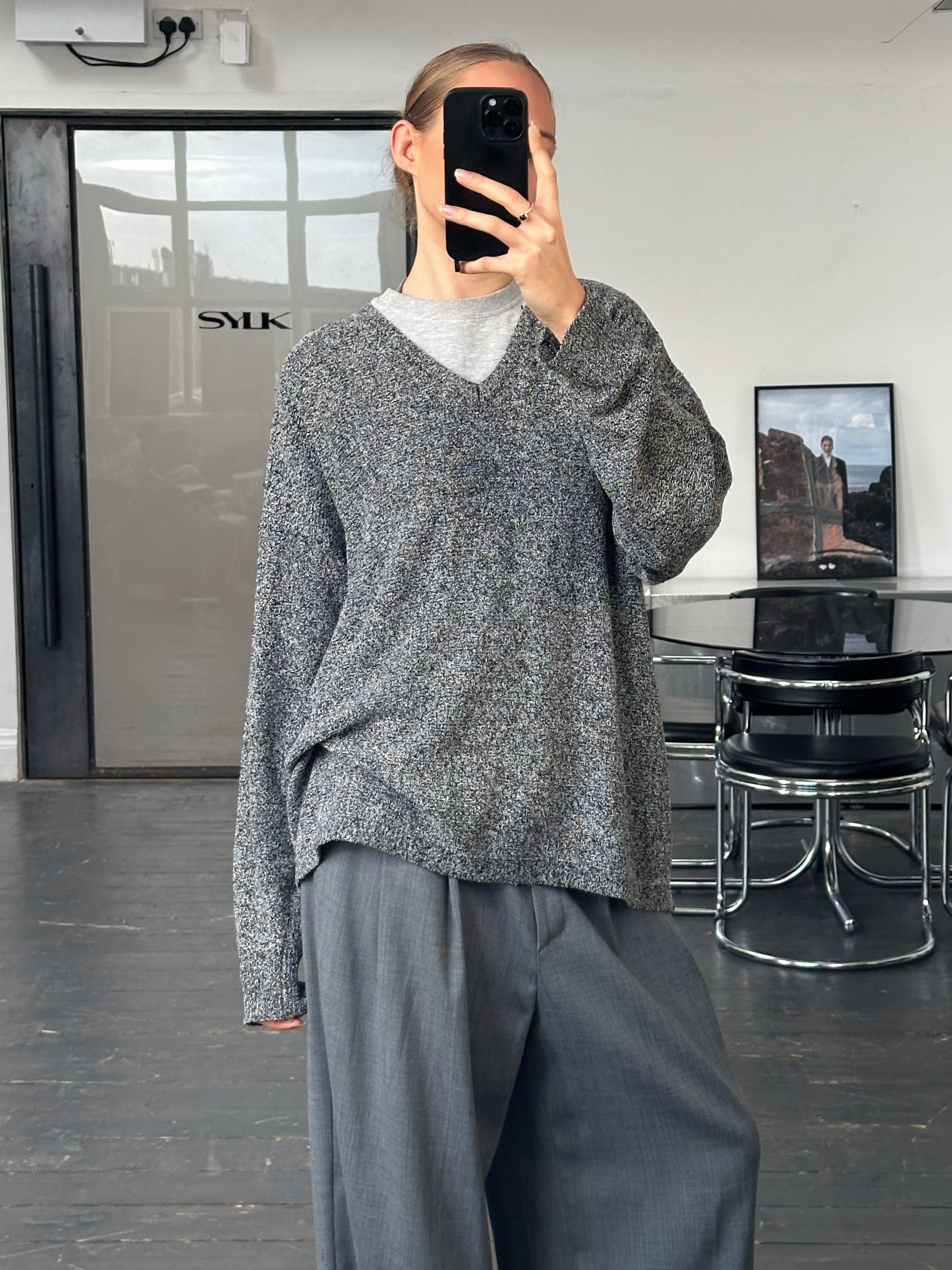 A vintage 1990s Versace Jeans Couture V neck jumper in an overall grey tone created by navy and white yarns. A lightweight knit with a relaxed silhouette and minimal refined feel.
