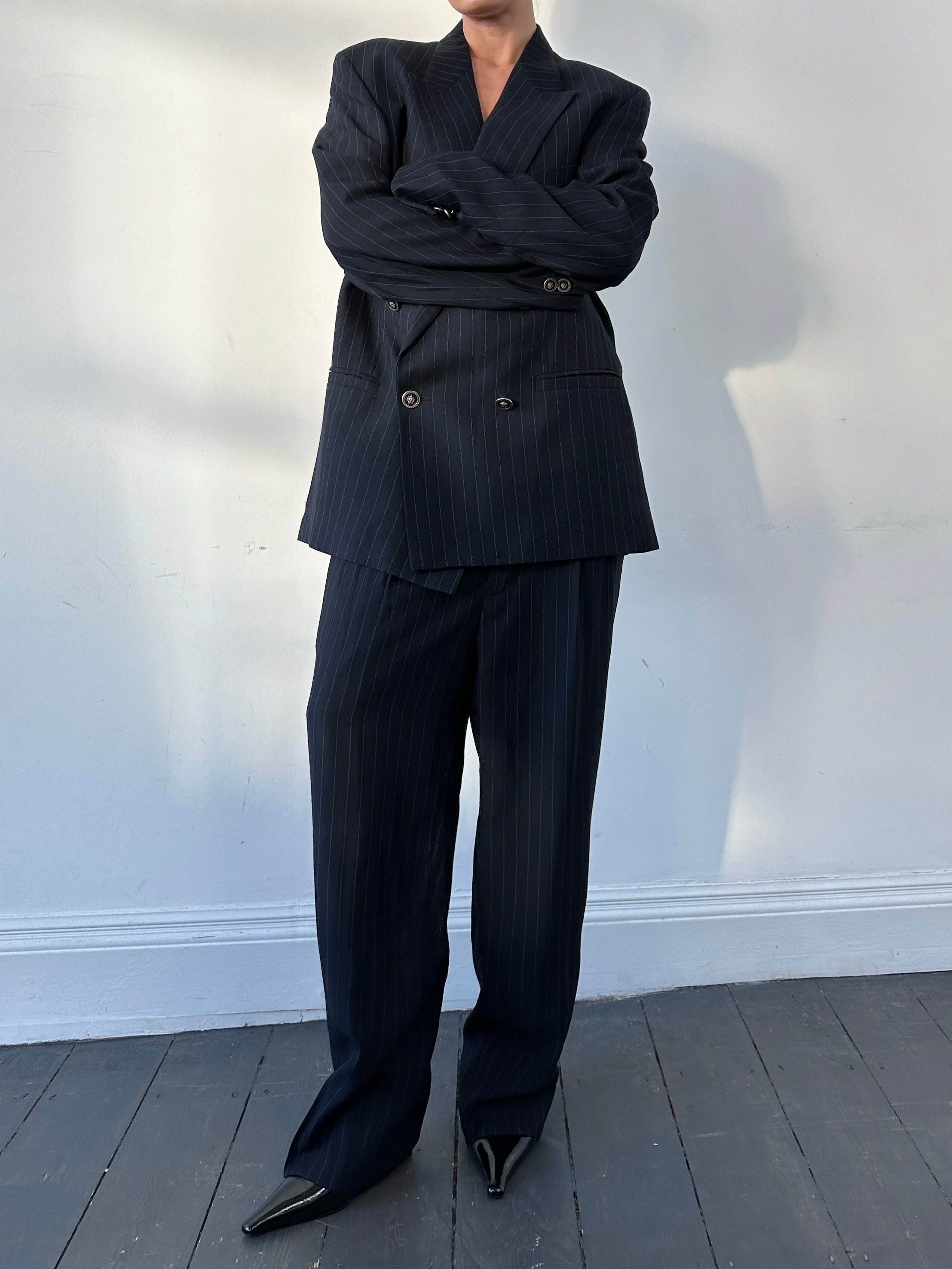 Gianni Versace Versus 1990s Wool Pinstripe Double Breasted Suit featuring bespoke buttons and oversized fit.