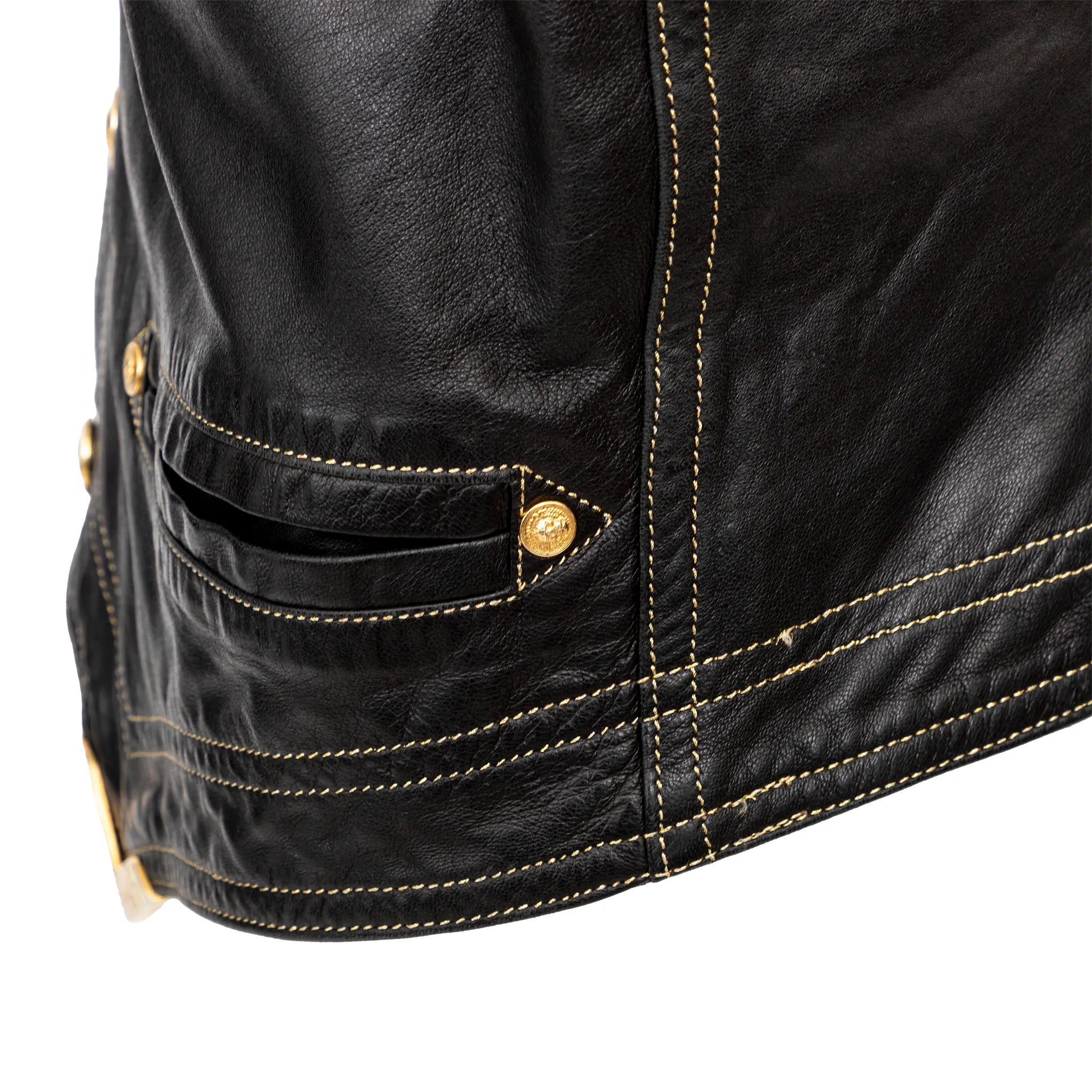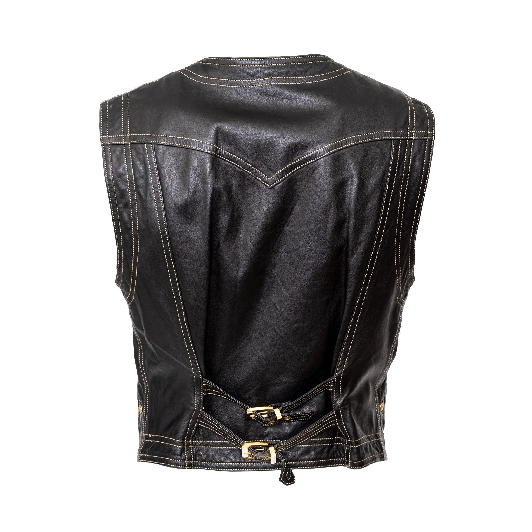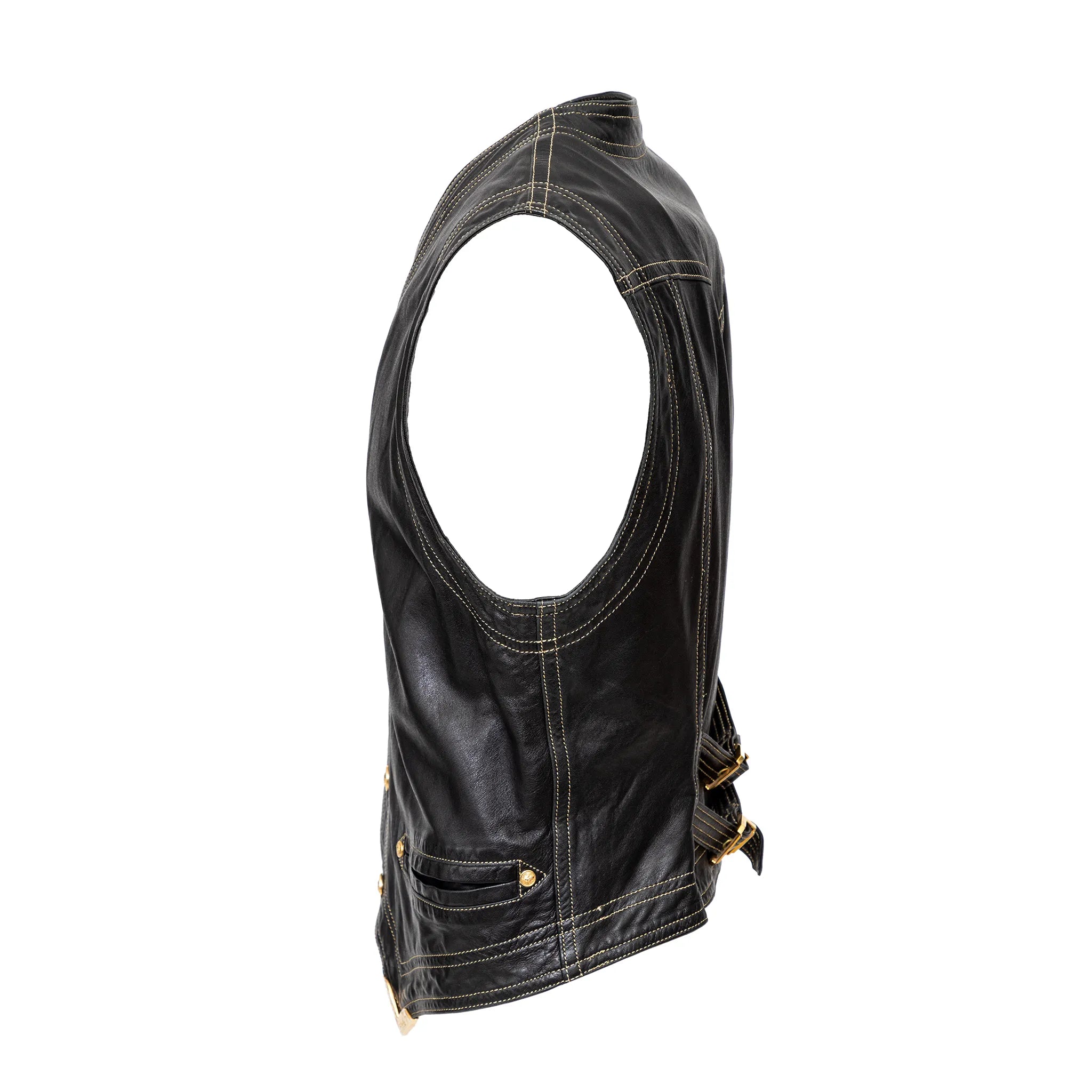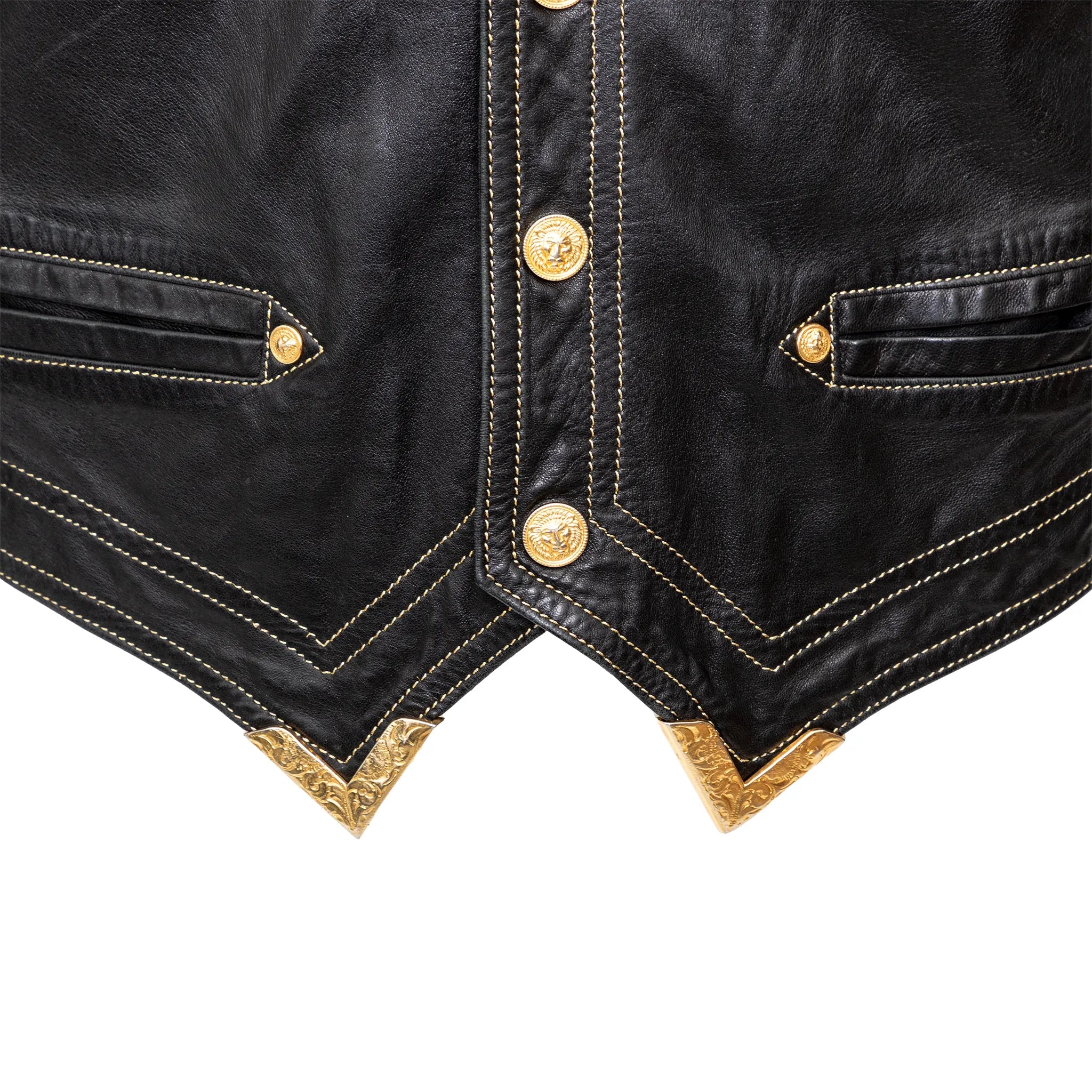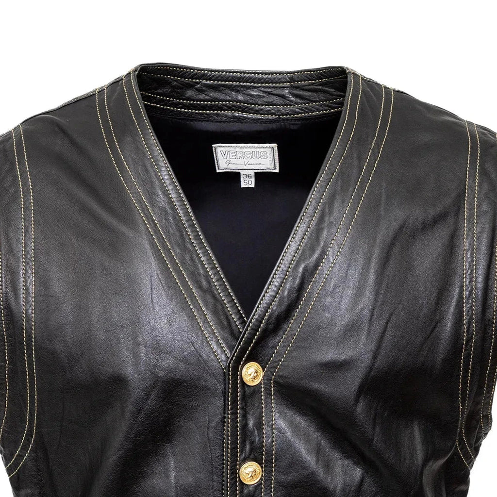 Versus black leather vest from the 90s featuring detailed stitching, gold-tone ornate buttons, and adjustable back buckles.
