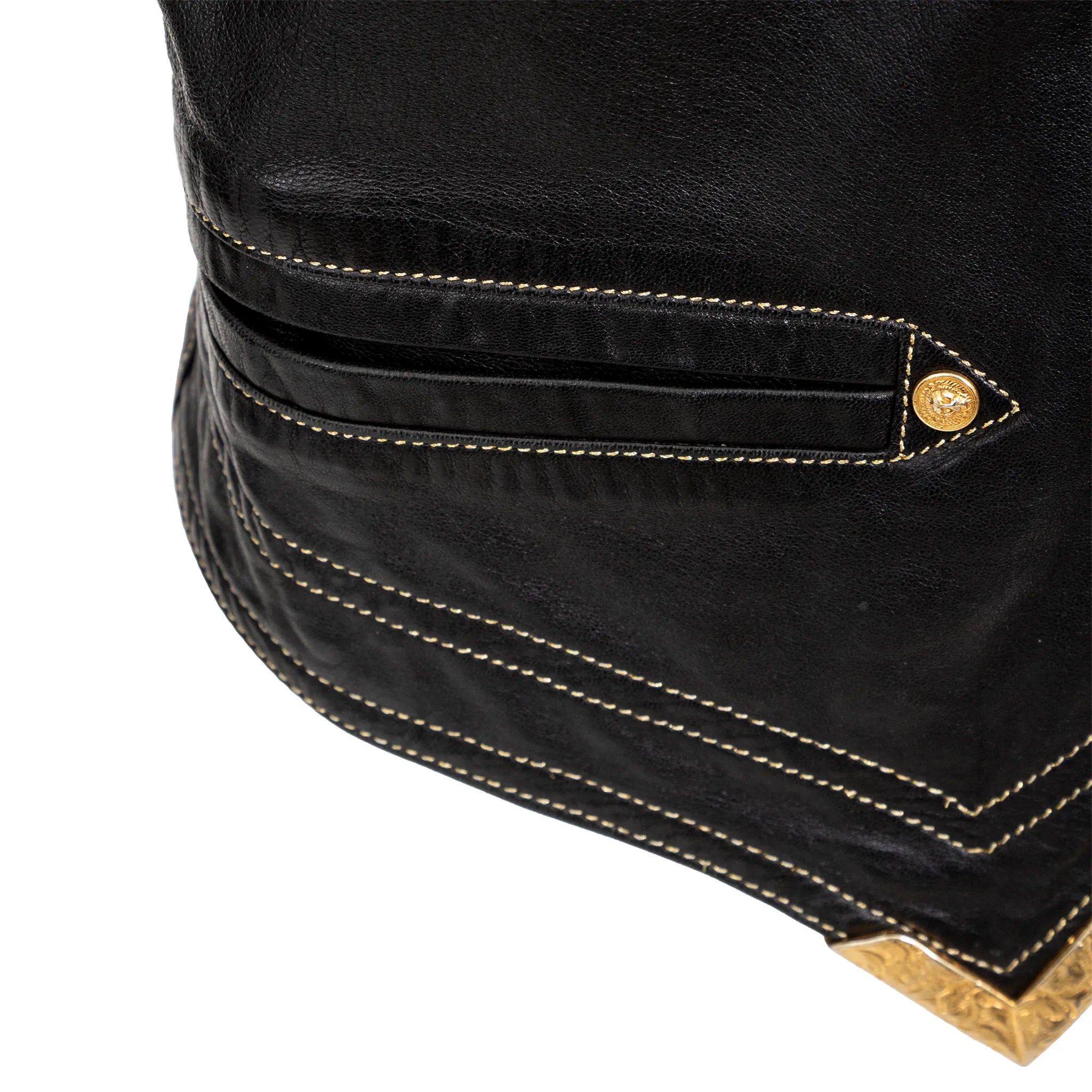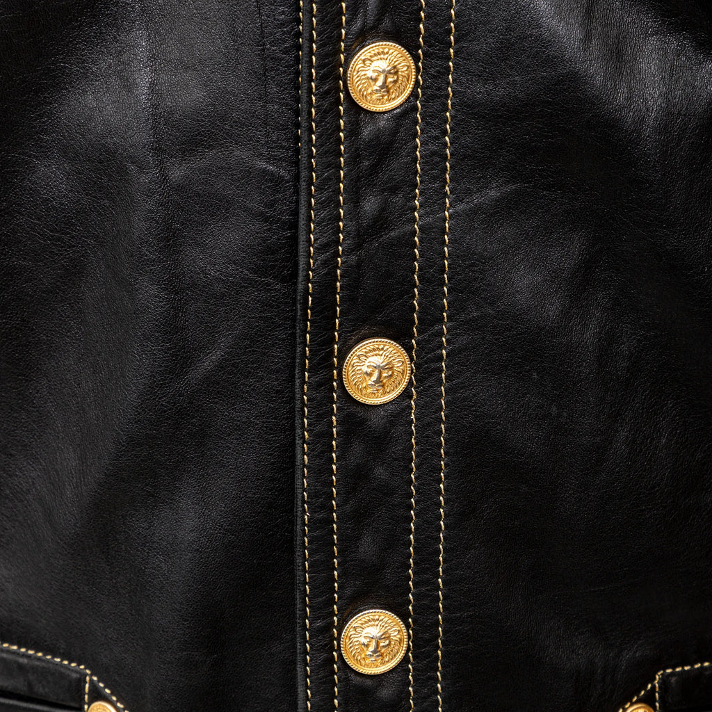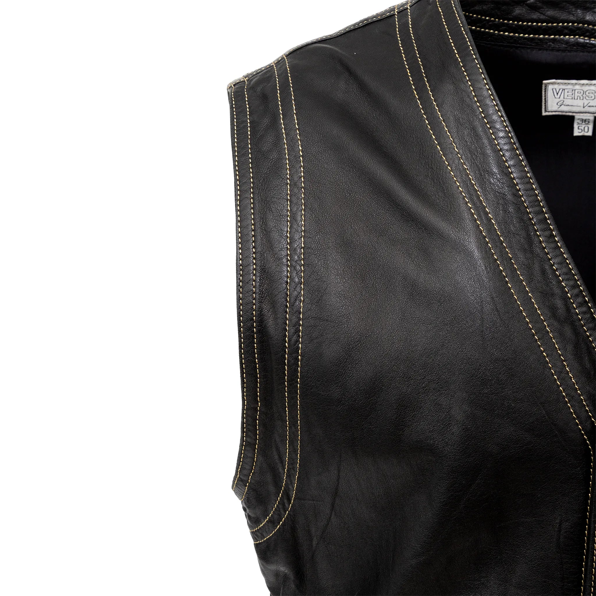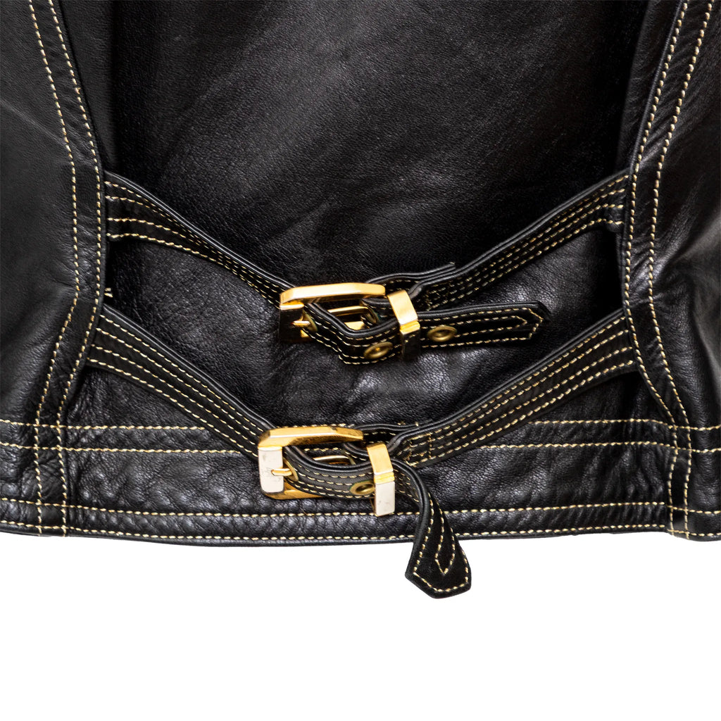 Versus black leather vest from the 90s featuring detailed stitching, gold-tone ornate buttons, and adjustable back buckles.