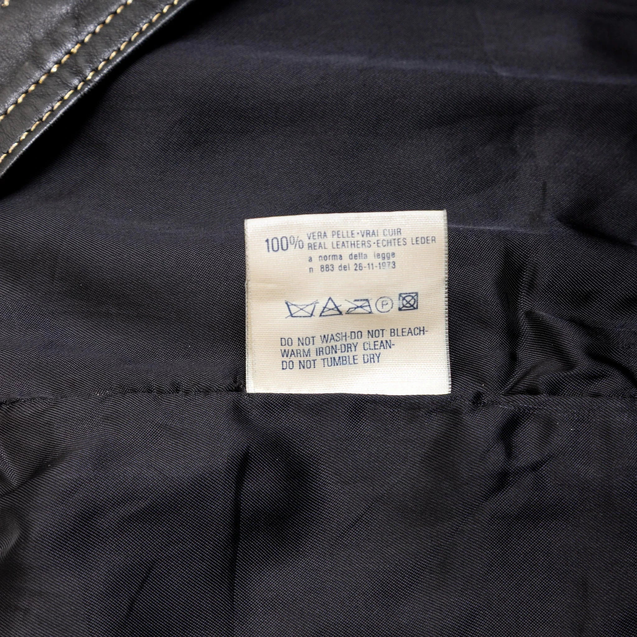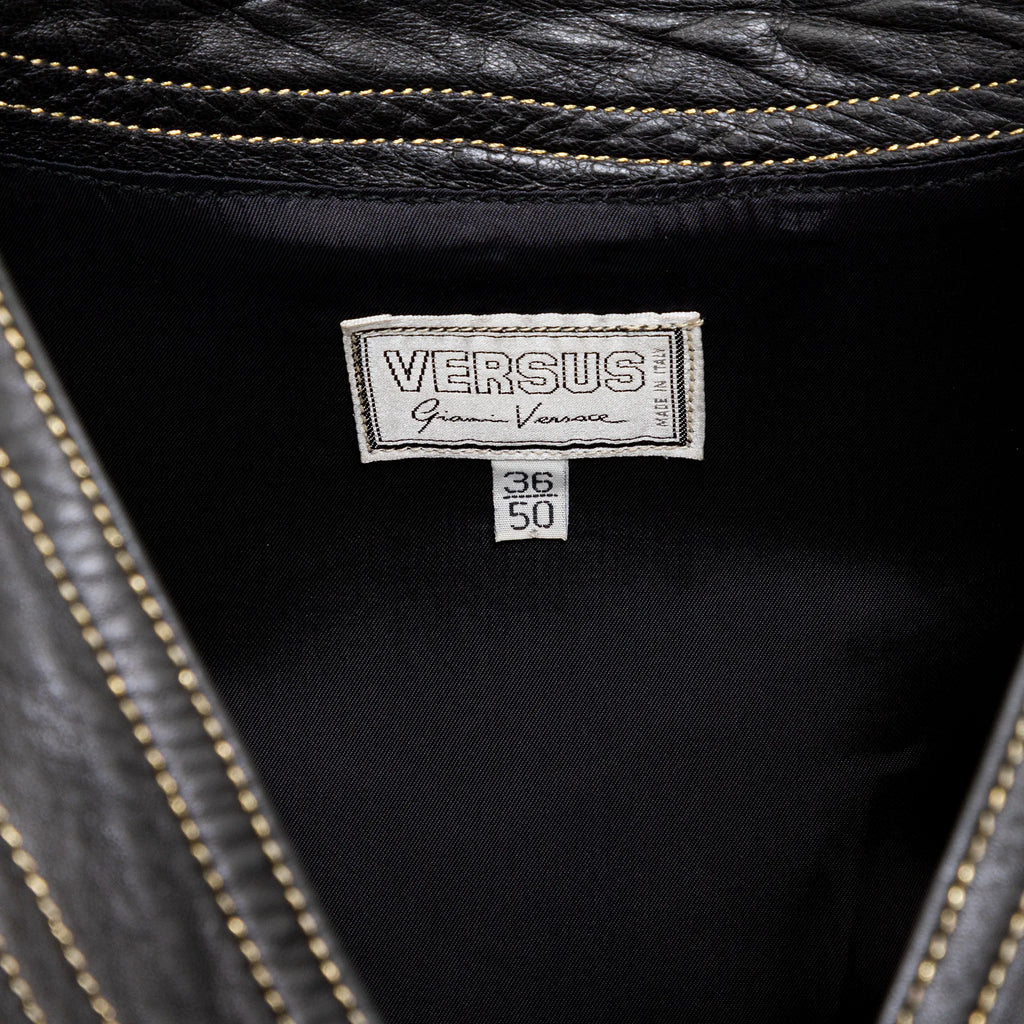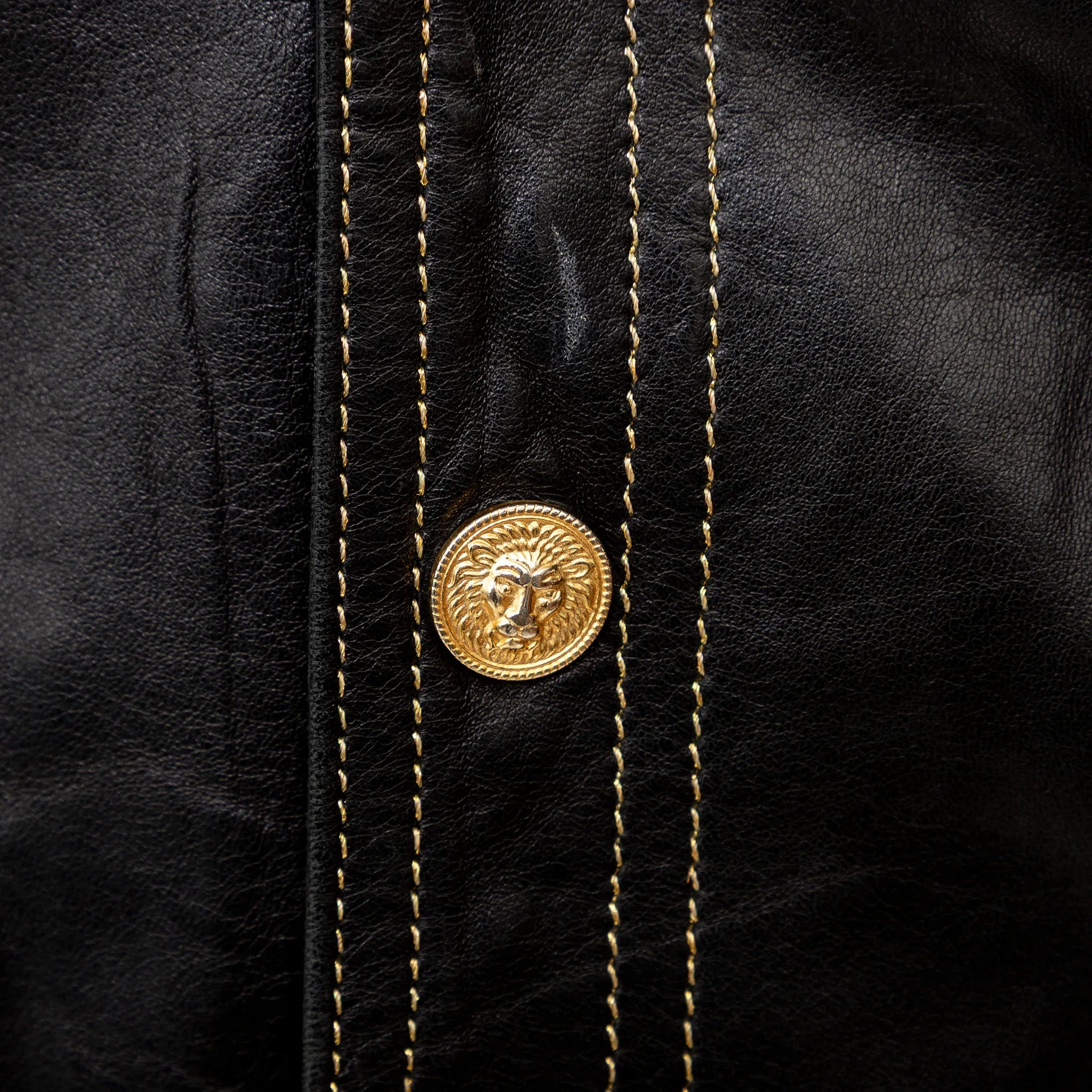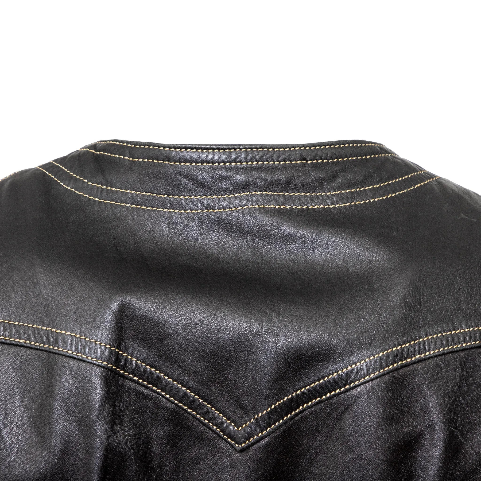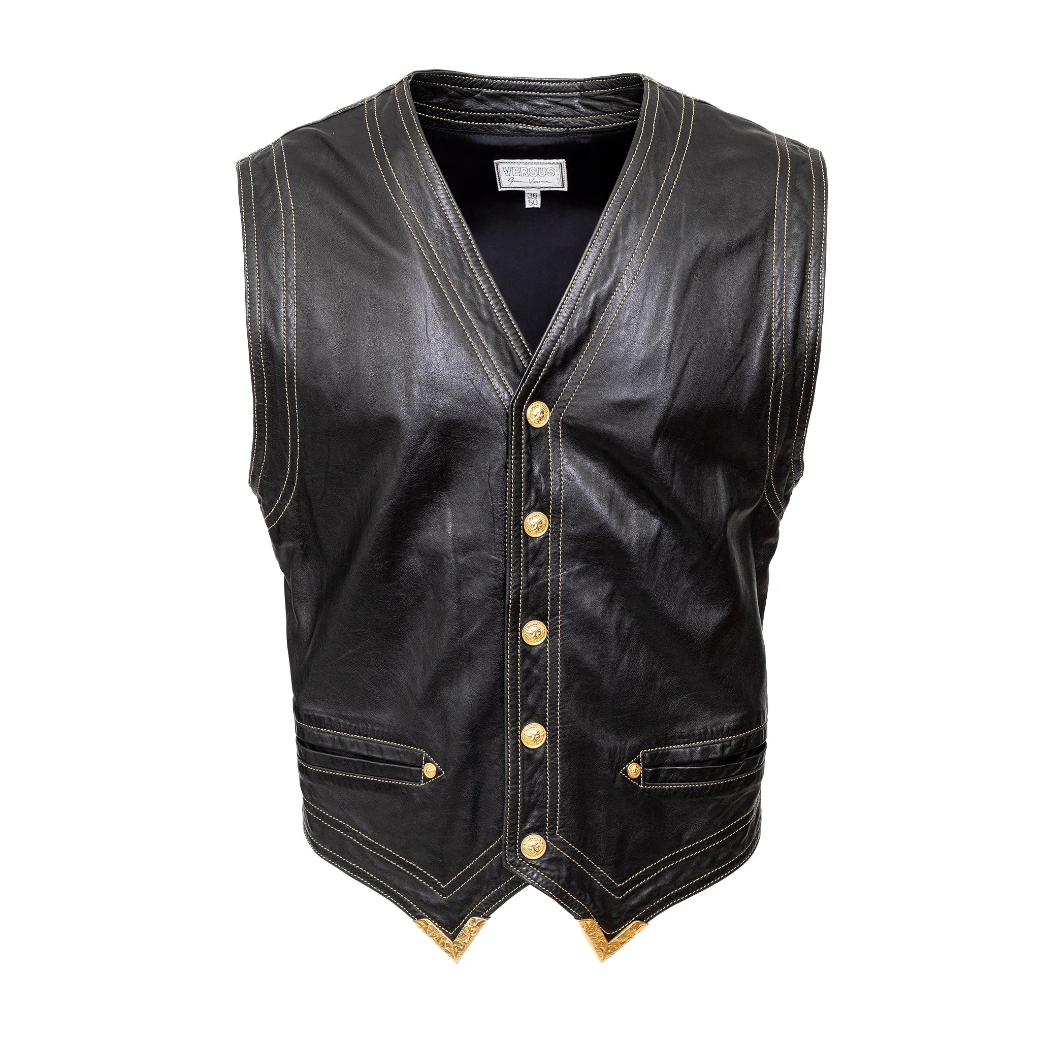 Versus black leather vest from the 90s featuring detailed stitching, gold-tone ornate buttons, and adjustable back buckles.
