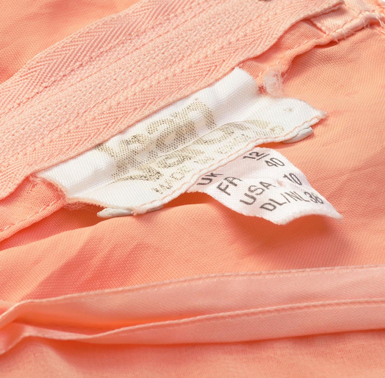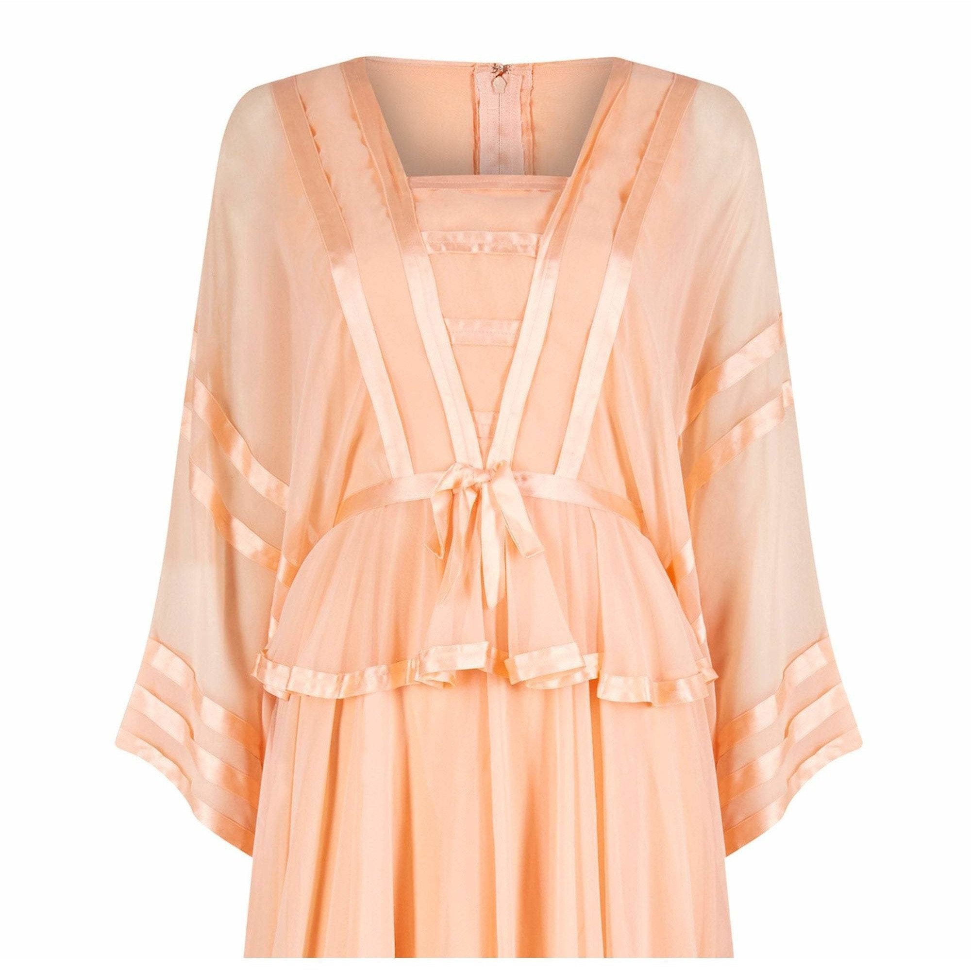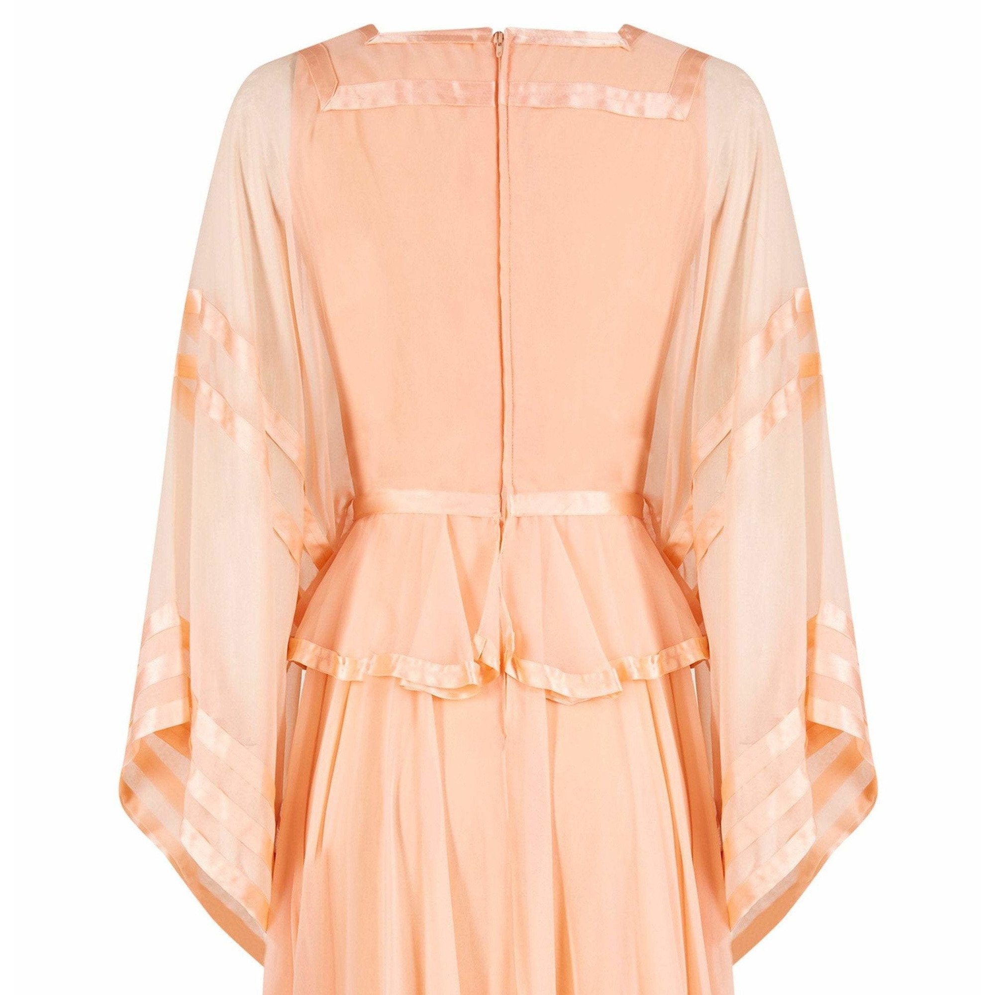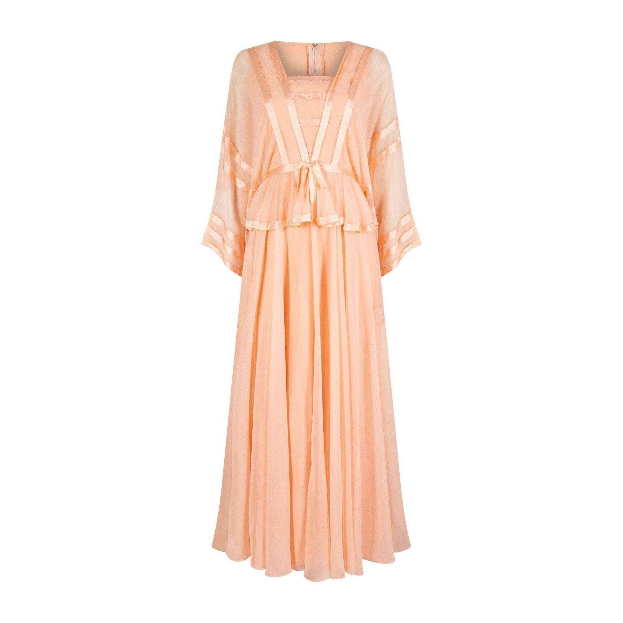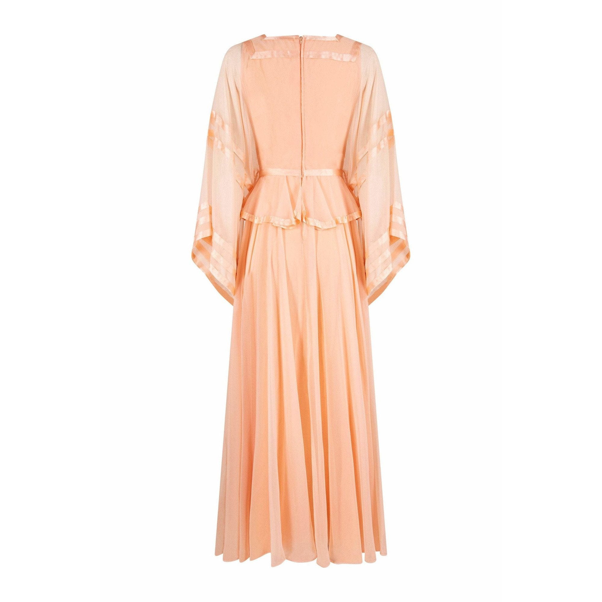 This captivating 1970s pale peach chiffon dress with ribbon trim is by British label Jean Varon and is a beautiful example of the designer's penchant for softer feminine lines that were synonymous with his work during this era. The dress is comprised of a peach toned shift cut dress with an etherial chiffon overlay featuring wide set sheer, kaftan style sleeves, full circle floor length skirt and peplum waistband. The waistband, bodice and cuffs are trimmed with wide satin ribbon in parallel rows, with a ribbon bow at the centre front to consolidate the look. The bodice has a deep plunging V with a modesty panel insert to create a square neckline. Fully lined with a concealed zip fastening at the centre reverse, this enchanting piece is in excellent vintage condition and would fit up to US size 4, UK size 8.