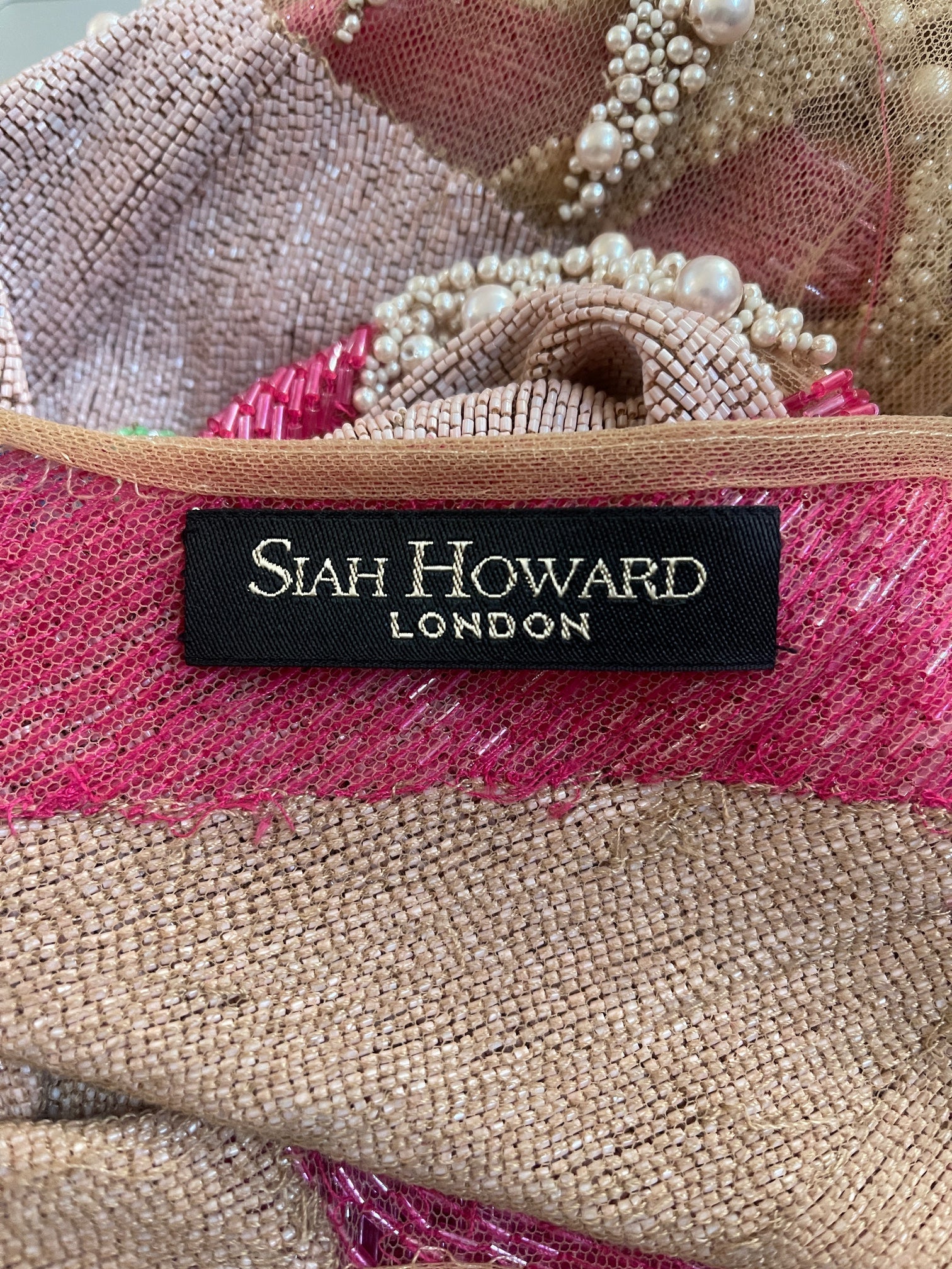 Siah Howard is a haute couture fashion label established in London in 2017. An eveningwear and wedding dress specialist, Howard’s fantastical designs are elaborate, elevated and otherworldly. This incredible gown was created as part of the designer’s whimsical ‘Out of Eden’ collection. The body is crafted from a sheer nude mesh with abstract panels of tiny beads in pale baby pink and iridescent fuchsia bugle beads. Pearls adorned the nude mesh in patterns placed to look like coral. Soft fabric flowers in dark coral and magenta appear to grow up the body of the dress, finished with sage green fabric leaves and vines adorned with silver-tone metal chains. The silhouette is body-hugging; the dress is heavy and clings to the body due to the elaborate beadwork and stretch-mesh fabric. It has pretty cap-sleeves and a V-neckline at the front and back.