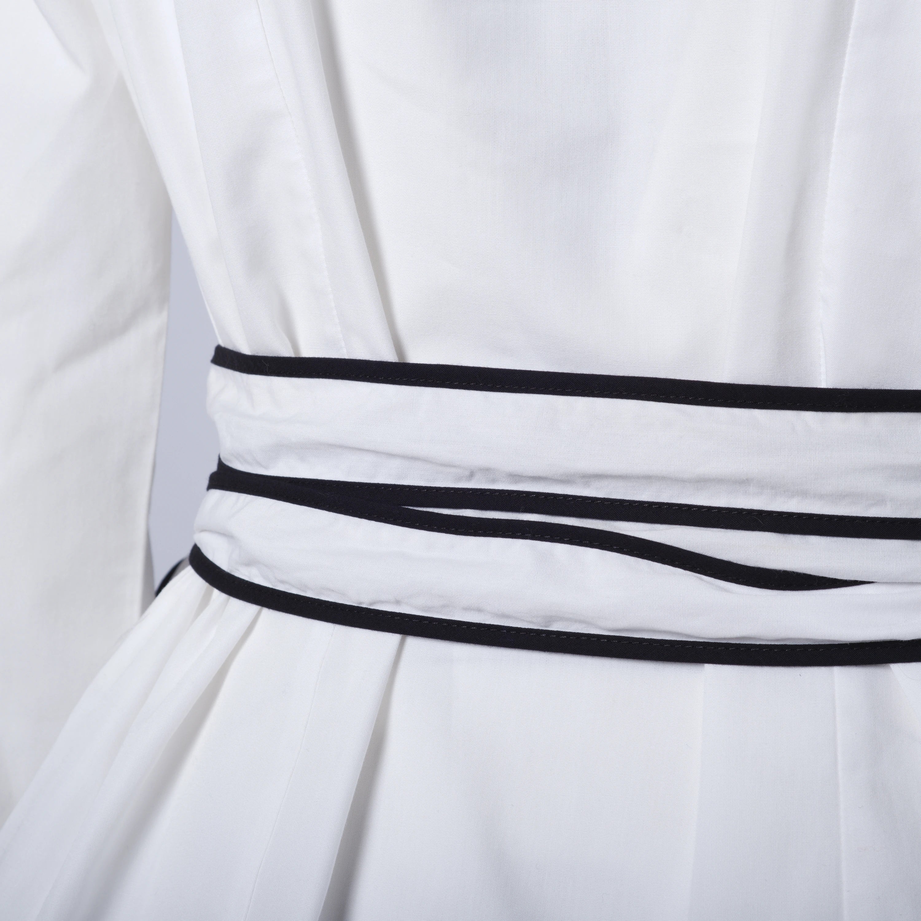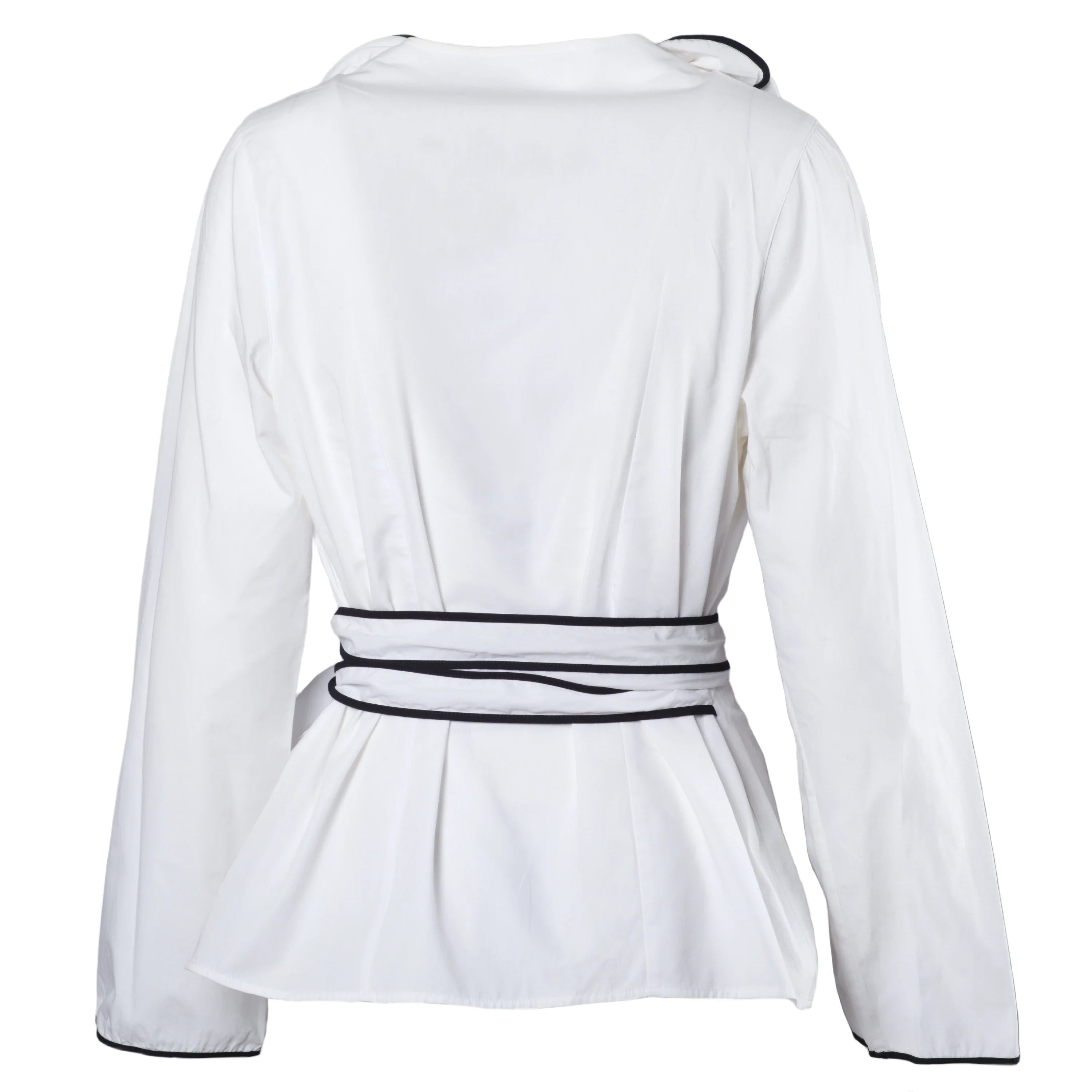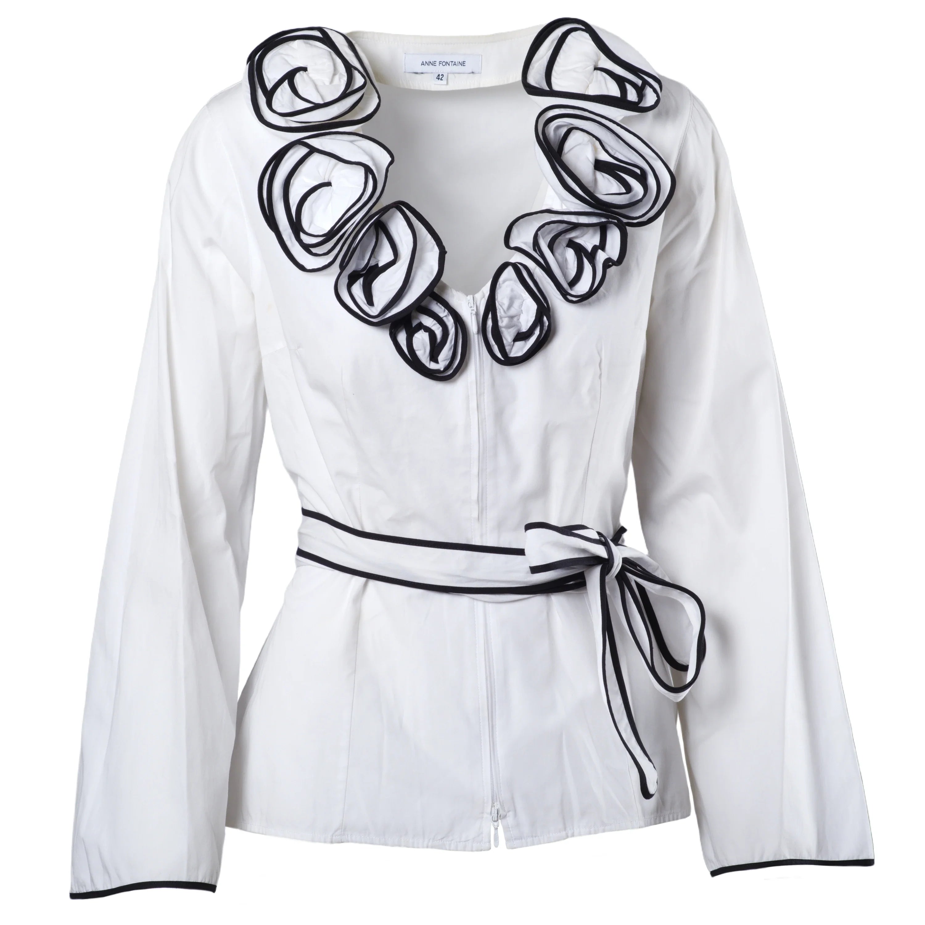 Blouse by Anne Fontaine, made from lightweight and soft fabric for a comfortable fit. Features a V-neckline, long sleeves, and a waist belt that can be tied in different ways to adjust the fit and enhance the body shape.