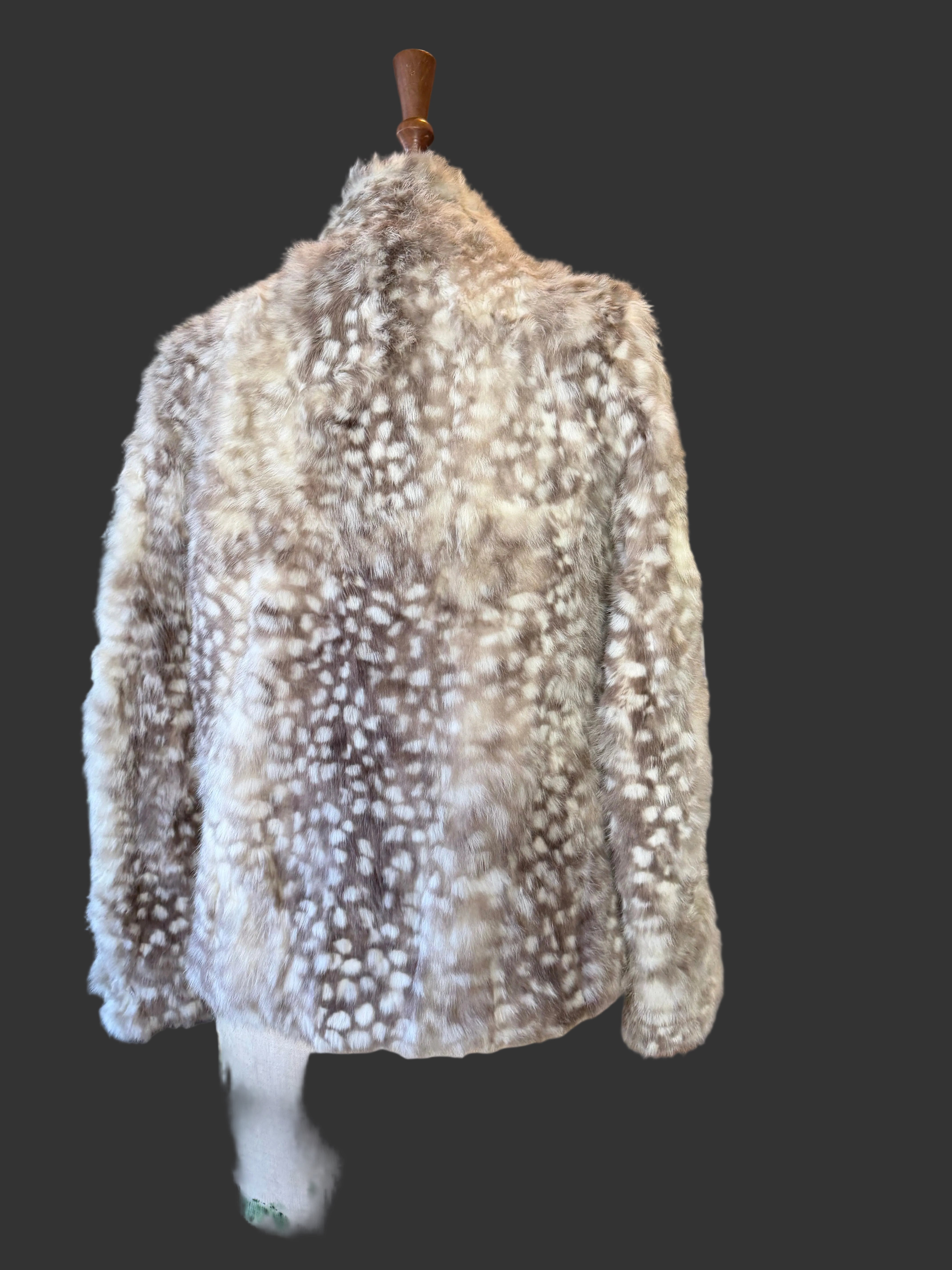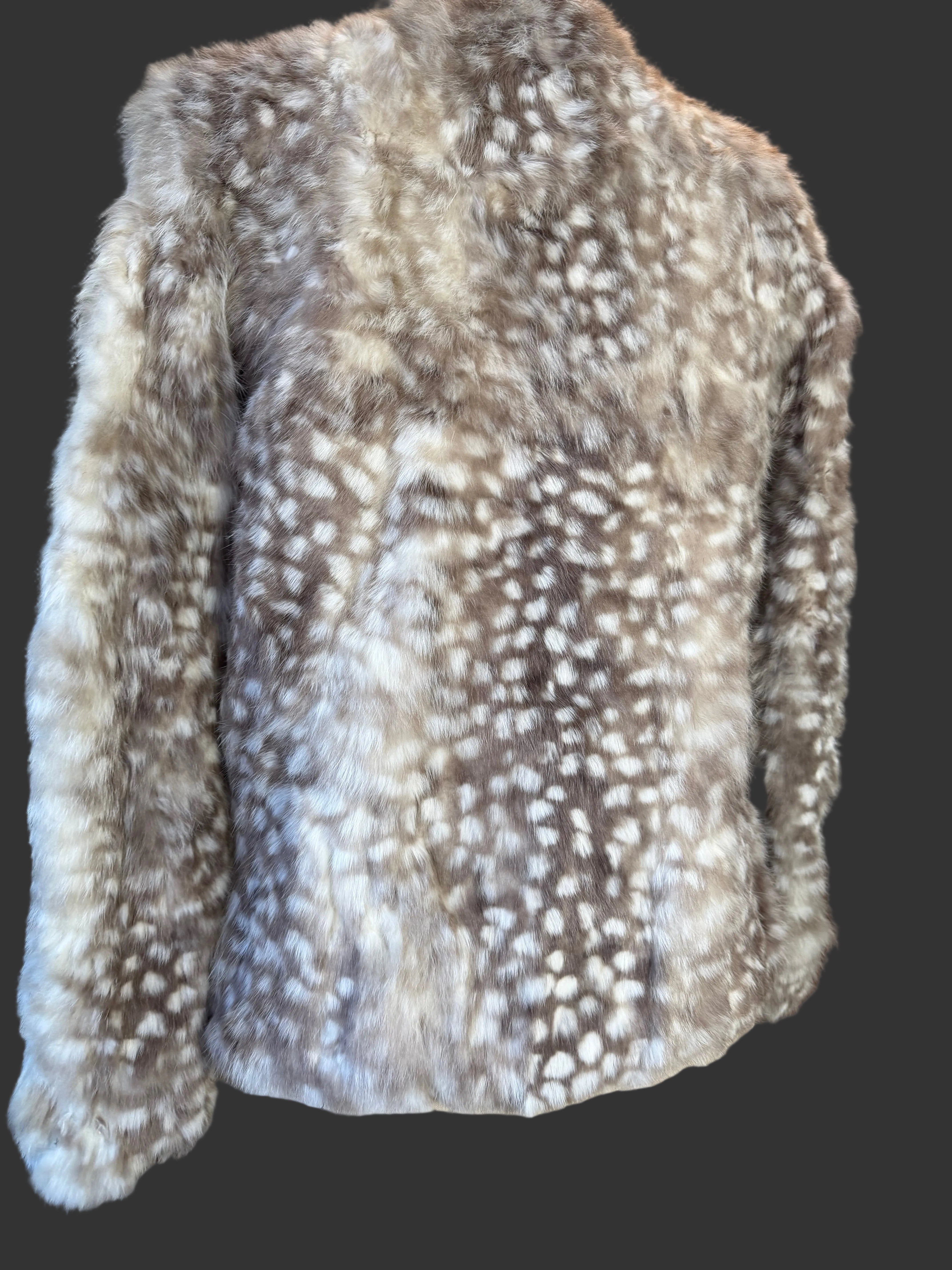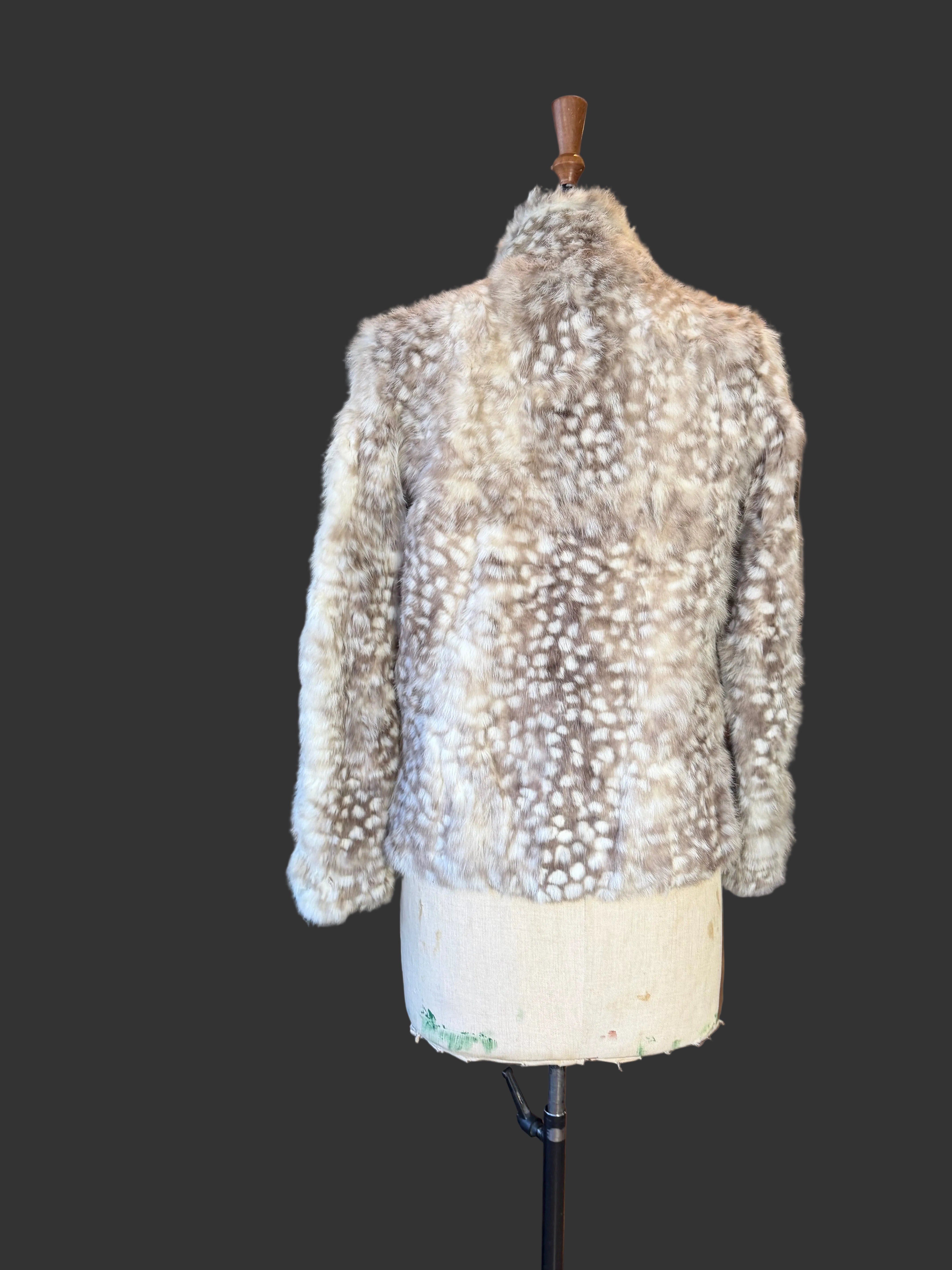 Crafted from exquisite rabbit fur, this rare 70s Bambi print jacket is not merely a garment; it is a testament to a bygone era of artistry and whimsy. The elegant high neckline and long sleeves create an elegant line, while the concealed hooks ensure a streamlined silhouette. With side pockets seamlessly integrated into its design, this piece embodies both functionality and sophistication, making it an impeccable choice for those who appreciate the artistry of 70s construction. Comes fully lined.