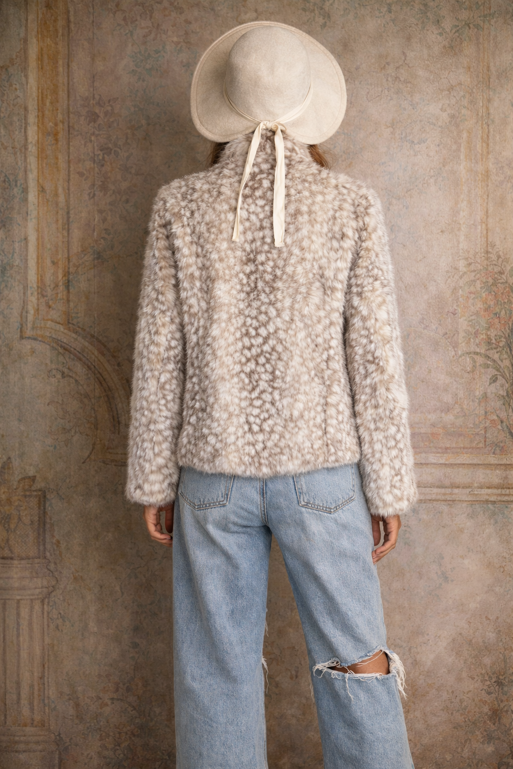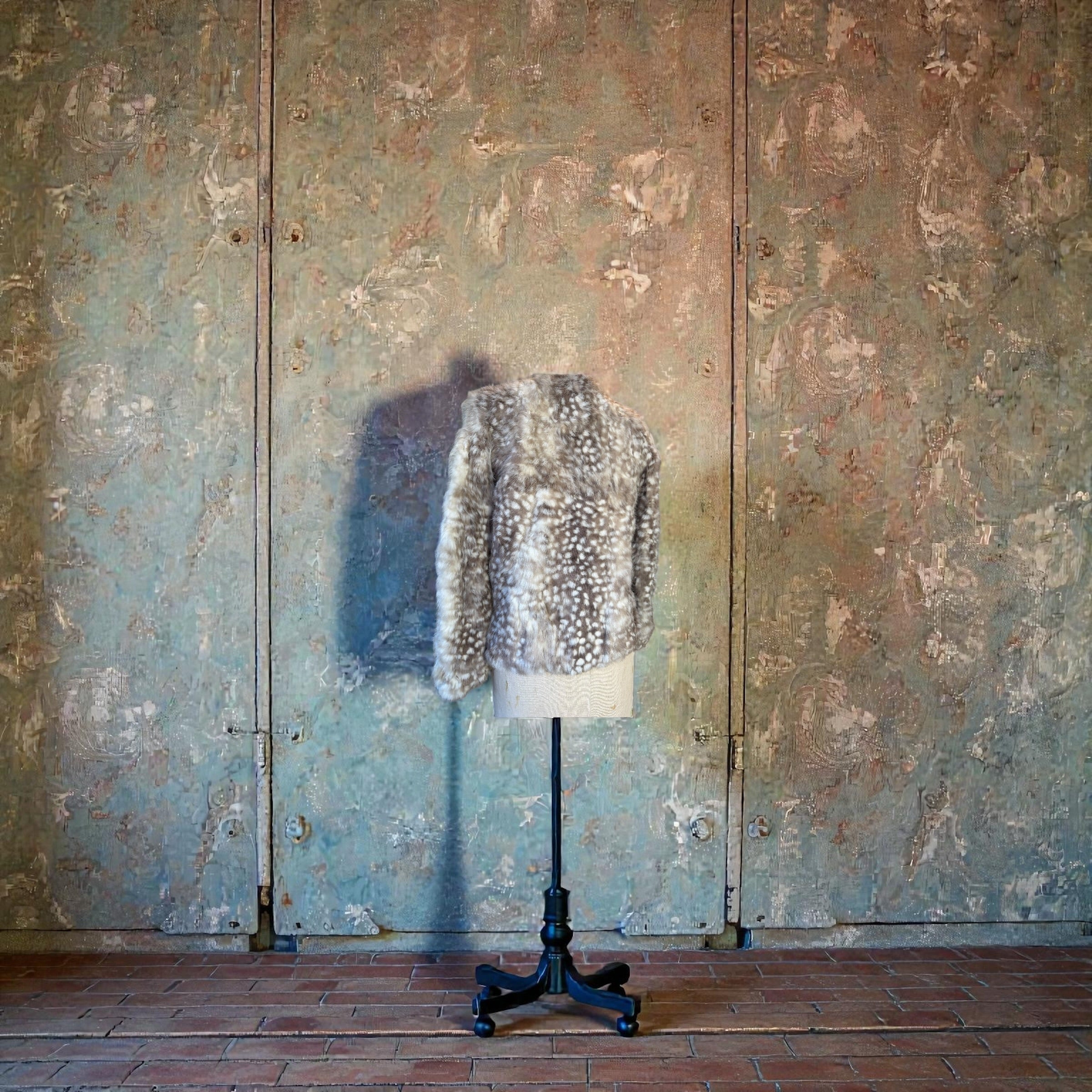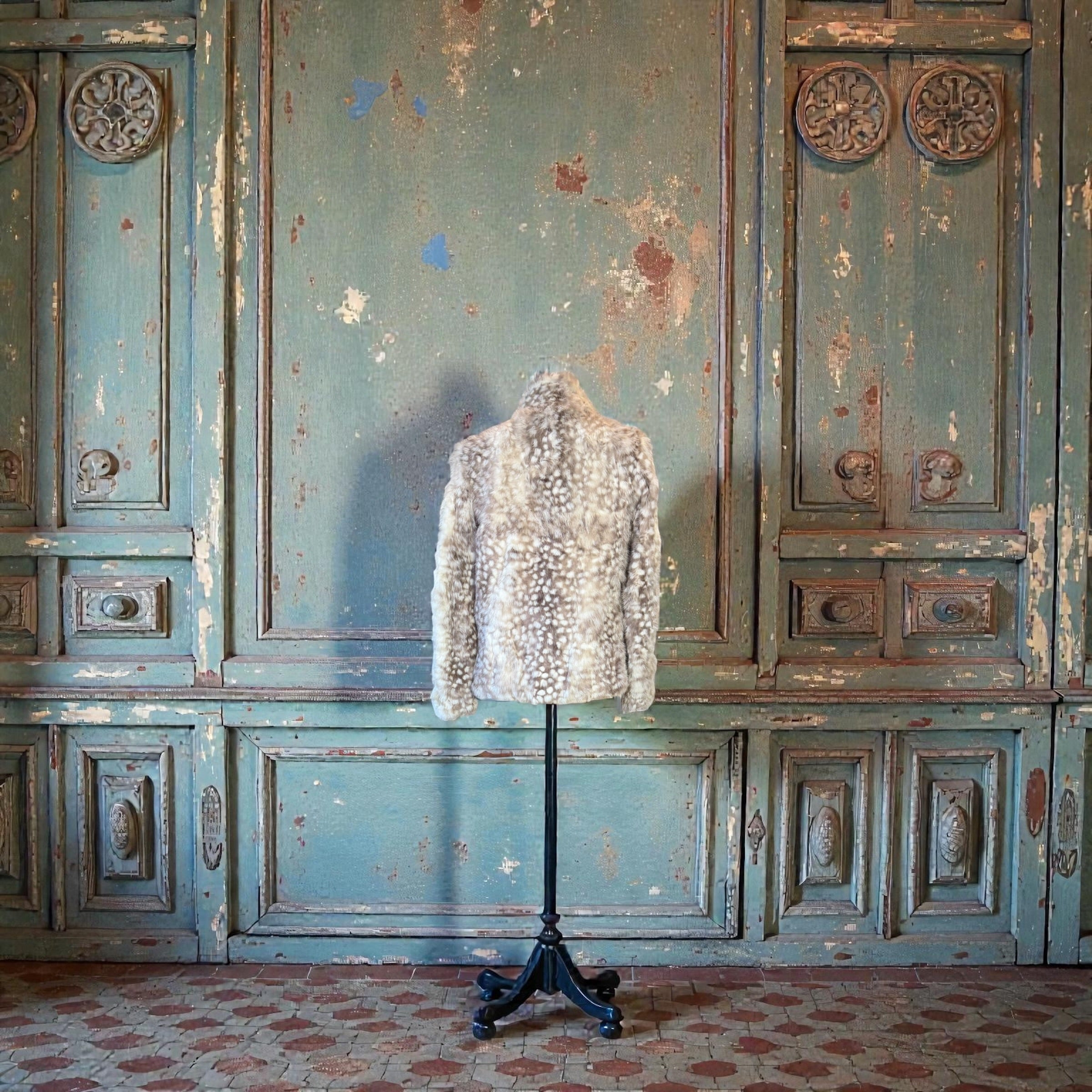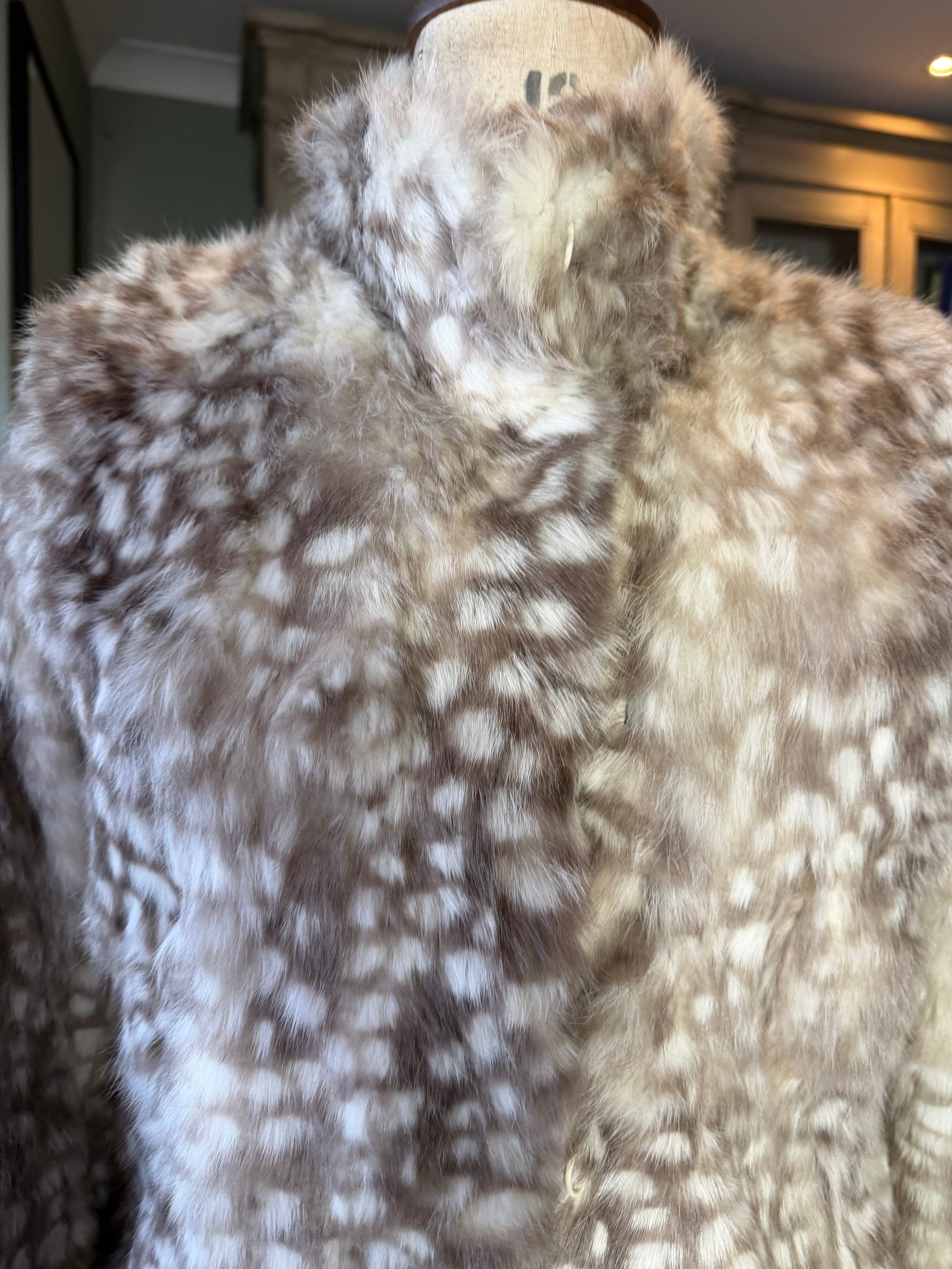 Crafted from exquisite rabbit fur, this rare 70s Bambi print jacket is not merely a garment; it is a testament to a bygone era of artistry and whimsy. The elegant high neckline and long sleeves create an elegant line, while the concealed hooks ensure a streamlined silhouette. With side pockets seamlessly integrated into its design, this piece embodies both functionality and sophistication, making it an impeccable choice for those who appreciate the artistry of 70s construction. Comes fully lined.