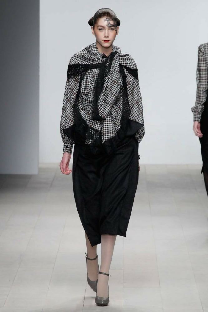 Block Skirt with side splits A/W 2012: Draped and cut box shaped block skirt, with two side panels cut into the draped centre front exposing the waist. Skirt has two side pockets, a centre back zipper and lower vent. Fabric: 100% cashmere wool, Lining:100% silk. Size 10 Last One