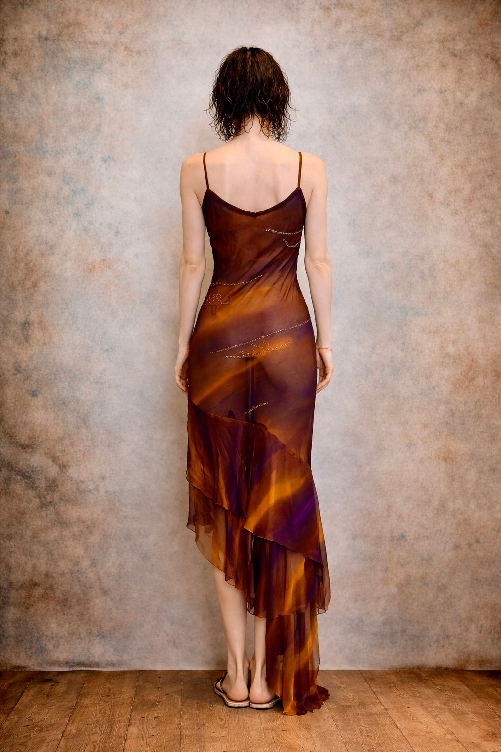 Indulge in timeless elegance with this 90s silk chiffon beaded dress in earthy yet vibrant tones. The thin shoulder straps and asymmetrical cascading frills add sophistication, while the intricate rhinestone beading adds a touch of sparkle. Hand-finished for a perfect fit, with a side zip for convenience. This makes the perfect party dress,