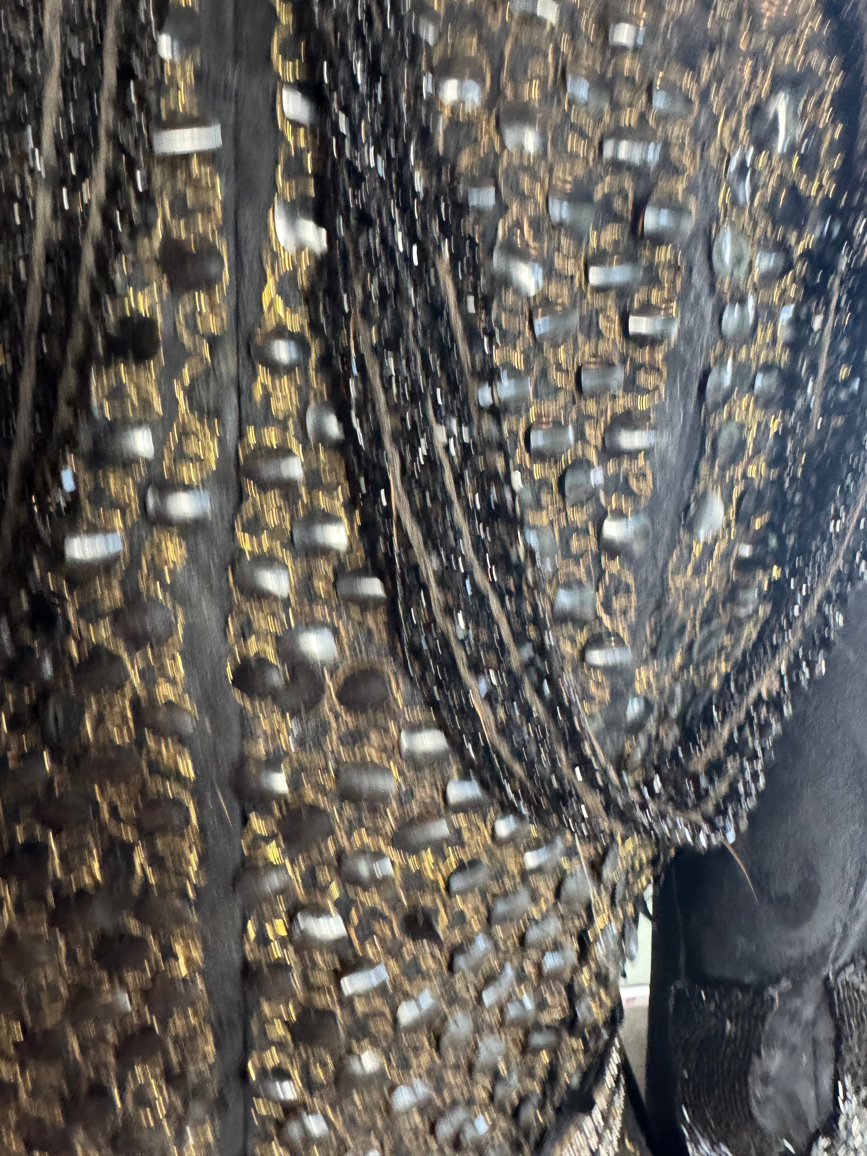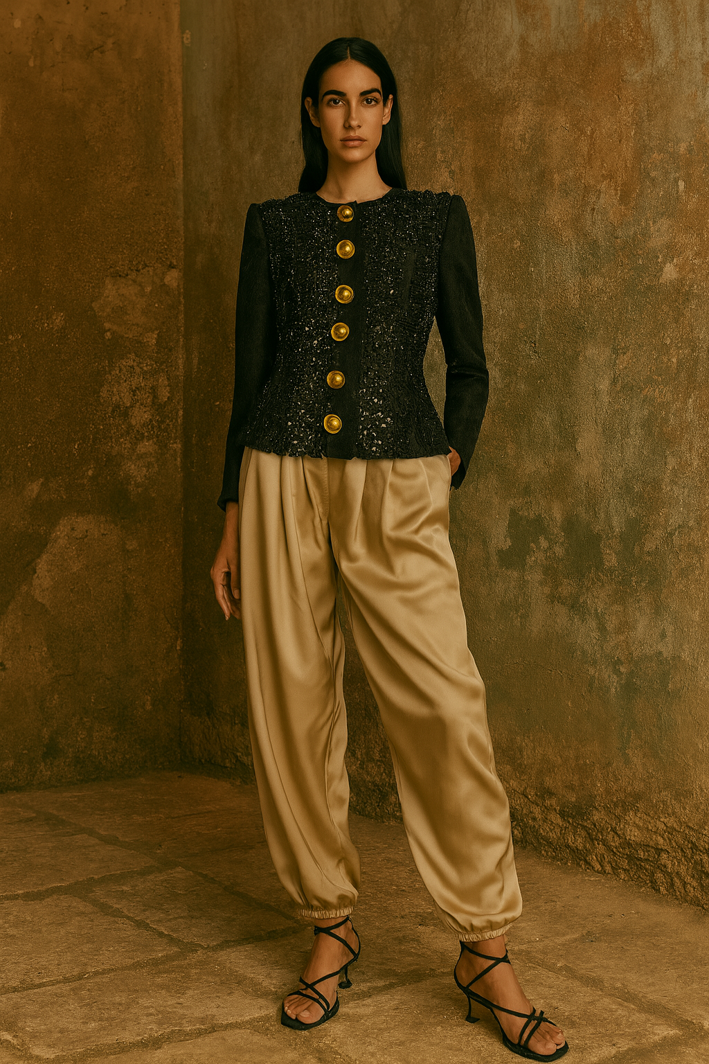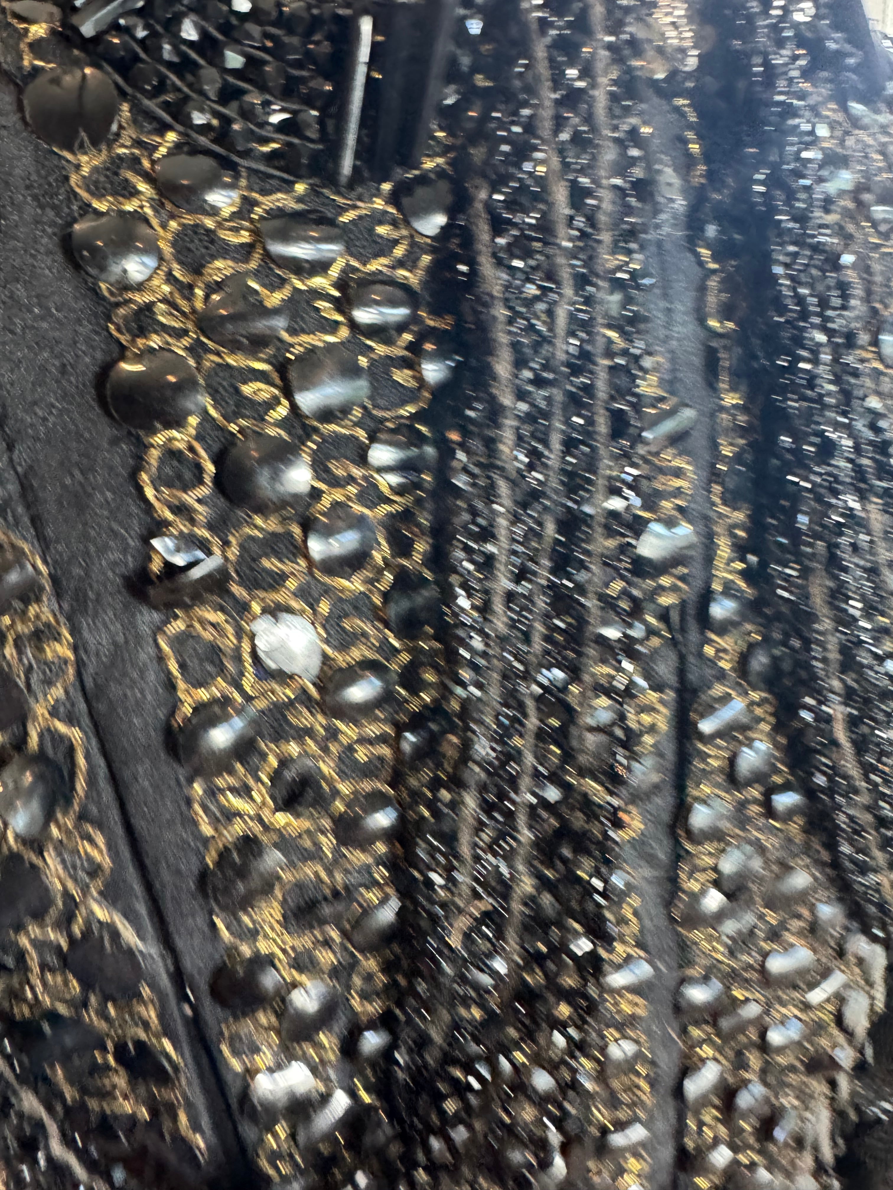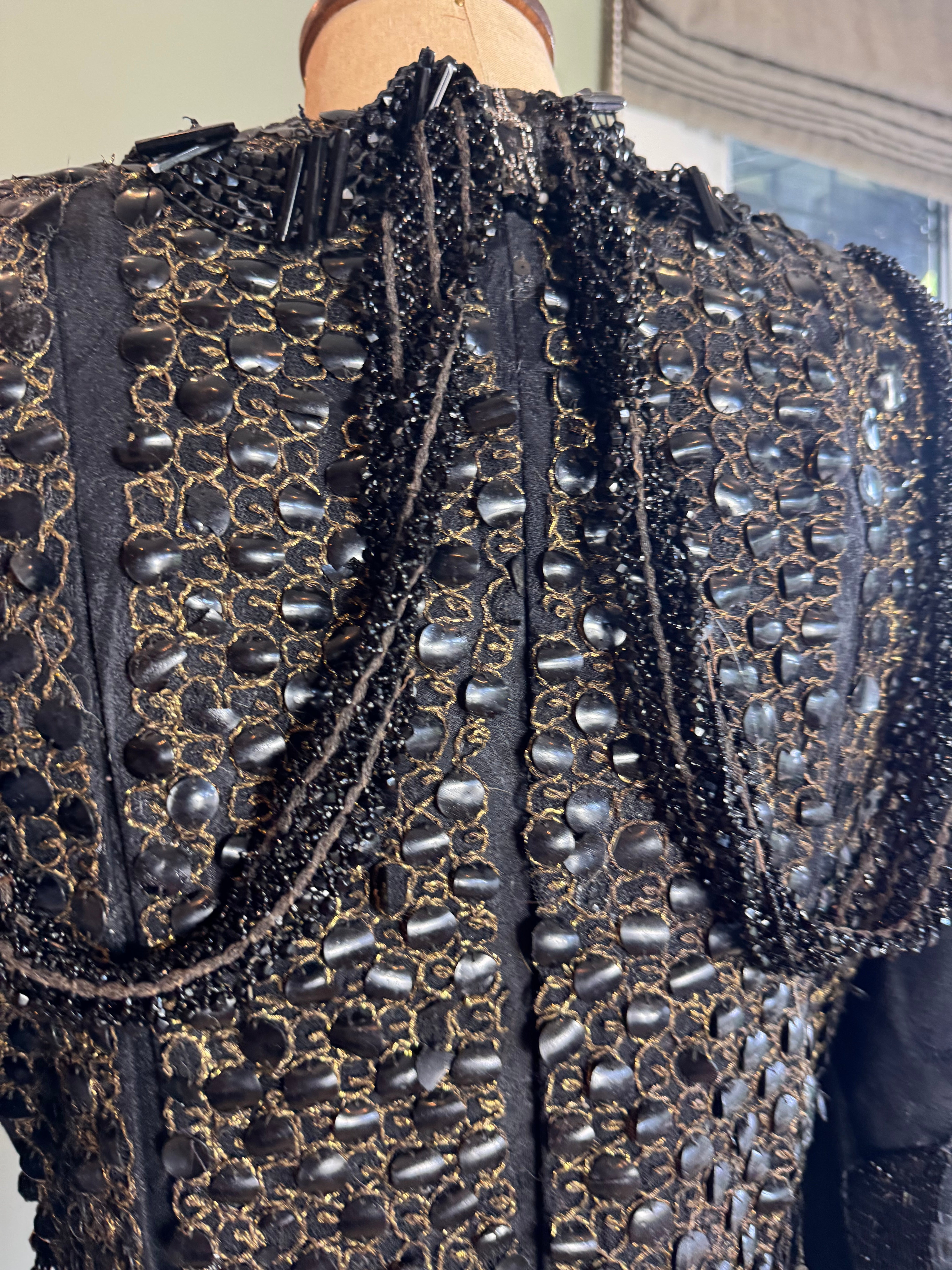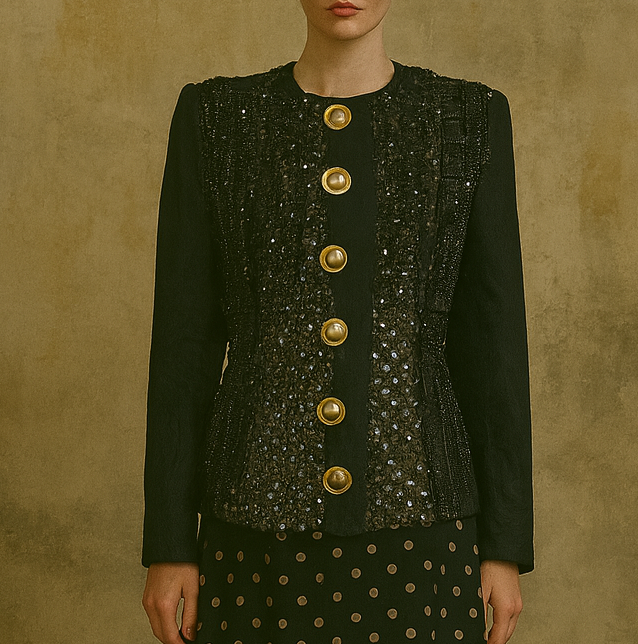 This expertly reworked 1980s silk brocade jacket features a fitted design with long sleeves and a distinctive neckline. Statement gold buttons enhance the front, while blackjet beading and sequinned pleats intricately adorn the body. The back reveals a rare pleated design subtly integrated within the sequins, making this piece truly unique and irreplaceable. Perfect for collectors or those seeking sophisticated vintage elegance with a modern appeal.