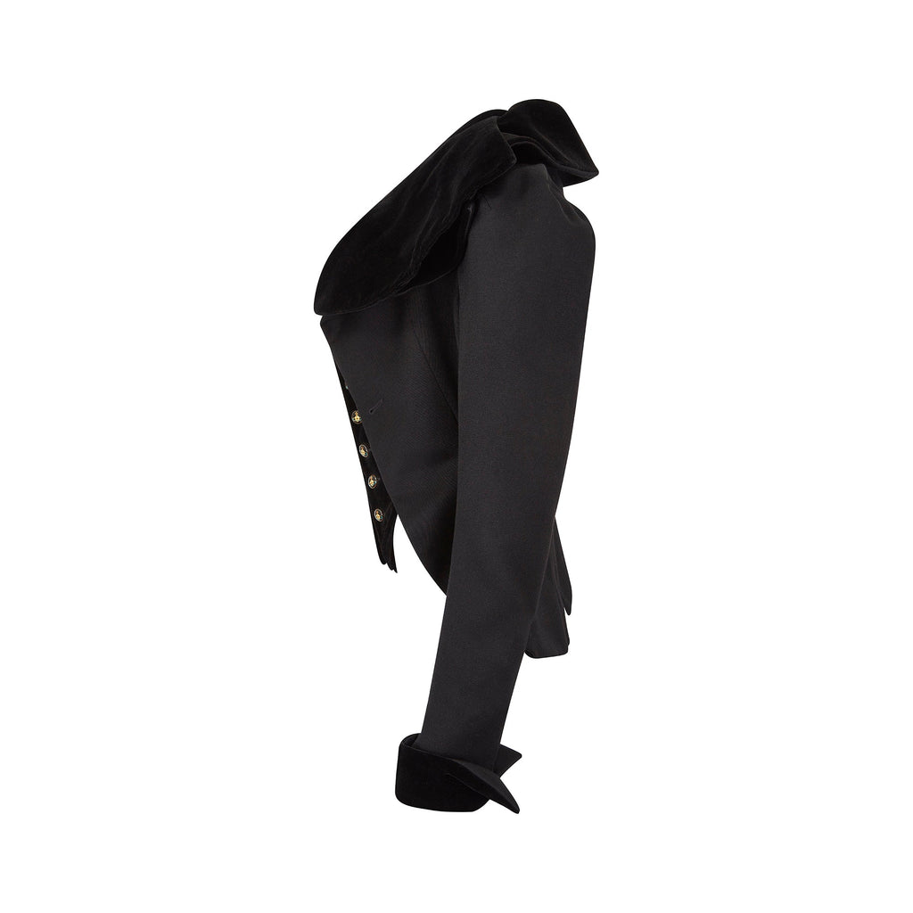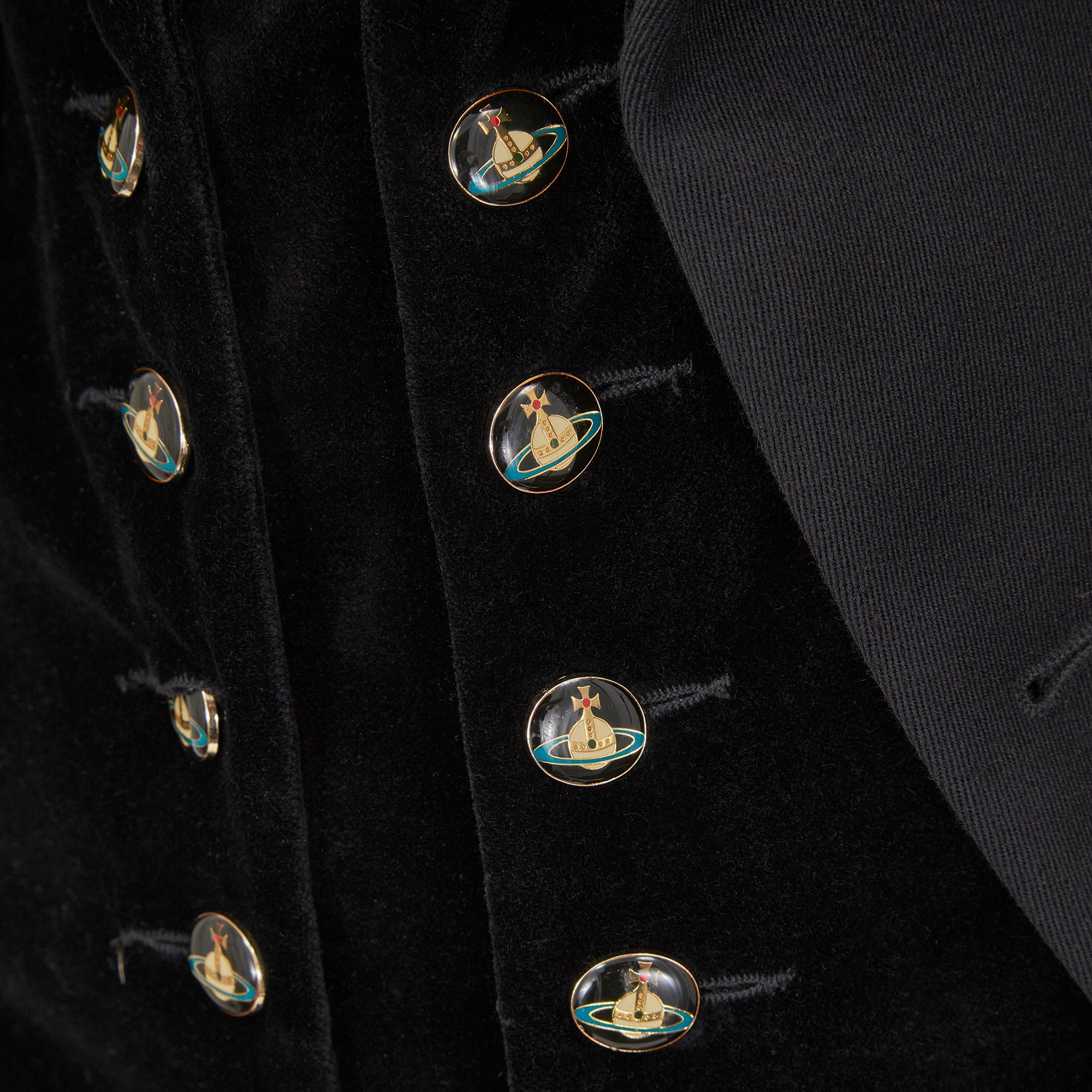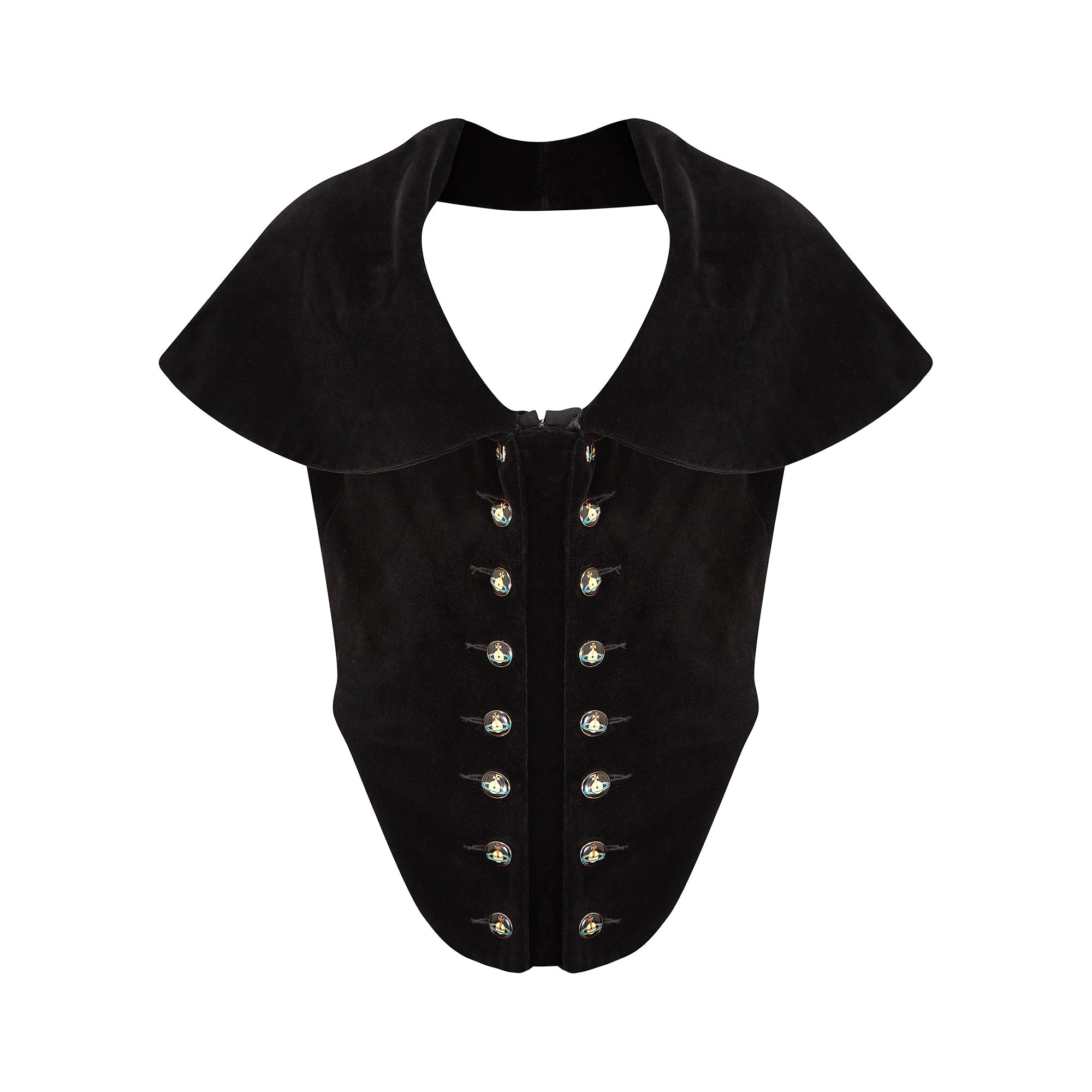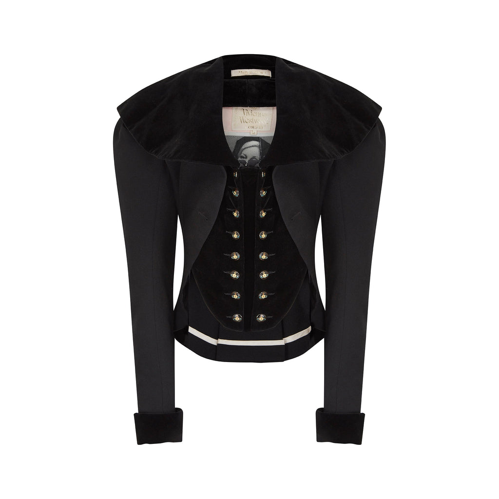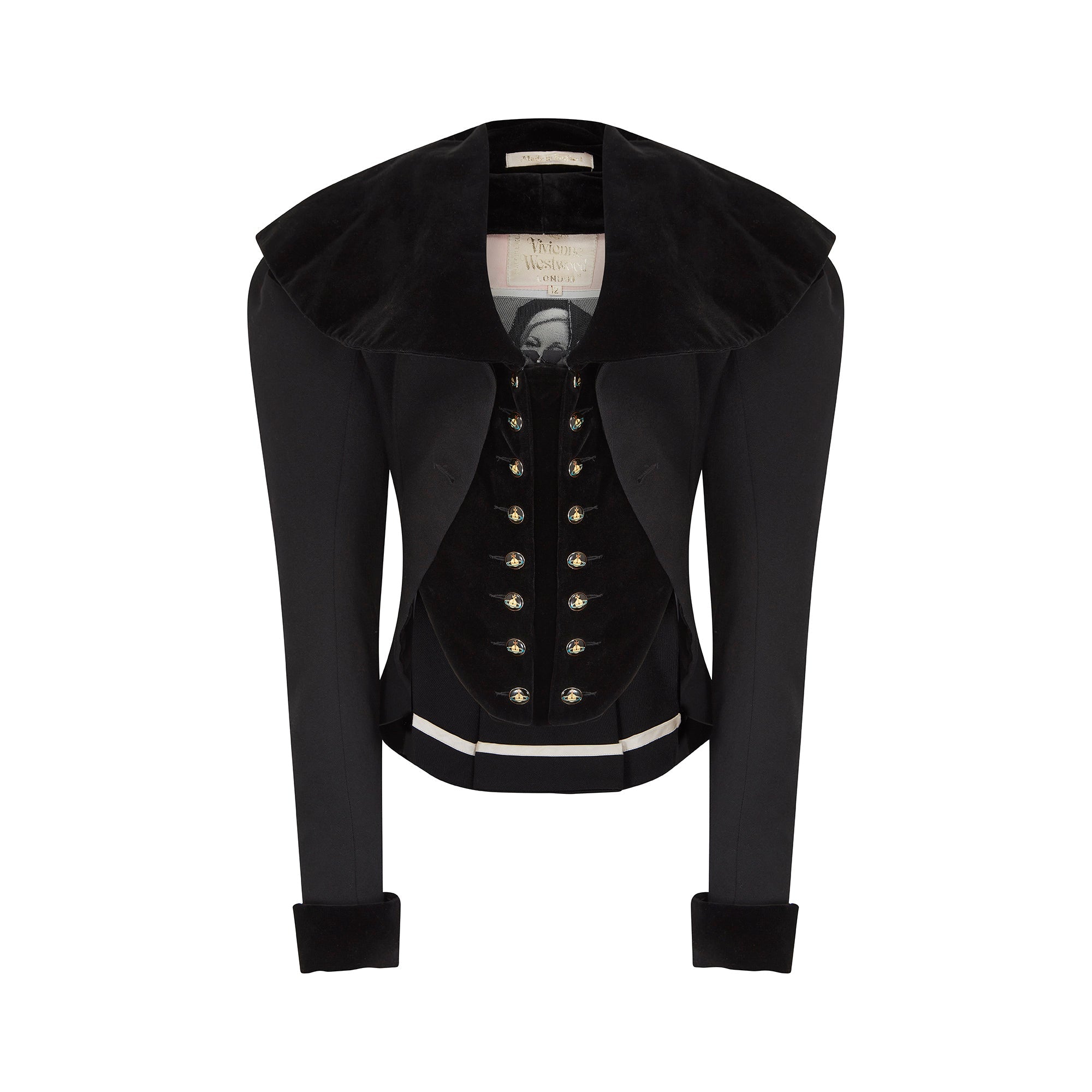 Vivienne Westwood black velvet corseted ensemble, as seen in the Fall/Winter 1995 Vive La Cocotte collection - one of the most iconic shows of her career. Staged at the Carrousel du Louvre in Paris, the show reflected Westwood's interest in 18th century French fashions and culture - an interest which is particularly evident in this velvet set. It features a riding jacket with detachable corseted waist coat, signature orb button fastenings and puff sleeves. The jacket has a beautiful pale pink silk lining, complete with the gold Vivienne Westwood logo label. The inner waistcoat fastens with a central zip and two rows of black and gold orb buttons in a thick, structured velvet, complete with statement collar. The jacket is cropped in a flattering silhouette, with two pleats to the back and velvet trim cuffs. The shoulders are gathered and slightly puffed to create a traditional French riding jacket shape.