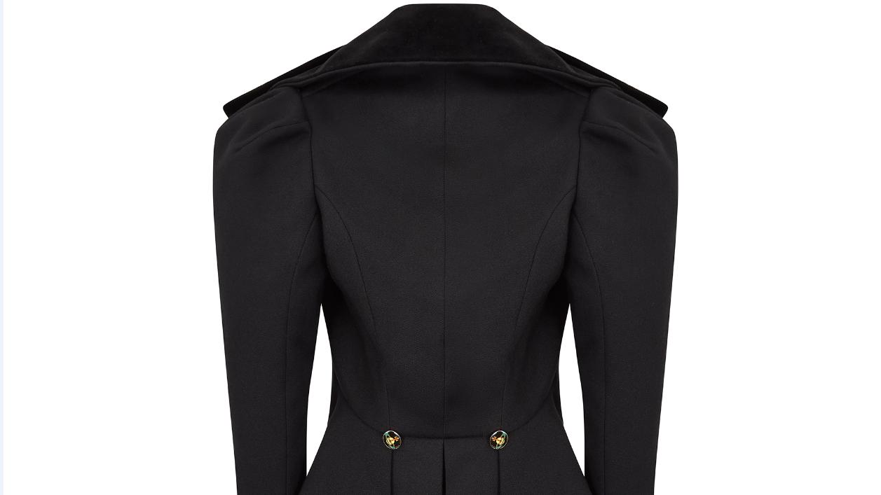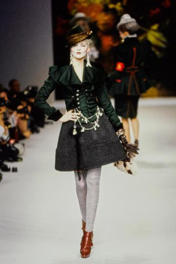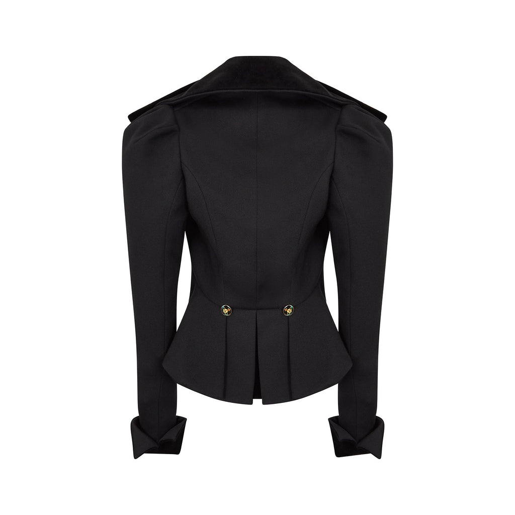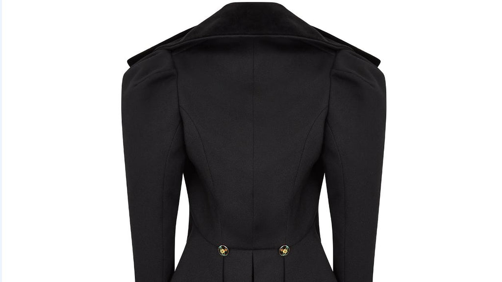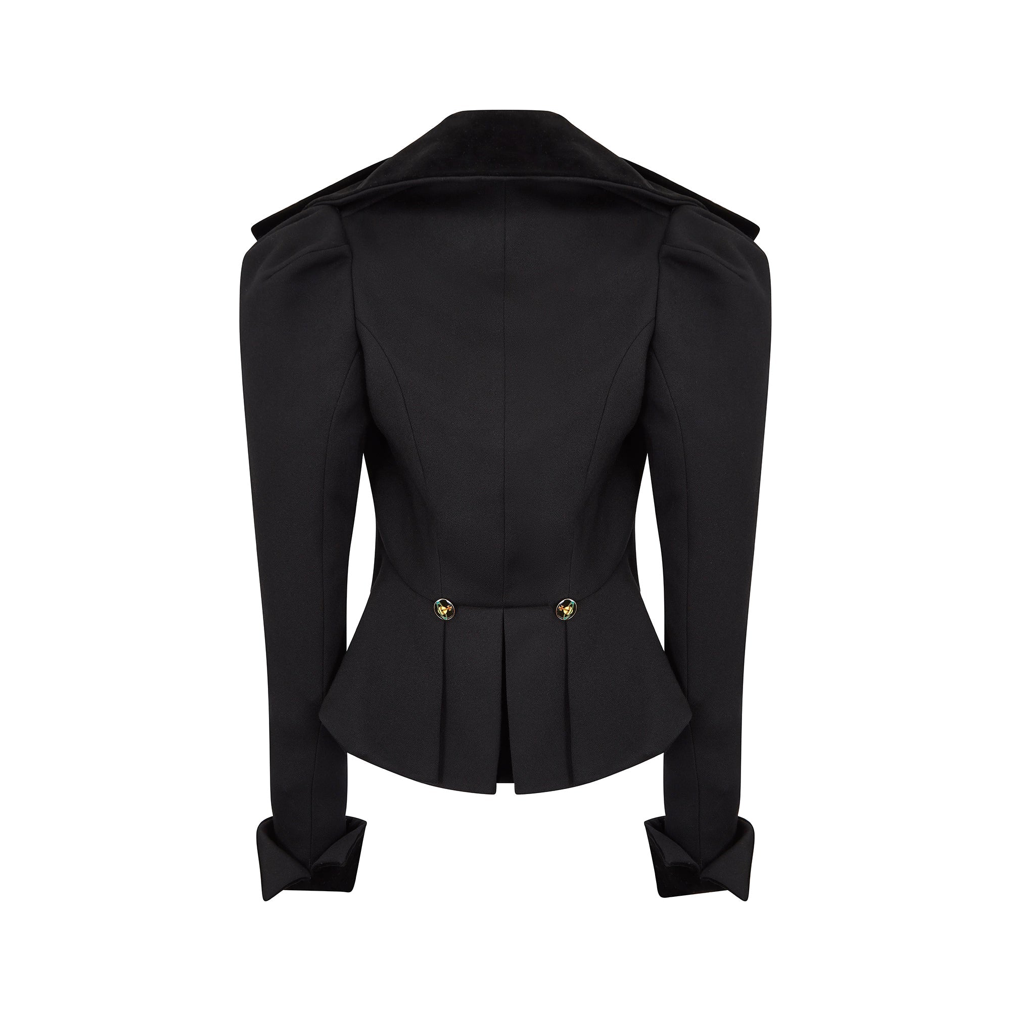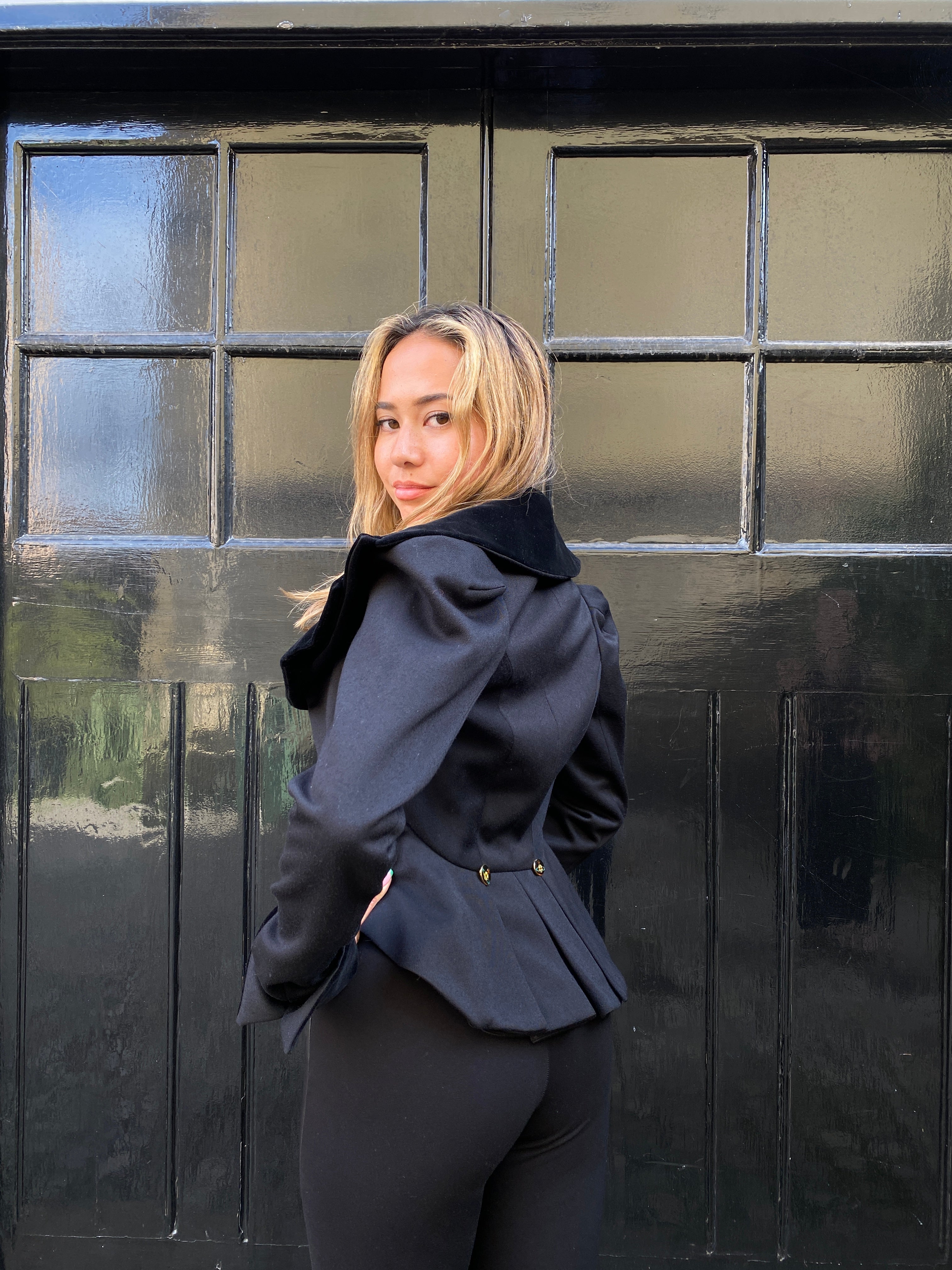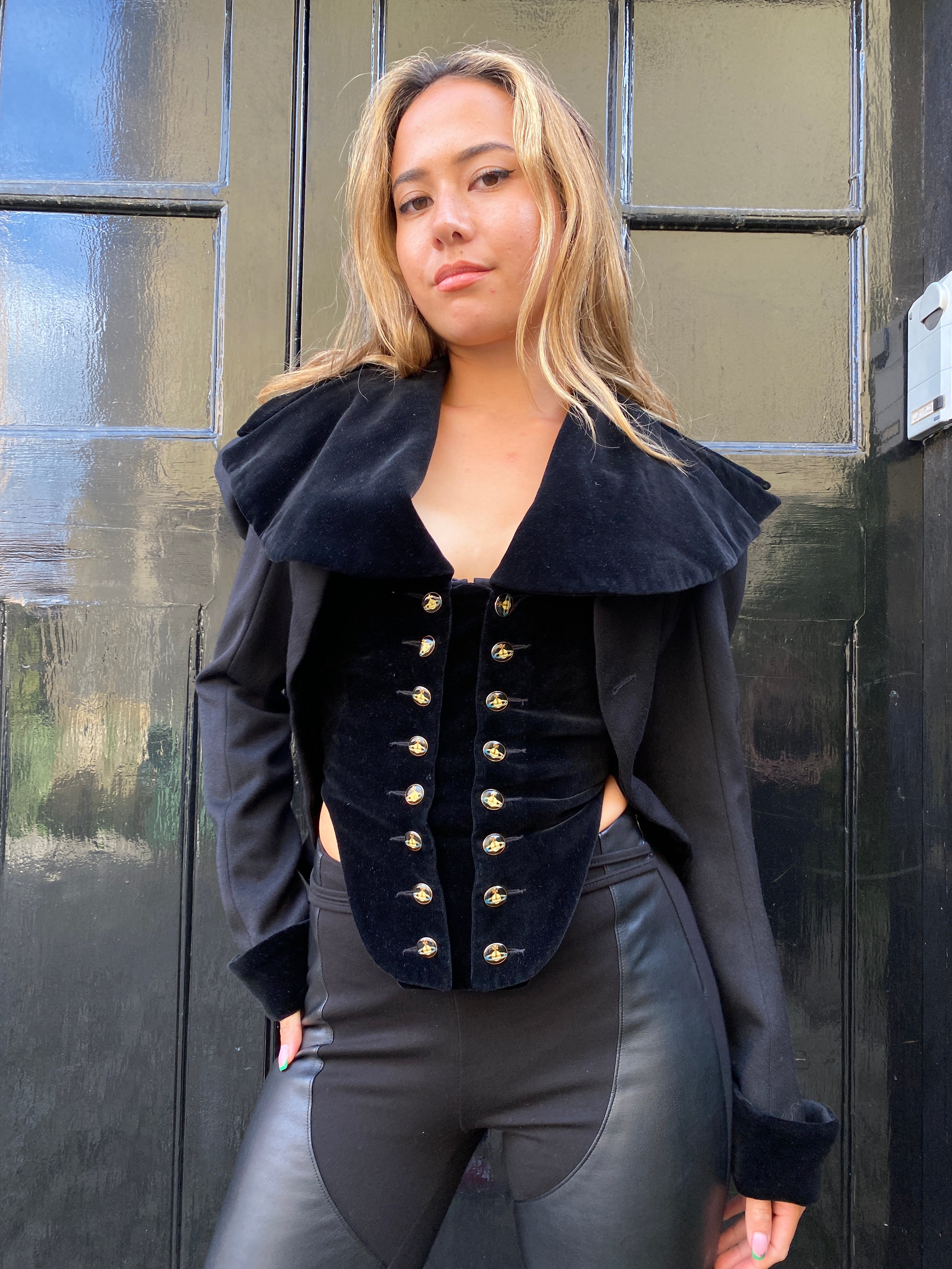 Vivienne Westwood black velvet corseted ensemble, as seen in the Fall/Winter 1995 Vive La Cocotte collection - one of the most iconic shows of her career. Staged at the Carrousel du Louvre in Paris, the show reflected Westwood's interest in 18th century French fashions and culture - an interest which is particularly evident in this velvet set. It features a riding jacket with detachable corseted waist coat, signature orb button fastenings and puff sleeves. The jacket has a beautiful pale pink silk lining, complete with the gold Vivienne Westwood logo label. The inner waistcoat fastens with a central zip and two rows of black and gold orb buttons in a thick, structured velvet, complete with statement collar. The jacket is cropped in a flattering silhouette, with two pleats to the back and velvet trim cuffs. The shoulders are gathered and slightly puffed to create a traditional French riding jacket shape.